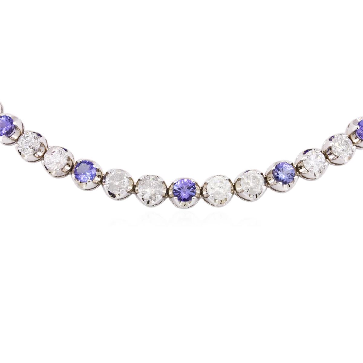 One electronically tested 14KT white gold ladies combination cast & assembled tanzanite and diamond necklace with a bright polish finish. Measurements: 17" in length. Identified with markings of "14K". Condition is new. Containing: Forty-eight prong set round modified brilliant cut natural tanzanites, measuring 5.00 - 5.00 x 3.25 mm, approximate total weight of 25.92ct., clarity is eye clean, type I, medium, very slightly grayish, violet color, (GIA V 5/3), cut is good. Ten prong set round brilliant cut diamonds, measuring 5.30 - 5.30 x 3.18mm (depth est.) approximate total weight of 10 Stones = 5.45ct. Clarity: I-2 to I-3. Color: H - I, Cut is Good. Colored gemstones are presumed to have been subjected to commonly used enhancement processes. All diamonds and colored gemstones are graded in the mounting, unless otherwise stated. Total Weight of Colored Stones 25.92ct. Total Weight of Diamonds 5.45ct. Total Weight of Necklace 46.39 grams. GGL Appraised at $47,780.00.