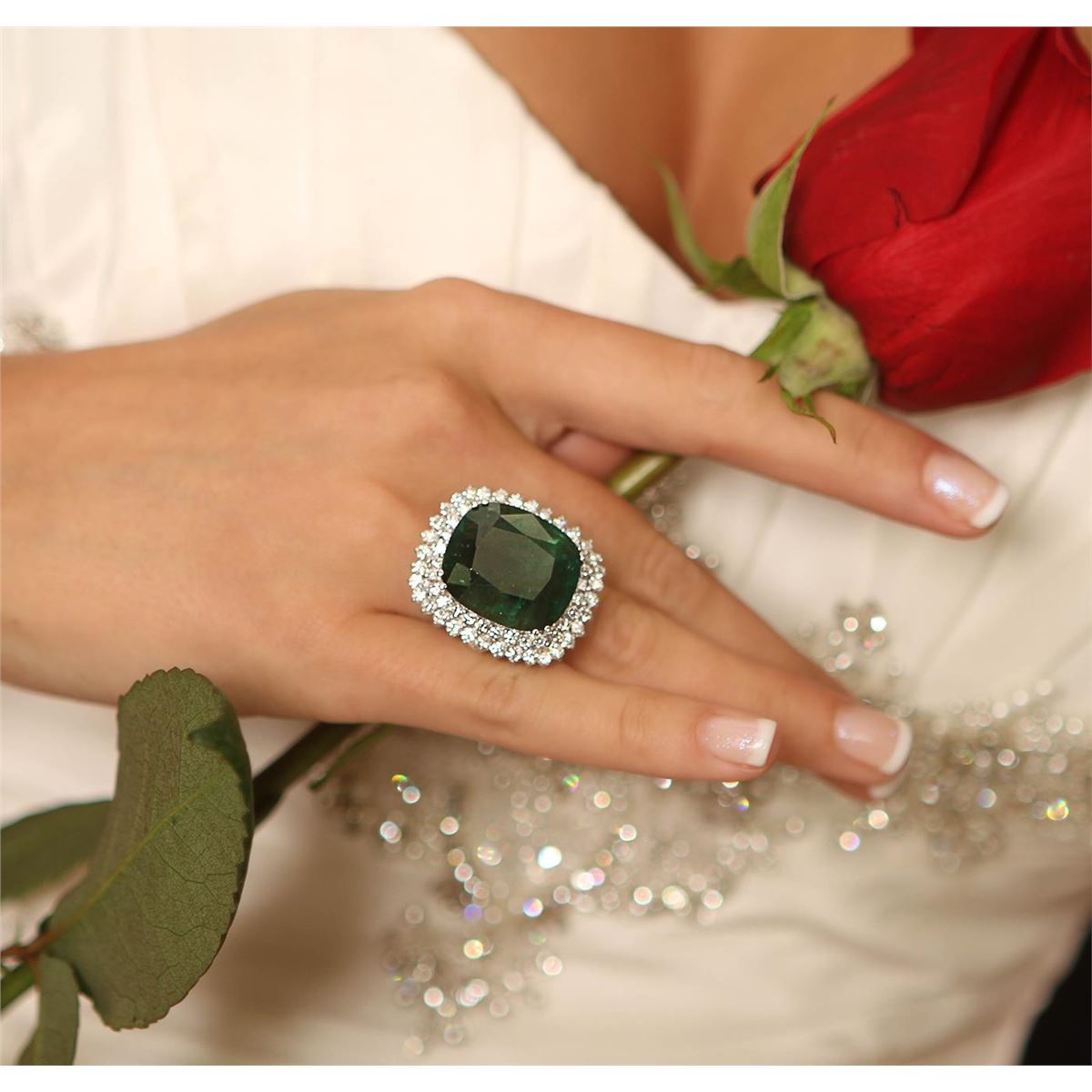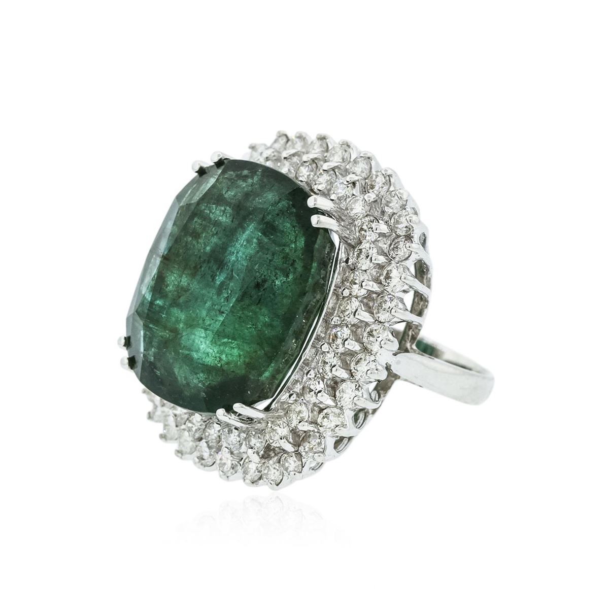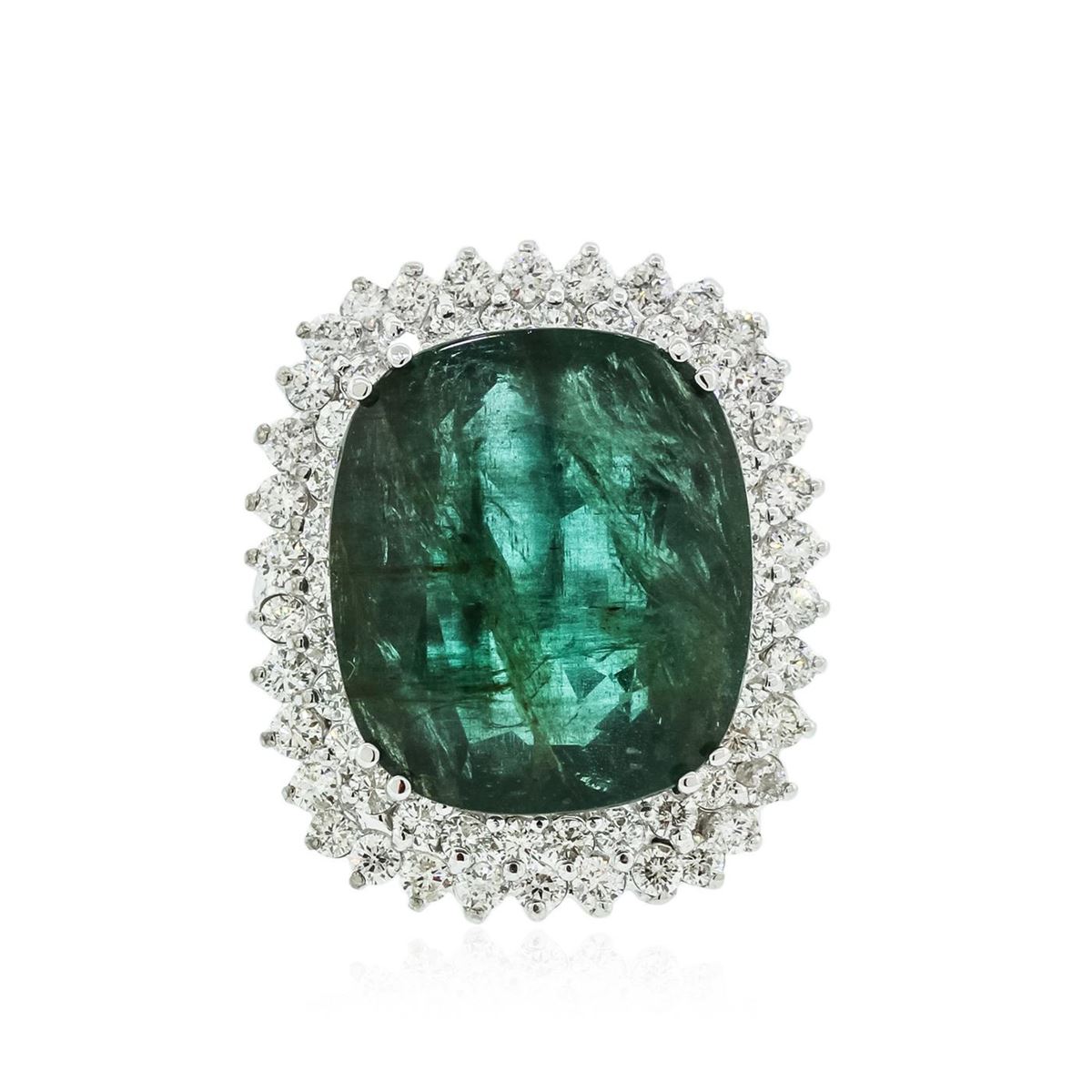 One electronically tested 14KT white gold Ladies combination cast & assembled ring with a bright polish finish. Condition is new. Identified with markings of "14K". Containing: One prong set rectangular cushion modified brilliant cut natural emerald, measuring 20.50 x 17.50 x 11.50mm, approximate weight of 26.37ct., clarity is heavily included, type III, medium dark, very slightly grayish, green color, (GIA G 6/3), cut is good. Colored gemstones are presumed to have been subjected to commonly used and possible undetectable color/clarity enhancement processes. Sixty-Four prong set round brilliant cut diamonds, measuring 2.30 - 2.30 x 1.38mm (depth est.) approximate total weight of 64 Stones = 2.85ct. Clarity of SI-1 to SI-2, Color of I - J, Cut is Good. Thirty-Two prong set round brilliant cut diamonds, measuring 1.20 - 1.20 x 0.72mm (depth est.) approximate total weight of 32 Stones = 0.20ct. Clarity of I-1 to I-2, Color of H - I, Cut is Good. Total Weight of Colored Stones 26.37ct. Total Weight of Diamonds 3.05ct. Total Weight of Ring 15.70gm. GGL Appraised at $67,255.00.