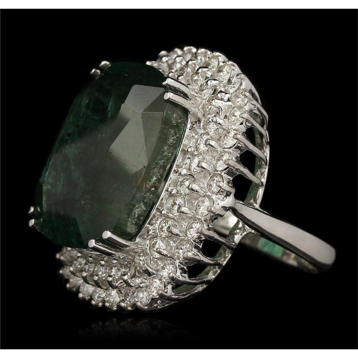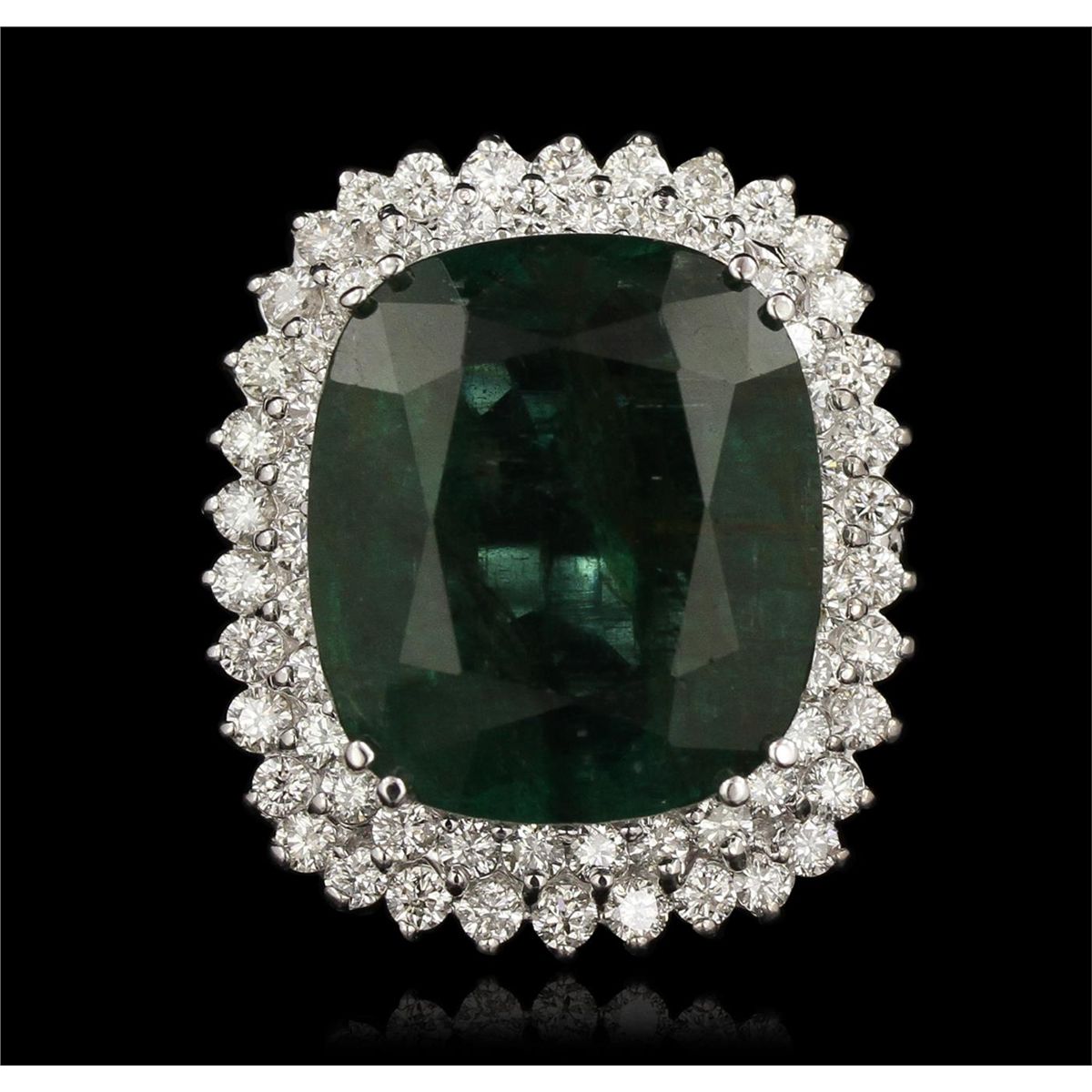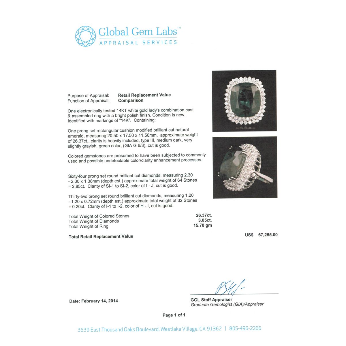 One electronically tested 14KT white gold Ladies combination cast & assembled ring with a bright polish finish. Condition is new. Identified with markings of "14K". Containing: One prong set rectangular cushion modified brilliant cut natural emerald, measuring 20.50 x 17.50 x 11.50mm, approximate weight of 26.37ct., clarity is heavily included, type III, medium dark, very slightly grayish, green color, (GIA G 6/3), cut is good. Colored gemstones are presumed to have been subjected to commonly used and possible undetectable color/clarity enhancement processes. Sixty-Four prong set round brilliant cut diamonds, measuring 2.30 - 2.30 x 1.38mm (depth est.) approximate total weight of 64 Stones = 2.85ct. Clarity of SI-1 to SI-2, Color of I - J, Cut is Good. Thirty-Two prong set round brilliant cut diamonds, measuring 1.20 - 1.20 x 0.72mm (depth est.) approximate total weight of 32 Stones = 0.20ct. Clarity of I-1 to I-2, Color of H - I, Cut is Good. Total Weight of Colored Stones 26.37ct. Total Weight of Diamonds 3.05ct. Total Weight of Ring 15.70gm. GGL Appraised at $67,255.00.