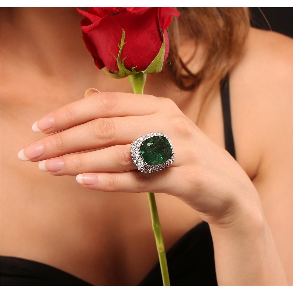 One electronically tested 14KT white gold Ladies combination cast & assembled ring with a bright polish finish. Condition is new. Identified with markings of "14K". Containing: One prong set rectangular cushion modified brilliant cut natural emerald, measuring 20.50 x 17.50 x 11.50mm, approximate weight of 26.37ct., clarity is heavily included, type III, medium dark, very slightly grayish, green color, (GIA G 6/3), cut is good. Colored gemstones are presumed to have been subjected to commonly used and possible undetectable color/clarity enhancement processes. Sixty-Four prong set round brilliant cut diamonds, measuring 2.30 - 2.30 x 1.38mm (depth est.) approximate total weight of 64 Stones = 2.85ct. Clarity of SI-1 to SI-2, Color of I - J, Cut is Good. Thirty-Two prong set round brilliant cut diamonds, measuring 1.20 - 1.20 x 0.72mm (depth est.) approximate total weight of 32 Stones = 0.20ct. Clarity of I-1 to I-2, Color of H - I, Cut is Good. Total Weight of Colored Stones 26.37ct. Total Weight of Diamonds 3.05ct. Total Weight of Ring 15.70gm. GGL Appraised at $67,255.00.
