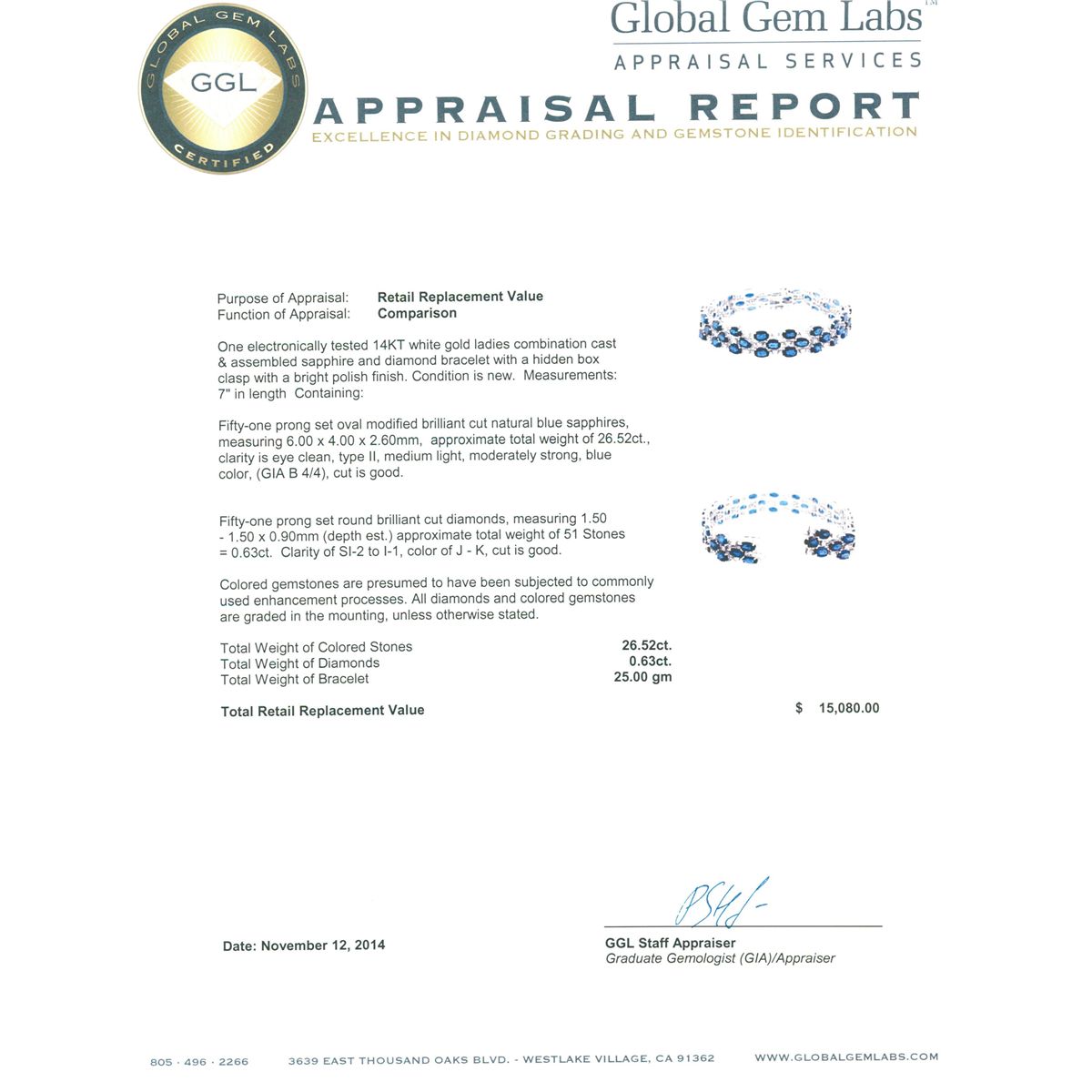 One electronically tested 14KT white gold ladies combination cast & assembled sapphire and diamond bracelet with a hidden box clasp with a bright polish finish. Measurements: 7" in length Condition is new. Containing: Fifty-one prong set oval modified brilliant cut natural blue sapphires, measuring 6.00 x 4.00 x 2.60mm, approximate total weight of 26.52ct., clarity is eye clean, type II, medium light, moderately strong, blue color, (GIA B 4/4), cut is good. Fifty-One prong set round brilliant cut diamonds, measuring 1.50 - 1.50 x 0.90mm (depth est.) approximate total weight of 51 Stones = 0.63ct. Clarity: SI-2 to I-1. Color: J - K, Cut is Good. Colored gemstones are presumed to have been subjected to commonly used enhancement processes. All diamonds and colored gemstones are graded in the mounting, unless otherwise stated. Total Weight of Colored Stones 26.52ct. Total Weight of Diamonds 0.63ct. Total Weight of Bracelet 25.00 grams. GGL Appraised at $15,080.00.