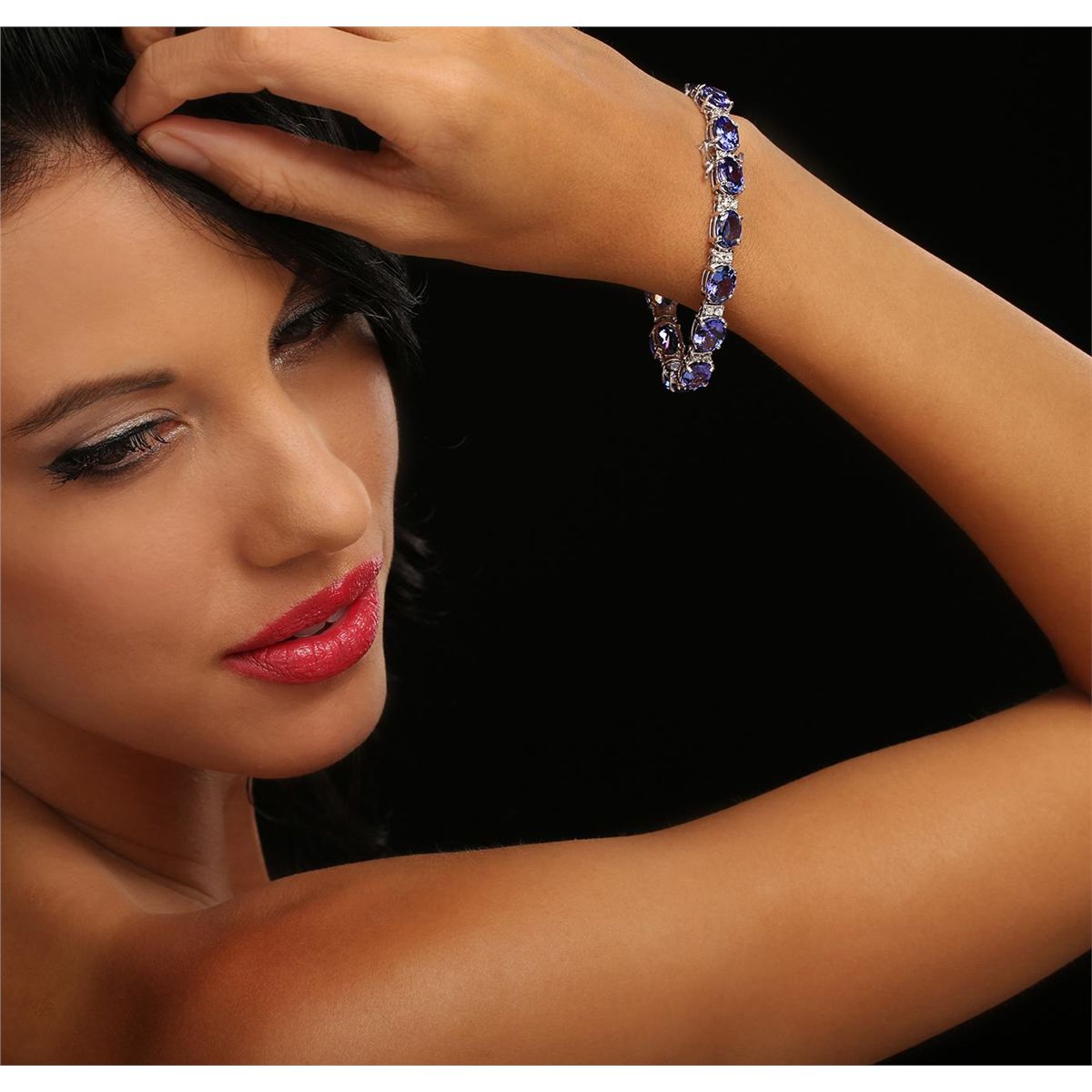 One electronically tested 14KT white gold ladies cast & assembled tanzanite and diamond bracelet with a bright polish finish. Six and three-quarter inch length bracelet features a flexible tanzanite and diamond ribbon, terminating in a concealed clasp with safety. Identified with markings of "14K". Condition is new, good workmanship. Containing: Fourteen prong set oval mixed cut natural tanzanites, measuring 9.00. x 7.00. x 4.50mm, approximate total weight of 27.12ct., clarity is eye clean, type I, medium dark, very slightly grayish, violetish blue color, (GIA vB 6/3), cut is good. Transmitting light with no distortion, transparent. Measurements & the color grade are an average for the group. Graded in the setting. Tennis bracelets & necklaces got their unusual name from an incident involving the U.S. professional tennis player Chris Evert during a tennis match in the 1980's. Evert had been wearing an expensive diamond bracelet, an inline string of individually-set diamonds. Previously these bracelets were known as eternity bracelets. When the clasp snapped during play, she asked the officials to stop the tennis match until the bracelet could be found. Since that day, bracelets and necklaces featuring an inline string of diamonds have been called tennis bracelets and tennis necklaces. Twenty-Eight prong set round brilliant cut diamonds, measuring 1.90 - 1.80 x 1.11mm (depth est.) approximate total weight of 28 Stones = 0.74ct. Graded in the setting. Clarity: SI-2 to I-2 . Color: G - I. Total Weight of Colored Stones 27.12ct. Total Weight of Diamonds 0.74ct. Total Weight of Bracelet 19.16 grams. AIG Appraised at $22,635.00.