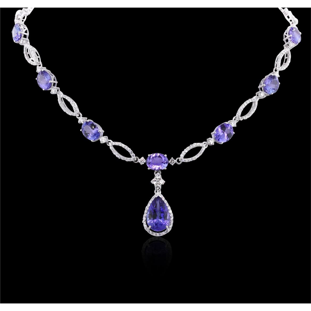 One necklace featuring: 14KT white gold weighing 25.00 grams containing one tanzanite center stone with a total weight of 8.77cts, seven tanzanite side stones with a total weight of 18.43cts, and round cut diamonds with a total weight of 3.98cts.