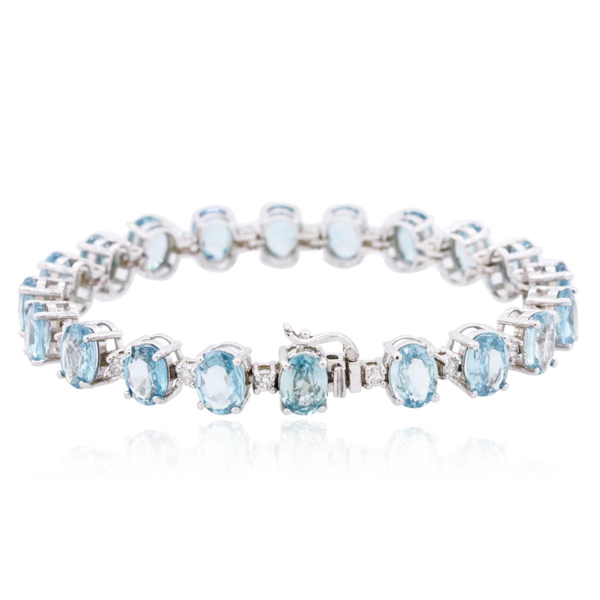 One electronically tested 14KT white gold ladies cast topaz and diamond bracelet with a hidden box clasp with a bright polish finish. Measurements: 7" in length. Identified with markings of "14K". Condition is new. Containing: Twenty prong set oval modified brilliant cut natural blue topazes, measuring 8.00 x 6.00 x 3.90mm, approximate total weight of 27.80ct., clarity is eye clean, type I, medium light, very slightly grayish, blue color, (GIA B 4/3), cut is good. Twenty prong set round brilliant cut diamonds, measuring 2.20 - 2.20 x 1.32mm (depth est.) approximate total weight of 20 Stones = 0.78ct. Clarity: I-1. Color: H - I, Cut is Good. Colored gemstones are presumed to have been subjected to commonly used enhancement processes. All diamonds and colored gemstones are graded in the mounting, unless otherwise stated. Total Weight of Colored Stones 27.80ct. Total Weight of Diamonds 0.78ct. Total Weight of Bracelet 22.40 grams. GGL Appraised at $8,965.00.
