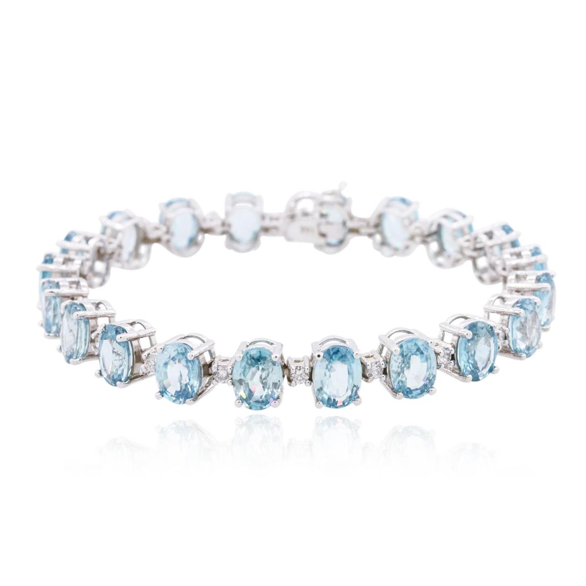One electronically tested 14KT white gold ladies cast topaz and diamond bracelet with a hidden box clasp with a bright polish finish. Measurements: 7" in length. Identified with markings of "14K". Condition is new. Containing: Twenty prong set oval modified brilliant cut natural blue topazes, measuring 8.00 x 6.00 x 3.90mm, approximate total weight of 27.80ct., clarity is eye clean, type I, medium light, very slightly grayish, blue color, (GIA B 4/3), cut is good. Twenty prong set round brilliant cut diamonds, measuring 2.20 - 2.20 x 1.32mm (depth est.) approximate total weight of 20 Stones = 0.78ct. Clarity: I-1. Color: H - I, Cut is Good. Colored gemstones are presumed to have been subjected to commonly used enhancement processes. All diamonds and colored gemstones are graded in the mounting, unless otherwise stated. Total Weight of Colored Stones 27.80ct. Total Weight of Diamonds 0.78ct. Total Weight of Bracelet 22.40 grams. GGL Appraised at $8,965.00.