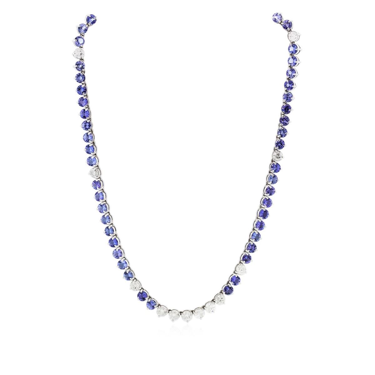 One electronically tested 14KT white gold Ladies combination cast & assembled necklace with a hidden box clasp with a bright polish finish. Condition is new. Measurements: 16.5" in length. Identified with markings of "14K". Containing: Fifty-eight prong set round modified brilliant cut natural tanzanites, measuring 4.80 - 4.80 x 3.12 mm, approximate. Total Weight of 27.84ct., clarity is eye clean, type I, medium light, very slightly grayish, bluish violet color, (GIA bV 4/3), cut is good. Twelve prong set round brilliant cut diamonds, measuring 5.30 - 5.30 x 3.18mm (depth est.) approximate. Total Weight of 12 Stones = 6.54ct. Clarity: I-2 to I-3. Color: I - J, Cut is Good. Colored gemstones are presumed to have been subjected to commonly used enhancement processes. All diamonds and colored gemstones are graded in the mounting, unless otherwise stated. Total Weight of Colored Stones 27.84ct. Total Weight of Diamonds 6.54ct. Total Weight of Necklace 38.20 grams. GGL Appraised at $48,300.00.