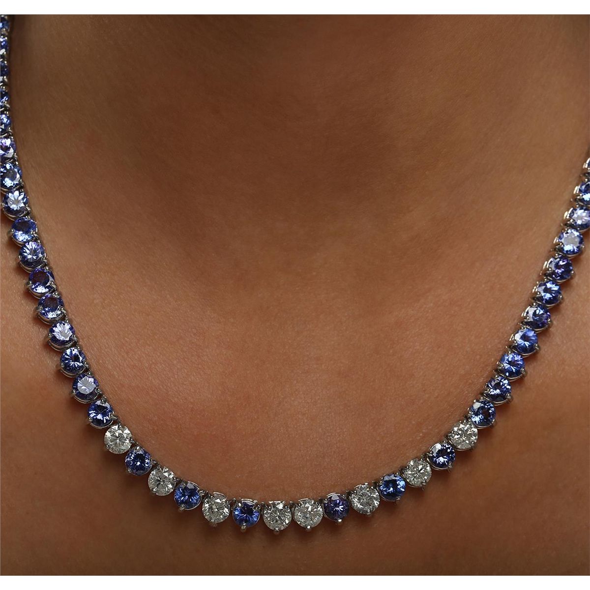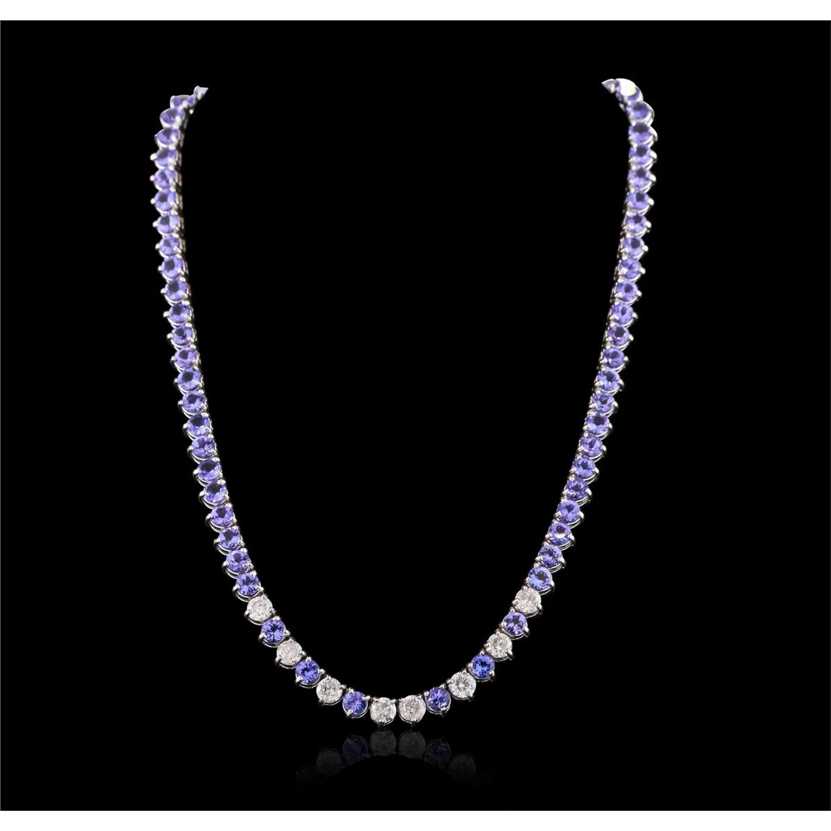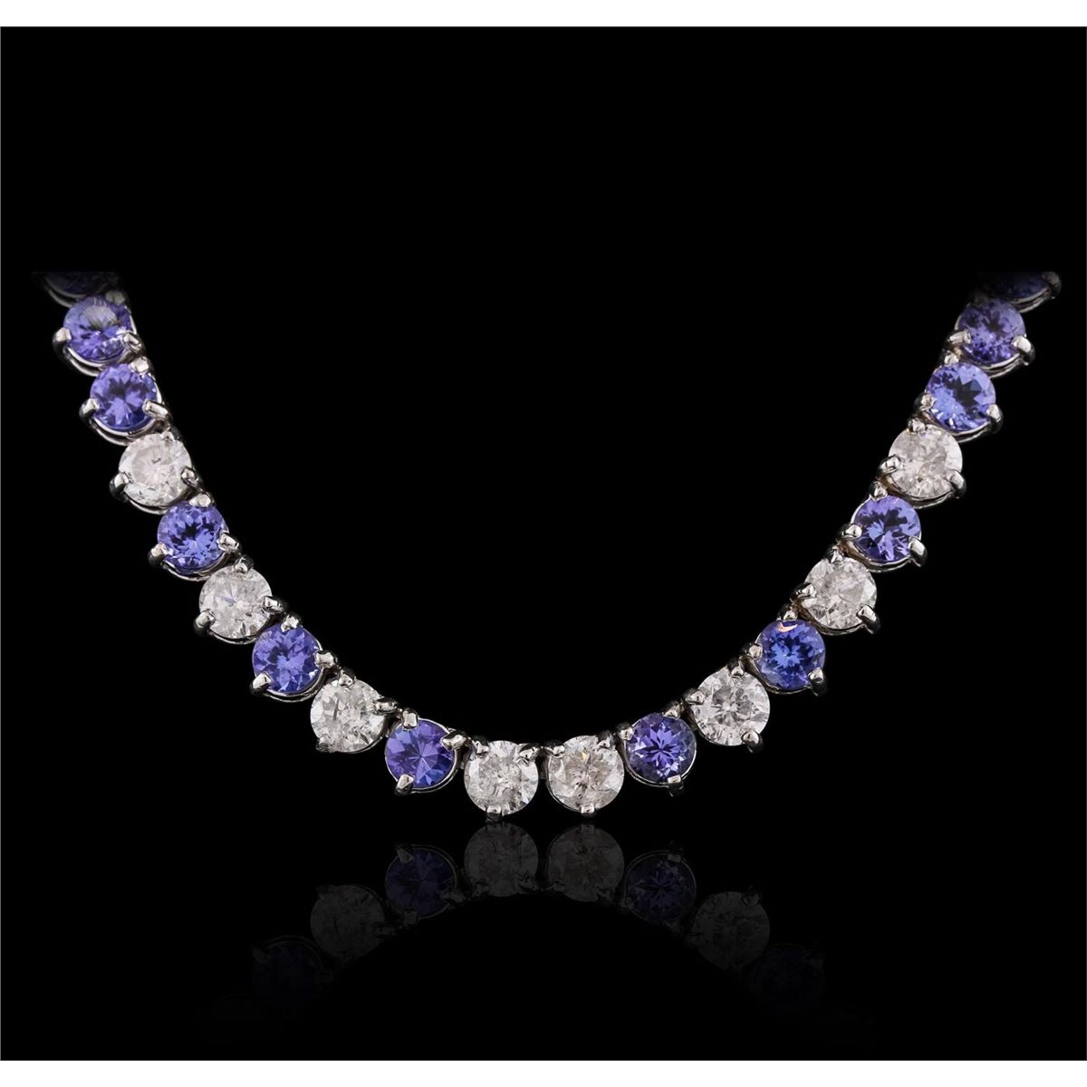 One electronically tested 14KT white gold ladies combination cast & assembled necklace with a hidden box clasp with a bright polish finish. Measurements: 17" in length. Identified with markings of "14K". Condition is new. Containing: Seventy prong set round modified brilliant cut natural tanzanites, measuring 4.50 - 4.50 x 2.93 mm, approximate total weight of 28.00ct., clarity is eye clean, type I, medium light, moderately strong, bluish violet color, (GIA bV 4/4), cut is good. Eight prong set round brilliant cut diamonds, measuring 5.50 - 5.50 x 3.30mm (depth est.) approximate total weight of 8 Stones = 4.87ct. Clarity: I-1 to I-2. Color: I - J, Cut is Good. Colored gemstones are presumed to have been subjected to commonly used enhancement processes. All diamonds and colored gemstones are graded in the mounting, unless otherwise stated. Total Weight of Colored Stones 28.00ct. Total Weight of Diamonds 4.87ct. Total Weight of Necklace 45.50 grams. GGL Appraised at $47,155.00.