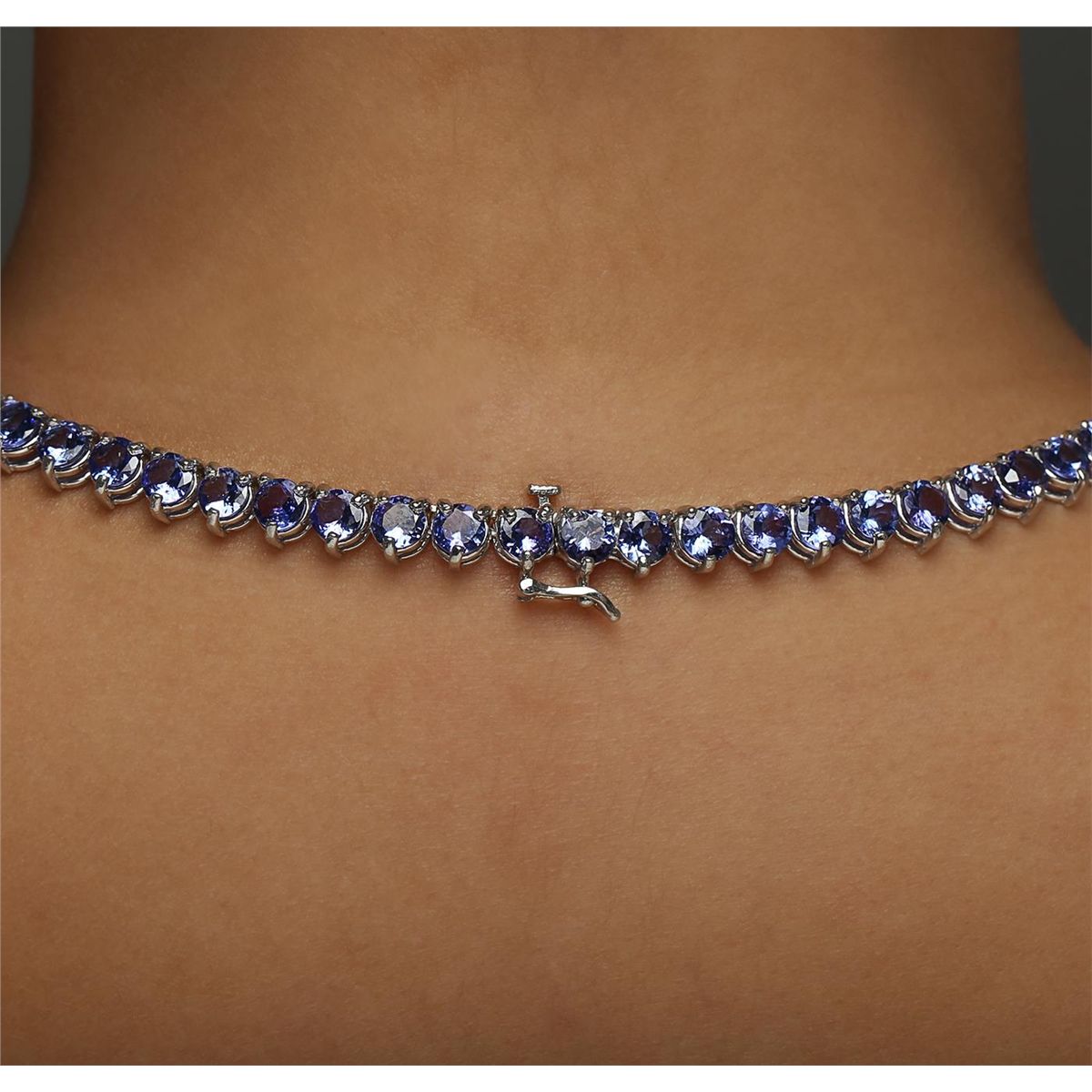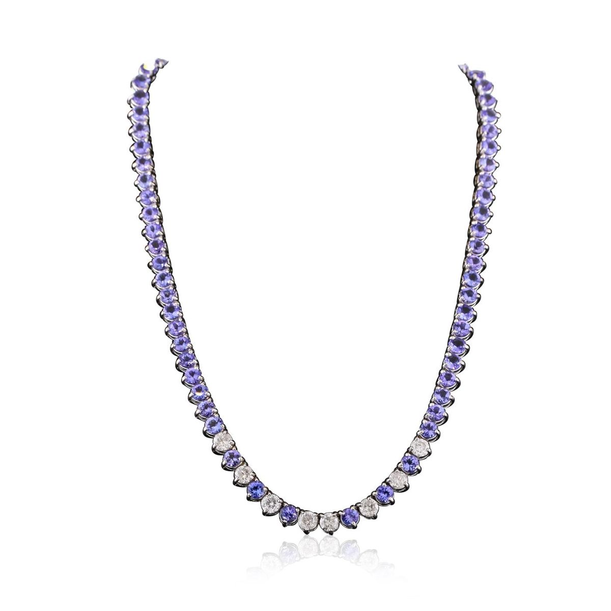 One electronically tested 14KT white gold ladies combination cast & assembled necklace with a hidden box clasp with a bright polish finish. Measurements: 17" in length. Identified with markings of "14K". Condition is new. Containing: Seventy prong set round modified brilliant cut natural tanzanites, measuring 4.50 - 4.50 x 2.93 mm, approximate total weight of 28.00ct., clarity is eye clean, type I, medium light, moderately strong, bluish violet color, (GIA bV 4/4), cut is good. Eight prong set round brilliant cut diamonds, measuring 5.50 - 5.50 x 3.30mm (depth est.) approximate total weight of 8 Stones = 4.87ct. Clarity: I-1 to I-2. Color: I - J, Cut is Good. Colored gemstones are presumed to have been subjected to commonly used enhancement processes. All diamonds and colored gemstones are graded in the mounting, unless otherwise stated. Total Weight of Colored Stones 28.00ct. Total Weight of Diamonds 4.87ct. Total Weight of Necklace 45.50 grams. GGL Appraised at $47,155.00.
