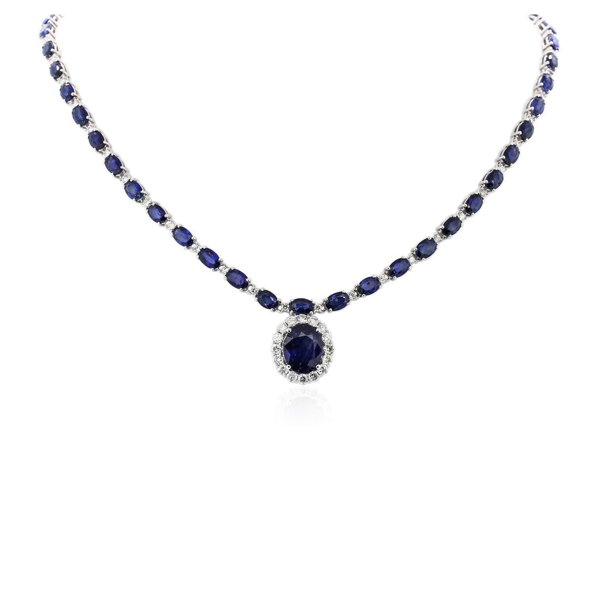One polished, stamped, and electronically tested, solid 14KT white gold "Michael Christoff" designer necklace mounted with: 47 sapphires with a total weight of 28.02ct, and 64 genuine round diamonds with a total weight of 2.37ct. The necklace measures 17 inches in length and is finished with a tension lock & double safety clasps. This item weighs 25.30 grams. Condition is new, excellent workmanship. AIGL Appraised at $30,100.00.