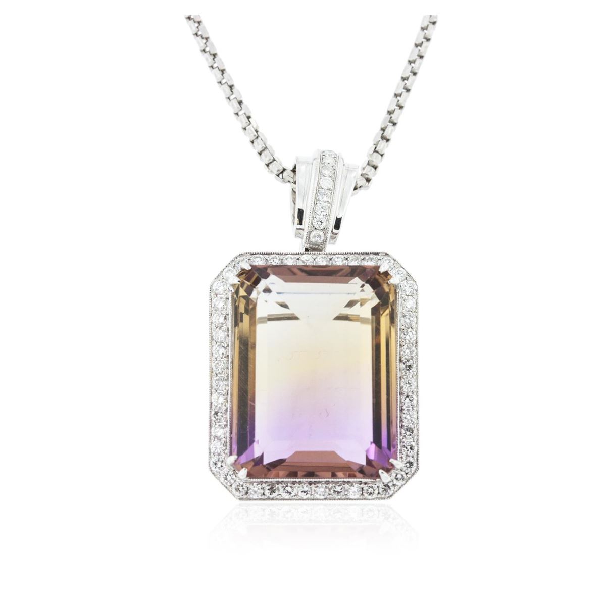 One electronically tested 14KT white gold Ladies combination cast & die struck pendant & chain 17.5" long, medium fancy box link with a lobster claw clasp with a bright polish finish. Condition is new. Identified with markings of "14K". Containing: One prong set emerald standard step cut natural ametrine quartz, measuring 22.07 x 16.60 x 10.80mm, approximate weight of 28.42ct., clarity is eye clean, type I, cut is very good. Colored gemstones are presumed to have been subjected to commonly used color/clarity enhancement processes. Fifty-Nine prong set round brilliant cut diamonds, measuring 1.50 - 1.50 x 0.90mm (depth est.) approximate. Total Weight of 59 Stones = 0.73ct. Clarity: I-1. Color: I - J, Cut is Good. Total Weight of Colored Stones 28.42ct. Total Weight of Diamonds 0.73ct. Total Weight of Pendant & Chain 18.70 grams. GGL Appraised at $10,490.00.