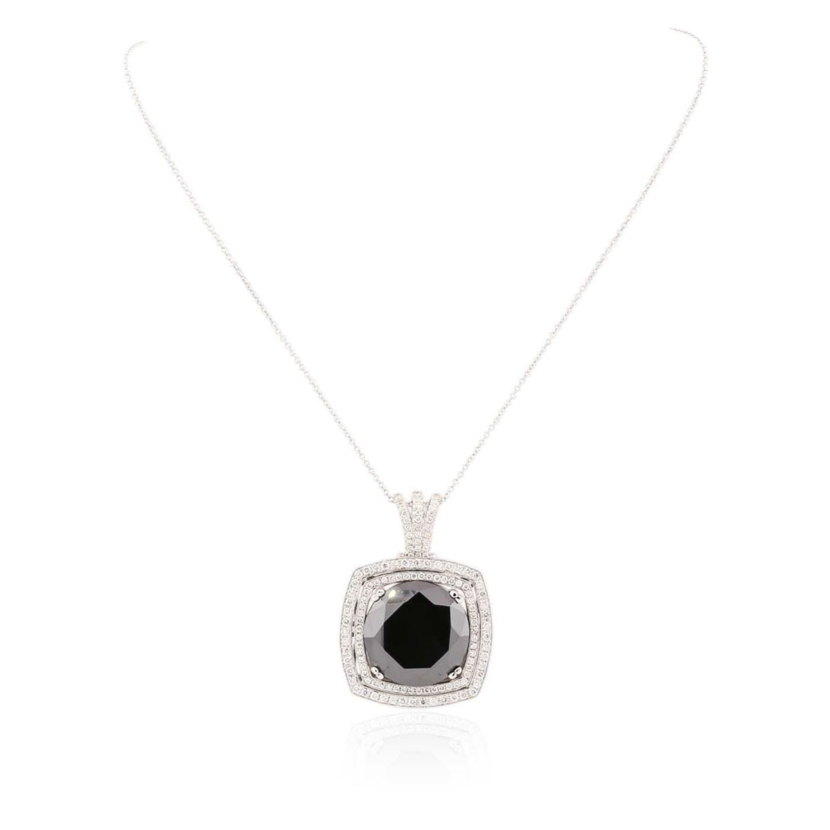One electronically tested 14KT white gold Ladies combination cast & assembled pendant & chain 16.0" long, small cable link with a lobster claw clasp with a bright polish finish. Condition is new. Identified with markings of "14K". Containing: One prong set round brilliant cut diamond, measuring 20.27 - 20.00 x 11.10mm (depth est.) approximate weight of 27.45ct. Cut is Good. The color of the stone has been irradiated. One Hundred Thirty prong set round brilliant cut diamonds, measuring 1.40 - 1.30 x 0.81mm (depth est.) approximate. Total Weight of 130 Stones = 1.17ct. Clarity: I-1 to I-2. Color: I - J, Cut is Good. All diamonds are graded in the mounting, unless otherwise stated. Total Weight of Diamonds 28.62ct. Total Weight of Pendant & Chain 23.70 grams.. GGL Appraised at $35,405.00.