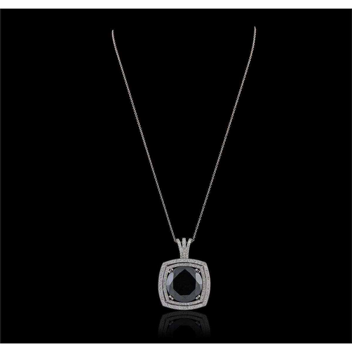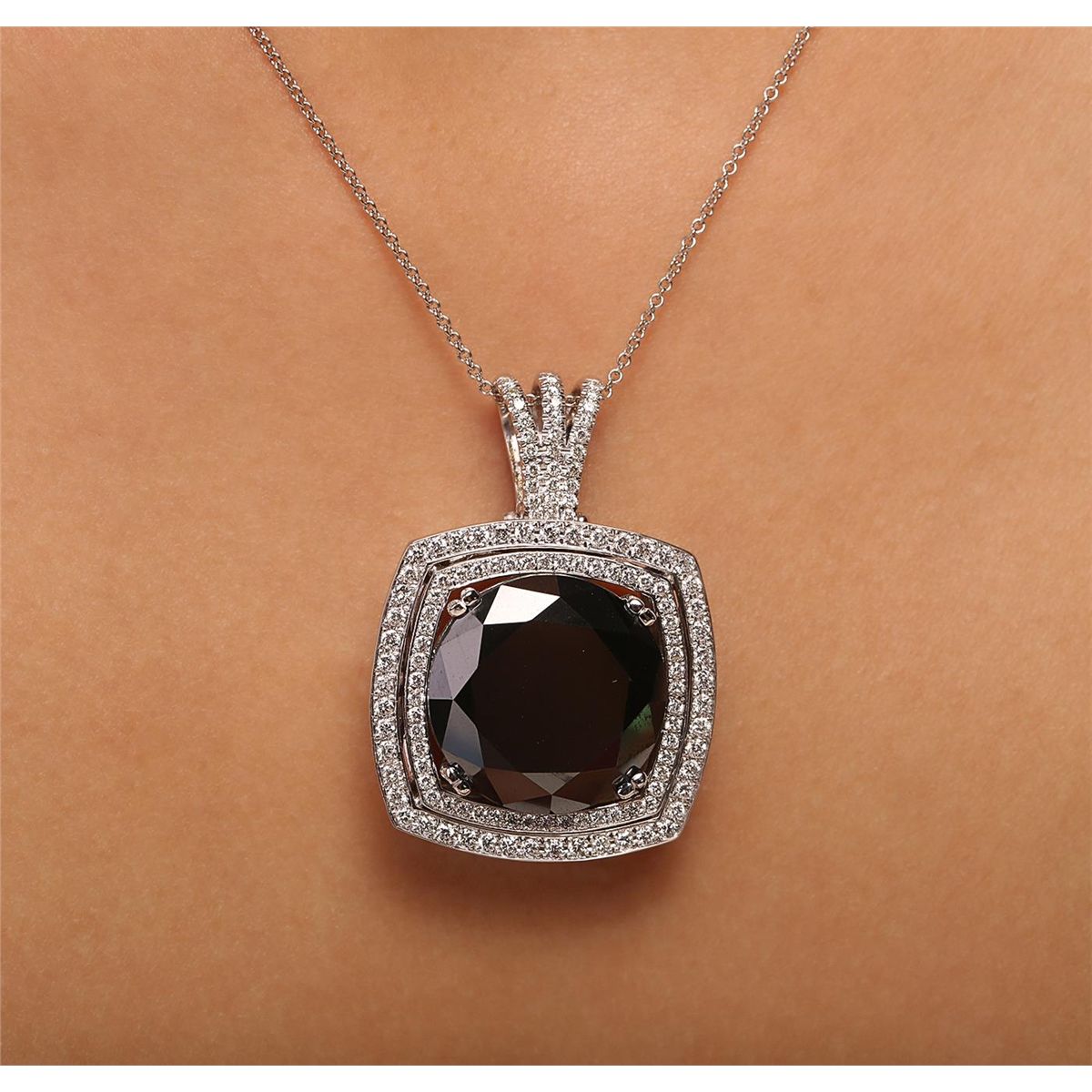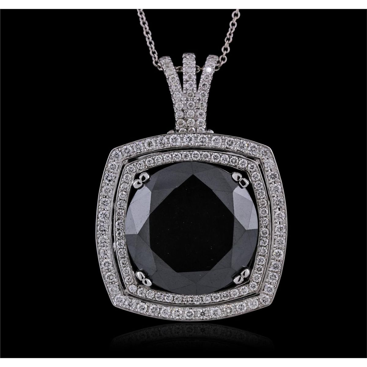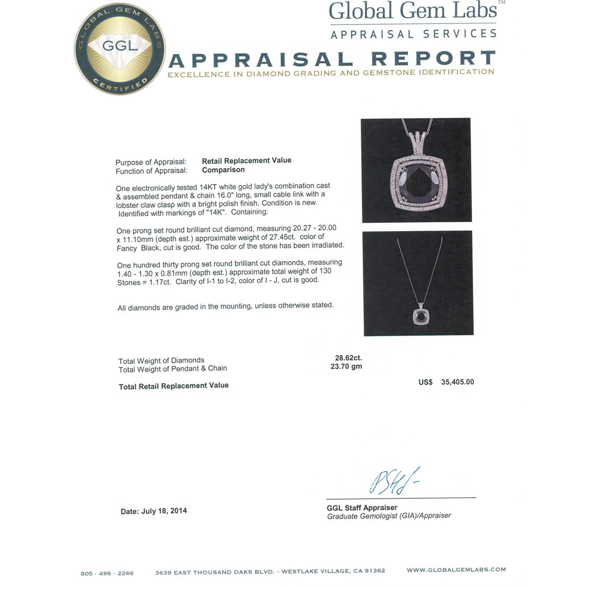 One electronically tested 14KT white gold Ladies combination cast & assembled pendant & chain 16.0" long, small cable link with a lobster claw clasp with a bright polish finish. Condition is new. Identified with markings of "14K". Containing: One prong set round brilliant cut diamond, measuring 20.27 - 20.00 x 11.10mm (depth est.) approximate weight of 27.45ct. Cut is Good. The color of the stone has been irradiated. One Hundred Thirty prong set round brilliant cut diamonds, measuring 1.40 - 1.30 x 0.81mm (depth est.) approximate. Total Weight of 130 Stones = 1.17ct. Clarity: I-1 to I-2. Color: I - J, Cut is Good. All diamonds are graded in the mounting, unless otherwise stated. Total Weight of Diamonds 28.62ct. Total Weight of Pendant & Chain 23.70 grams.. GGL Appraised at $35,405.00.