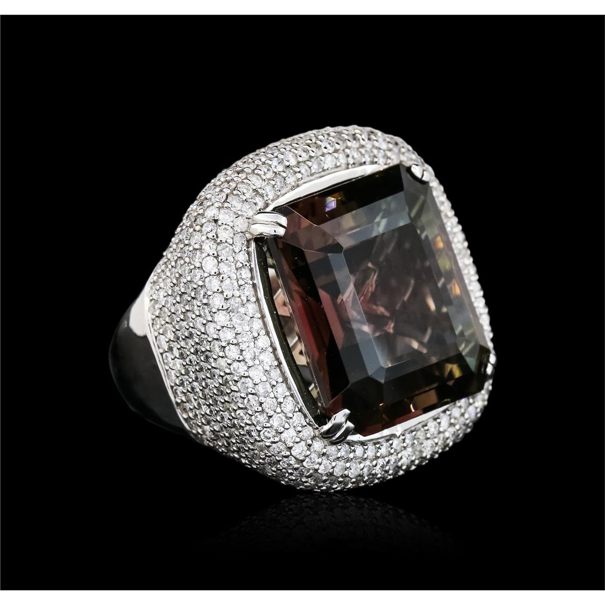 One electronically tested 14KT white gold ladies combination cast & assembled tourmaline and diamond ring with a bright polish finish. Condition is new. Containing: One prong set emerald standard step cut natural bi-color tourmaline, measuring 18.53 x 16.98 x 11.05mm, approximate weight of 28.73ct., clarity is eye clean, type II, dark, moderately strong, yellowish green color, (GIA yG 7/4), cut is good. Five Hundred Sixteen prong set round brilliant cut diamonds, measuring 1.00 - 1.00 x 0.60mm (depth est.) approximate total weight of 516 Stones = 1.86ct. Clarity: I-1 to I-2. Color: I - J, Cut is Good. Colored gemstones are presumed to have been subjected to commonly used enhancement processes. All diamonds and colored gemstones are graded in the mounting, unless otherwise stated. Total Weight of Colored Stones 28.73ct. Total Weight of Diamonds 1.86ct. Total Weight of Ring 22.20 grams. GGL Appraised at $14,015.00.