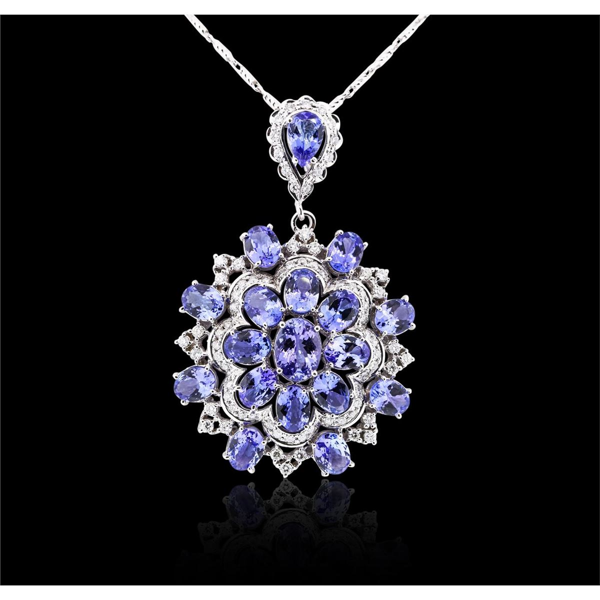 One electronically tested 14KT white gold ladies combination cast & assembled tanzanite and diamond pendant & chain 20.0" long, round link bar with a lobster claw clasp with a bright polish finish. Identified with markings of "K14". Condition is new. Containing: One prong set oval modified brilliant cut natural tanzanite, measuring 10.85 x 8.21 x 5.34mm, approximate weight of 3.35ct., clarity is eye clean, type I, cut is good. One prong set pear modified brilliant cut natural tanzanite, measuring 9.96 x 6.51 x 4.23mm, approximate weight of 1.84ct., clarity is eye clean, type I, medium light, very slightly grayish, violet color, (GIA V 4/3), cut is good. Sixteen prong set oval modified brilliant cut natural tanzanites, measuring 9.00 x 6.00 x 3.90mm, approximate total weight of 23.68ct., clarity is eye clean, type I, medium light, very slightly grayish, violet color, (GIA V 4/3), cut is good. Seventy-Seven prong set round brilliant cut diamonds, measuring 2.00 - 1.50 x 1.05mm (depth est.) approximate total weight of 77 Stones = 1.51ct. Clarity: SI-1 to I-1. Color: H - I, Cut is Good. Colored gemstones are presumed to have been subjected to commonly used enhancement processes. All diamonds and colored gemstones are graded in the mounting, unless otherwise stated. Total Weight of Colored Stones 28.87ct. Total Weight of Diamonds 1.51ct. Total Weight of Pendant & Chain 35.40 grams. GGL Appraised at $28,820.00.