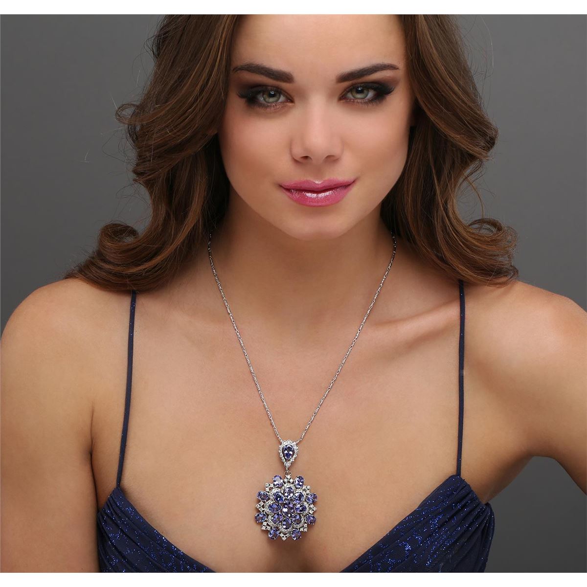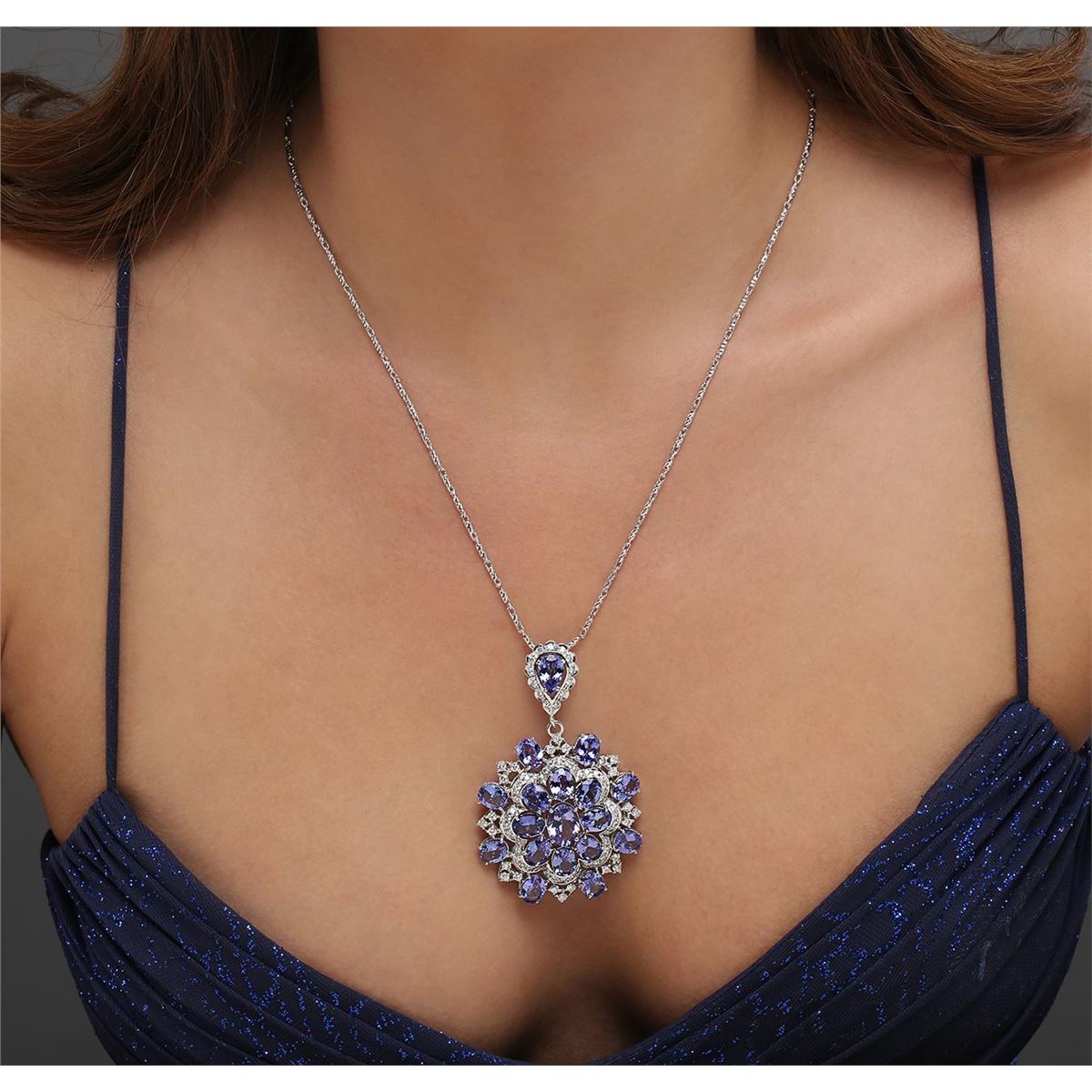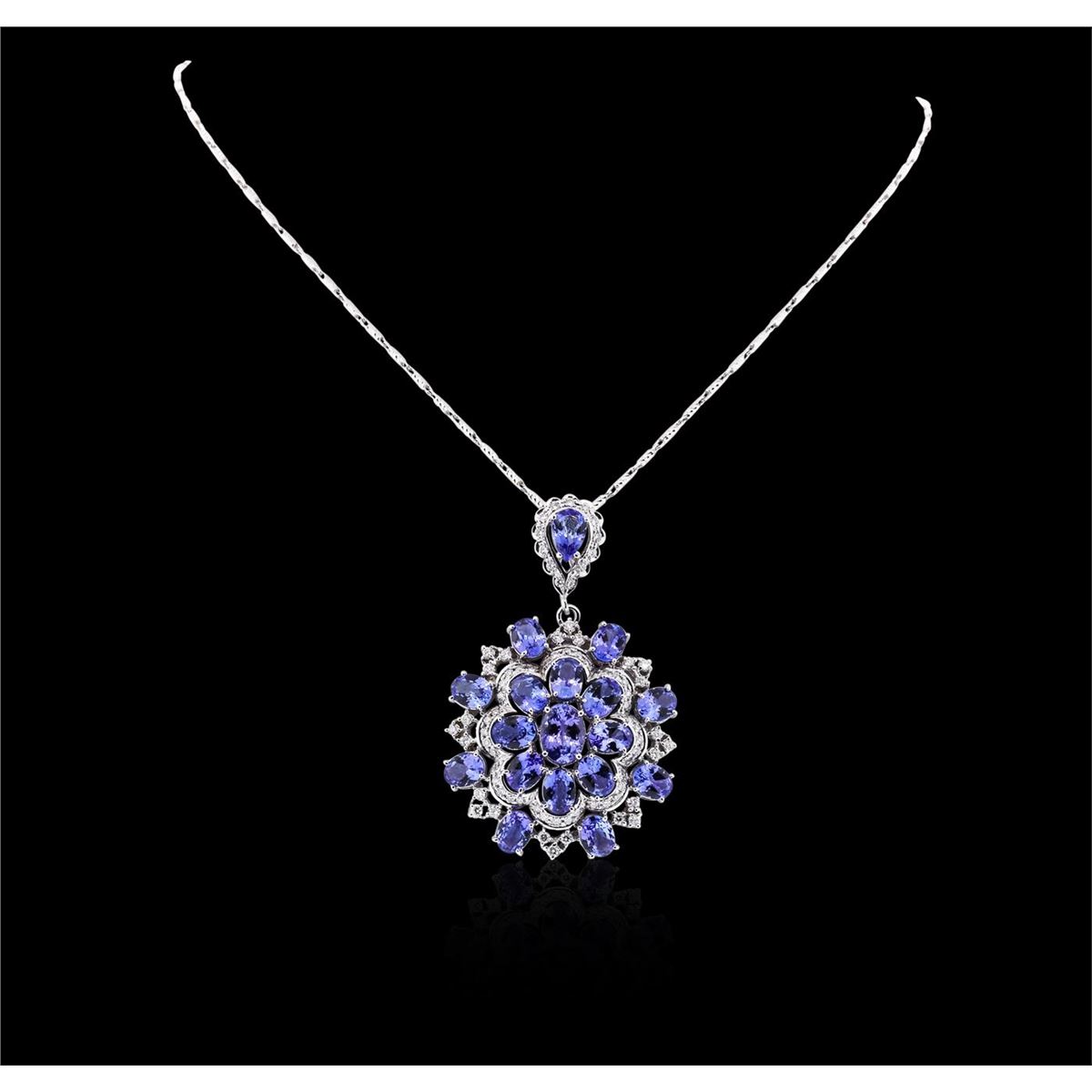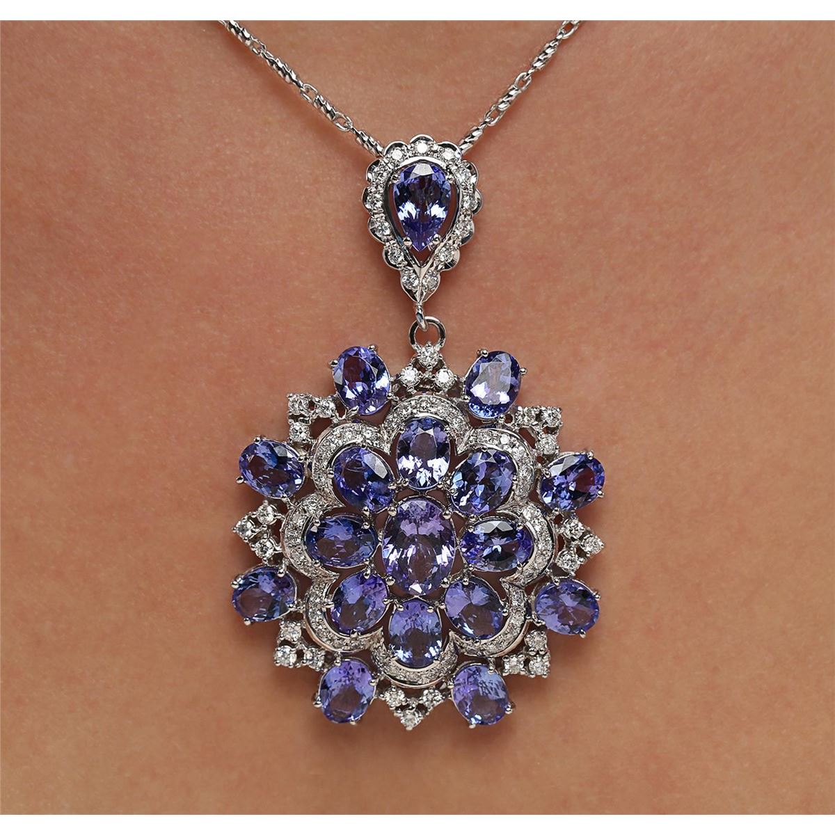 One electronically tested 14KT white gold ladies combination cast & assembled tanzanite and diamond pendant & chain 20.0" long, round link bar with a lobster claw clasp with a bright polish finish. Identified with markings of "K14". Condition is new. Containing: One prong set oval modified brilliant cut natural tanzanite, measuring 10.85 x 8.21 x 5.34mm, approximate weight of 3.35ct., clarity is eye clean, type I, cut is good. One prong set pear modified brilliant cut natural tanzanite, measuring 9.96 x 6.51 x 4.23mm, approximate weight of 1.84ct., clarity is eye clean, type I, medium light, very slightly grayish, violet color, (GIA V 4/3), cut is good. Sixteen prong set oval modified brilliant cut natural tanzanites, measuring 9.00 x 6.00 x 3.90mm, approximate total weight of 23.68ct., clarity is eye clean, type I, medium light, very slightly grayish, violet color, (GIA V 4/3), cut is good. Seventy-Seven prong set round brilliant cut diamonds, measuring 2.00 - 1.50 x 1.05mm (depth est.) approximate total weight of 77 Stones = 1.51ct. Clarity: SI-1 to I-1. Color: H - I, Cut is Good. Colored gemstones are presumed to have been subjected to commonly used enhancement processes. All diamonds and colored gemstones are graded in the mounting, unless otherwise stated. Total Weight of Colored Stones 28.87ct. Total Weight of Diamonds 1.51ct. Total Weight of Pendant & Chain 35.40 grams. GGL Appraised at $28,820.00.