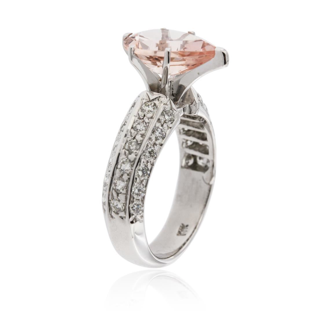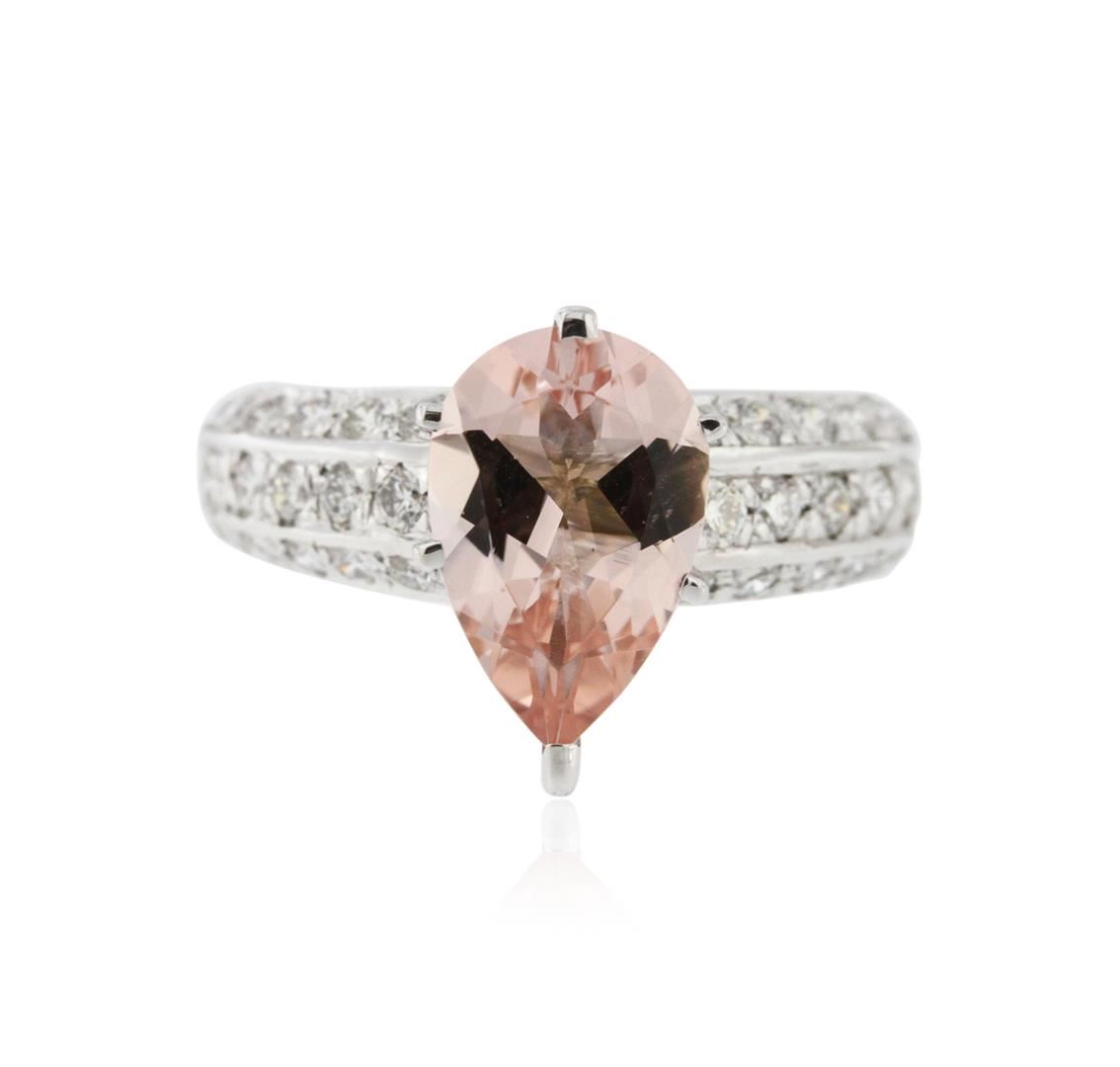 One ring featuring: 14KT white gold weighing 5.4 grams containing one pear cut morganite center weighing 3.00ct and diamonds weighing a total of 0.85ct.