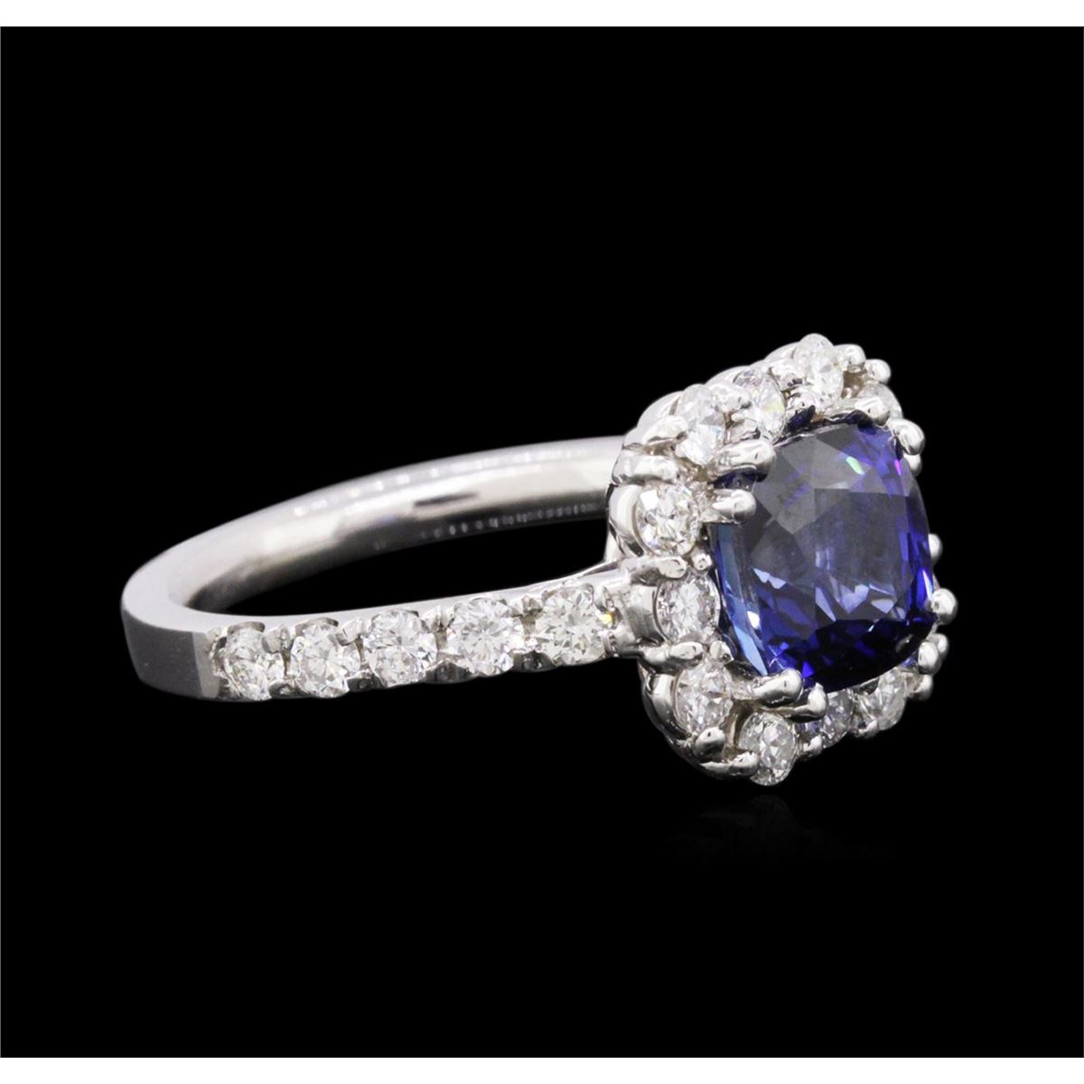 One electronically tested 14KT white gold ladies combination cast & assembled sapphire and diamond ring with a bright polish finish. Condition is new. Containing: One prong set square cushion modified brilliant cut natural blue sapphire, measuring 7.78 x 7.62 x 5.39mm, approximate weight of 3.00ct., clarity is eye clean, type II, medium dark, moderately strong, blue color, (GIA B 6/4), cut is good. Twenty-Two prong set round brilliant cut diamonds, measuring 2.20 - 2.20 x 1.32mm (depth est.) approximate total  weight of 22 Stones = 0.86ct. Clarity: SI-2 to I-1. Color: I - J, Cut is Good. Colored gemstones are presumed to have been subjected to commonly used enhancement processes. All diamonds and colored gemstones are graded in the mounting, unless otherwise stated. Total Weight of Colored Stones 3.00ct. Total Weight of Diamonds 0.86ct. Total Weight of Ring 5.50 grams. GGL Appraised at $5,550.00.
