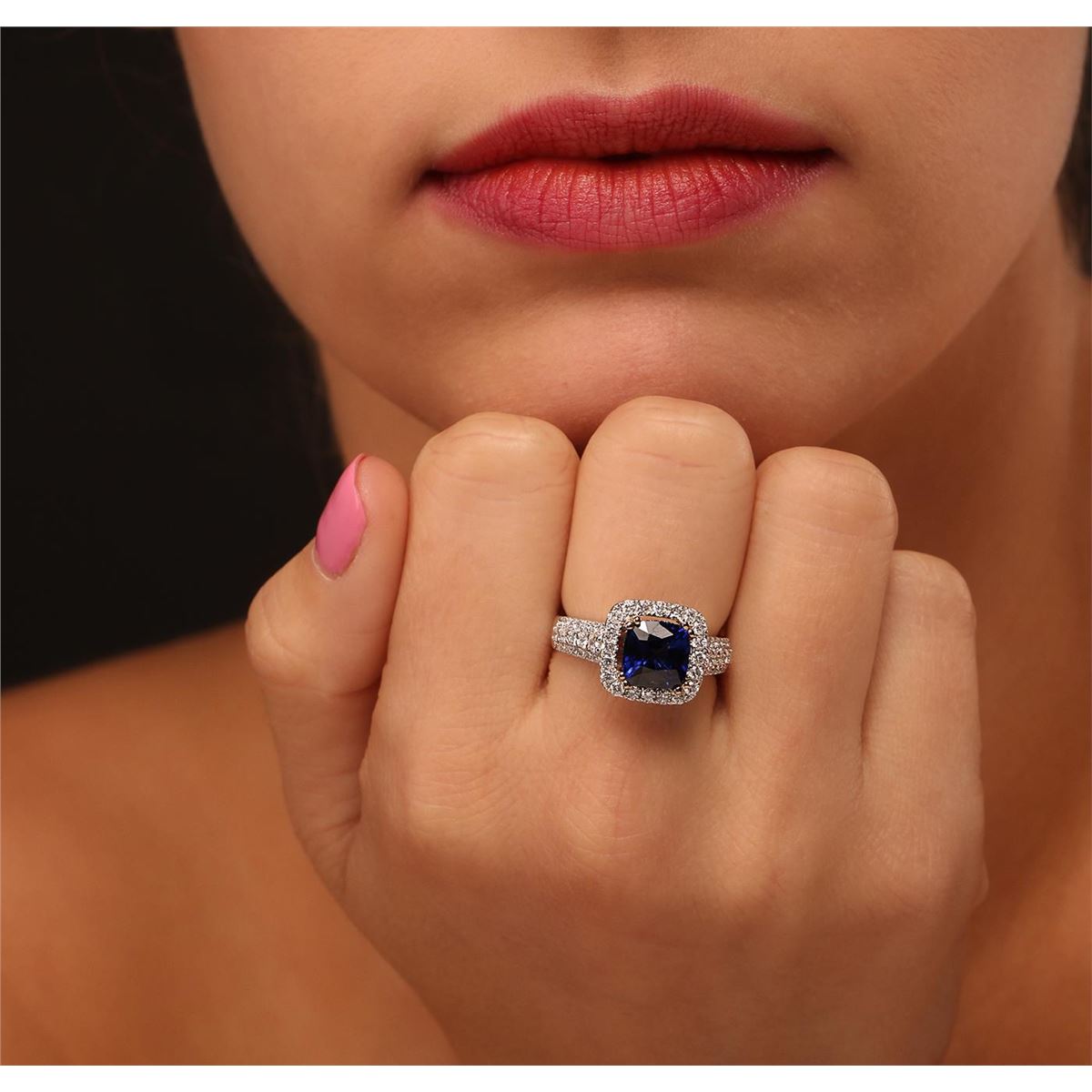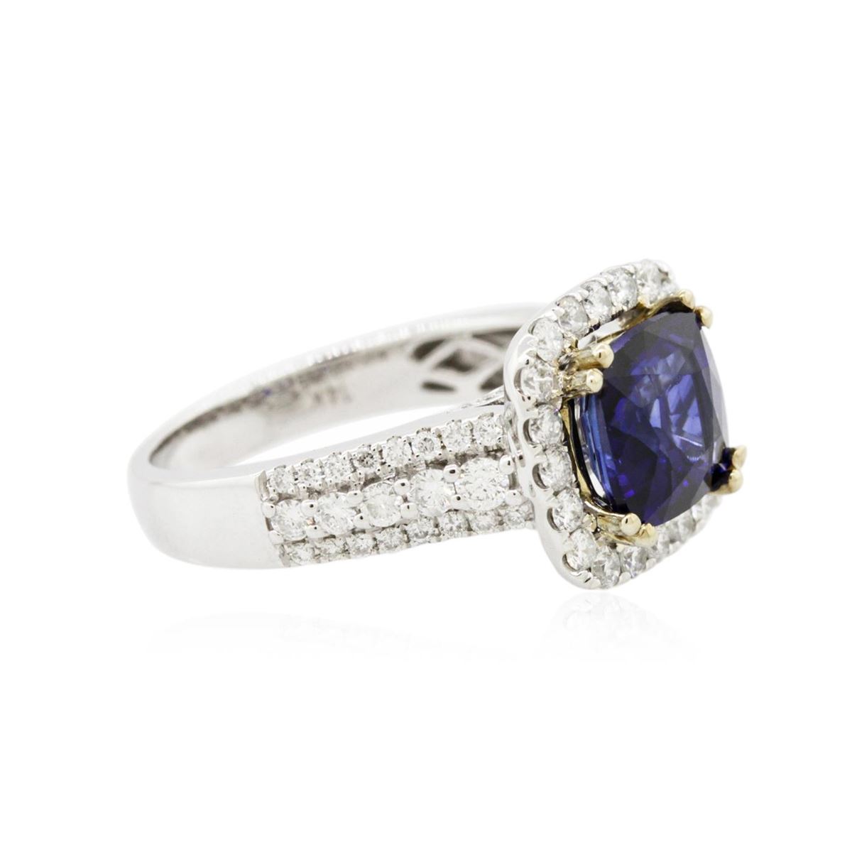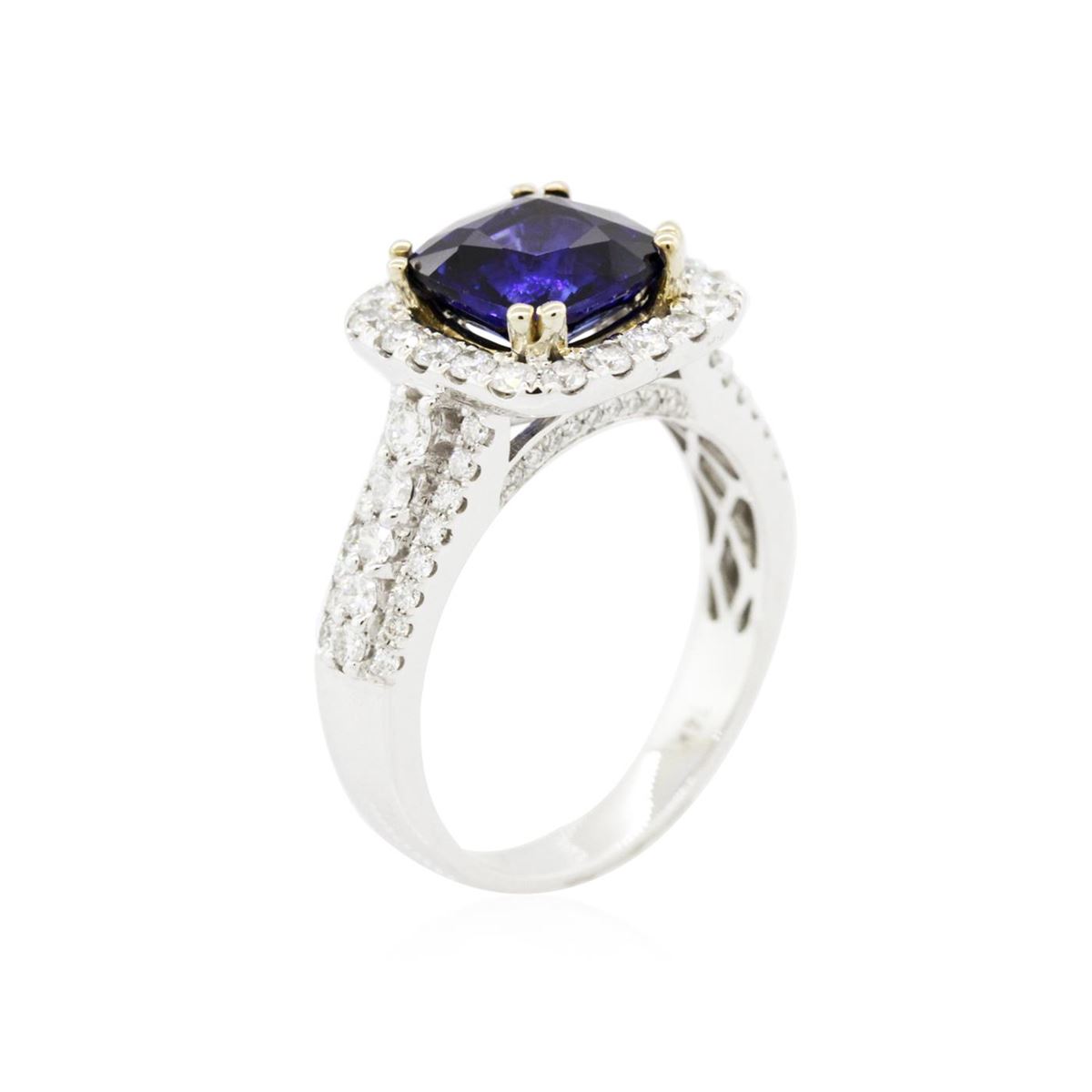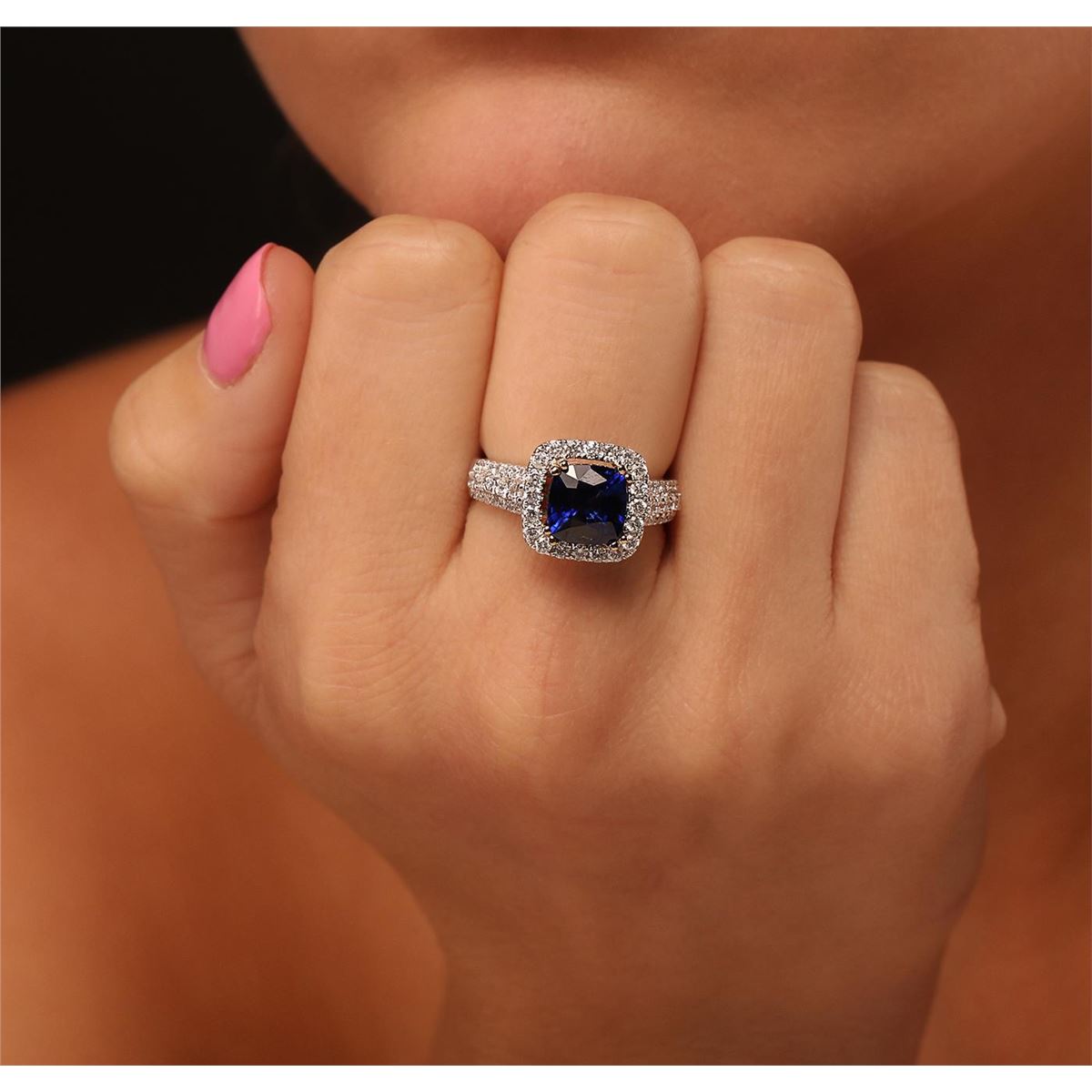 One electronically tested 14KT white gold ladies cast tanzanite and diamond ring with a bright polish finish. Condition is new, good workmanship. The featured tanzanite is set within a diamond bezel supported by diamond set shoulders, completed by a three millimeter wide band. Identified with markings of "14K". Containing: One prong set square cushion mixed cut natural tanzanite, measuring 7.90 x 7.85 x 5.20mm, 15%. bulge factor, approximate weight of 3.00ct., clarity is eye clean, type I, dark, moderately strong, blue color, (GIA B 7/4), cut is good. Transmitting light with no distortion, transparent. Graded in the setting. Tanzanite is a very rare gemstone that is only found in the country of Tanzania. Originally discovered in 1967. Tiffany & Company, named the stone Tanzanite. It is found in the Usumburu Mountains that border the Umba Valley of northern Tanzania. Tanzanite occurs in gray, brown, violet, blue, reddish-purple, & green. The gem is interesting because of its exceptional pleochroism. Rotated in different directions a tanzanite will exhibit multiple changes of color. Tanzanite has a low tolerance to ultrasonic cleaning, and should not be cleaned using this method. Eighty prong set round brilliant cut diamonds, measuring 2.30 - 0.80 x 0.93mm (depth est.) approximate. Total Weight of 80 Stones = 1.14ct. Graded in the setting. Clarity: SI-1 to I-1. Color: G - I. Total Weight of Colored Stones 3.00ct. Total Weight of Diamonds 1.14ct. Total Weight of Ring 5.92grams. AIG Appraised at $12,155.00.