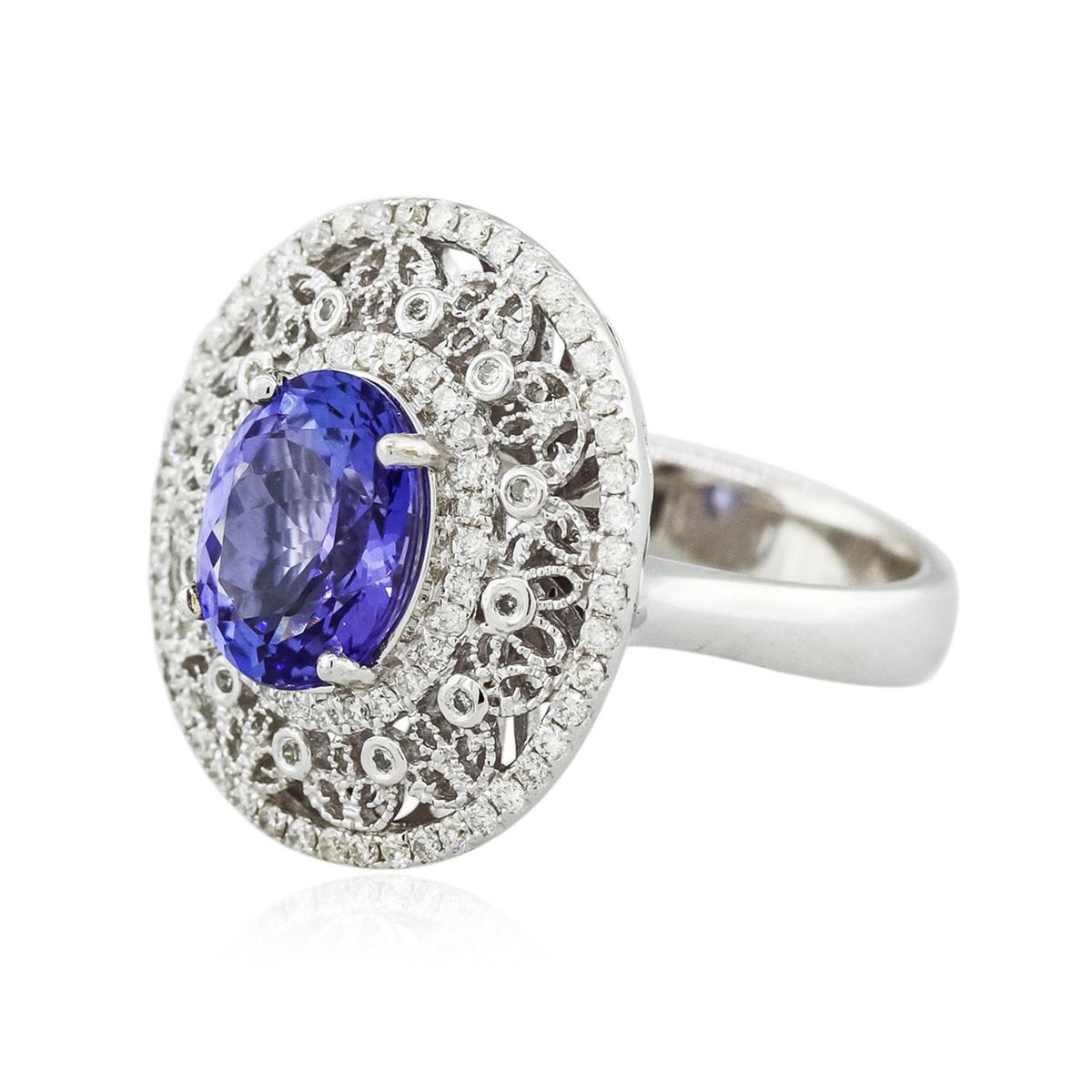 One electronically tested 14KT white gold Ladies combination cast & assembled ring with a bright polish finish. Condition is new. Identified with markings of "14K". Containing: One prong set oval modified brilliant cut natural tanzanite, measuring 10.20 x 8.15 x 5.30mm, exact weight 3.00ct., clarity is eye clean, type I, medium, very slightly grayish, bluish violet color, (GIA bV 5/3), cut is very good. Colored gemstones are presumed to have been subjected to commonly used color/clarity enhancement processes. Eighty-Nine bead set round brilliant cut diamonds, measuring 1.00 - 1.00 x 0.60mm (depth est.) approximate. Total Weight of 89 Stones = 0.66ct. Clarity: I-2 to I-3. Color: H - I, Cut is Good.. Total Weight of Colored Stones 3.00ct. Total Weight of Diamonds 0.66ct. Total Weight of Ring 9.30 grams. GGL Appraised at $8,835.00.