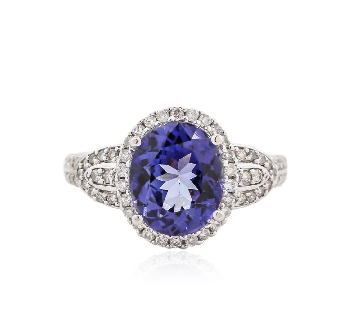 One electronically tested 14KT white gold ladies cast tanzanite & diamond ring with a bright finish. The featured tanzanite is set within a diamond bezel, supported by an elaborate lattice under gallery and diamond set shoulders, completed by a two millimeter wide band. Trademark is Orianne. Identified with markings of "14K". Condition is new, good workmanship. Containing: One prong set oval brilliant cut natural tanzanite, measuring 10.00 x 8.00 x 5.25mm, approximate weight of 3.00ct., clarity is eye clean, type I, dark, very slightly grayish, blue color, (GIA B 7/3), cut is good. Natural Tanzanite, color enhanced due to cobalt coating. The presence of the coating prevents determining the stone's actual depth of color. Transmitting light with no distortion, transparent. Grading in the setting. The cobalt coated Tanzanite has a low tolerance to ultrasonic cleaning, and should not be cleaned using this method. Tanzanite is a very rare gemstone that is only found in the country of Tanzania. Originally discovered in 1967. Tiffany & Company, named the stone Tanzanite. It is found in the Usumburu Mountains that border the Umba Valley of northern Tanzania. Tanzanite occurs in gray, brown, violet, blue, reddish-purple, & green. The gem is interesting because of its exceptional pleochroism. Rotated in different directions a tanzanite will exhibit multiple changes of color. Sixty-Four prong set round brilliant cut diamonds, measuring 1.30 - 1.00 x 0.69mm (depth est.) approximate total weight of 64 Stones = 0.44ct. Graded in the setting. Clarity: SI-2 to I-2. Color: G - I. Total Weight of Colored Stones 3.00ct. Total Weight of Diamonds 0.44ct. Total Weight of Ring 3.84gm. AIG Appraised at $3,590.00.