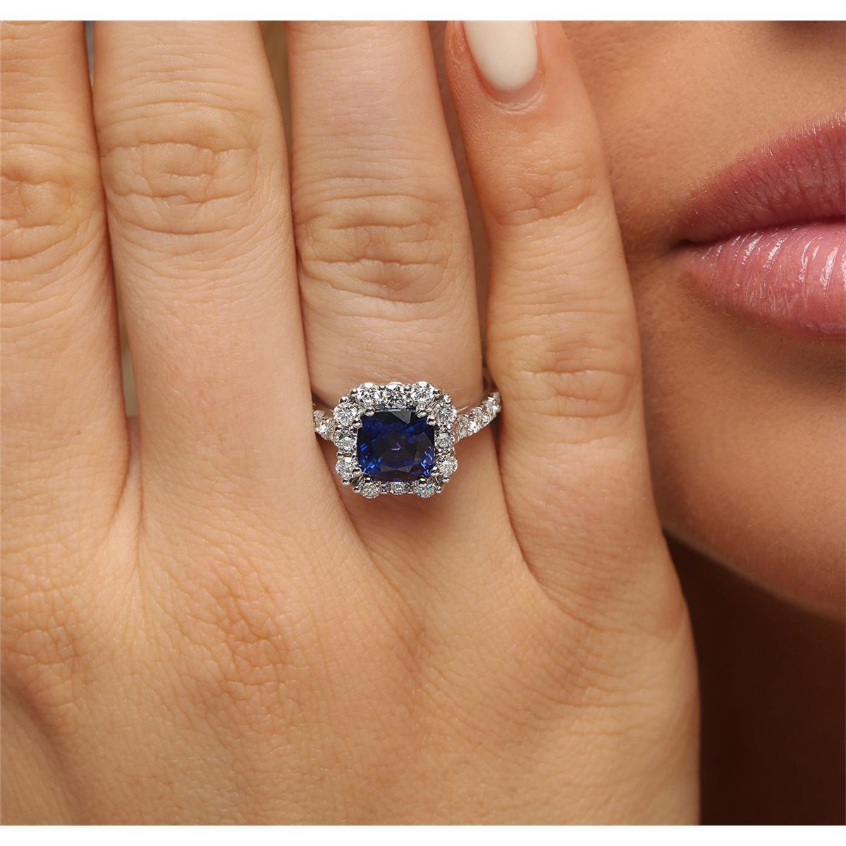 One electronically tested 14KT white gold ladies combination cast & assembled sapphire and diamond ring with a bright polish finish. Condition is new. Containing: One prong set square cushion modified brilliant cut natural blue sapphire, measuring 7.78 x 7.62 x 5.39mm, approximate weight of 3.00ct., clarity is eye clean, type II, medium dark, moderately strong, blue color, (GIA B 6/4), cut is good. Twenty-Two prong set round brilliant cut diamonds, measuring 2.20 - 2.20 x 1.32mm (depth est.) approximate total weight of 22 Stones = 0.86ct. Clarity: SI-2 to I-1. Color: I - J, Cut is Good. Colored gemstones are presumed to have been subjected to commonly used enhancement processes. All diamonds and colored gemstones are graded in the mounting, unless otherwise stated. Total Weight of Colored Stones 3.00ct. Total Weight of Diamonds 0.86ct. Total Weight of Ring 5.50 grams. GGL Appraised at $5,550.00.