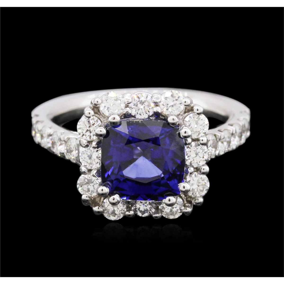 One electronically tested 14KT white gold ladies combination cast & assembled sapphire and diamond ring with a bright polish finish. Condition is new. Containing: One prong set square cushion modified brilliant cut natural blue sapphire, measuring 7.78 x 7.62 x 5.39mm, approximate weight of 3.00ct., clarity is eye clean, type II, medium dark, moderately strong, blue color, (GIA B 6/4), cut is good. Twenty-Two prong set round brilliant cut diamonds, measuring 2.20 - 2.20 x 1.32mm (depth est.) approximate total weight of 22 Stones = 0.86ct. Clarity: SI-2 to I-1. Color: I - J, Cut is Good. Colored gemstones are presumed to have been subjected to commonly used enhancement processes. All diamonds and colored gemstones are graded in the mounting, unless otherwise stated. Total Weight of Colored Stones 3.00ct. Total Weight of Diamonds 0.86ct. Total Weight of Ring 5.50 grams. GGL Appraised at $5,550.00.