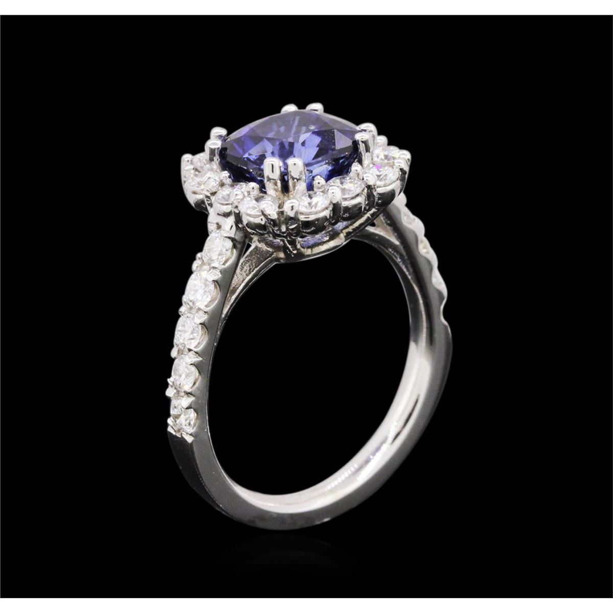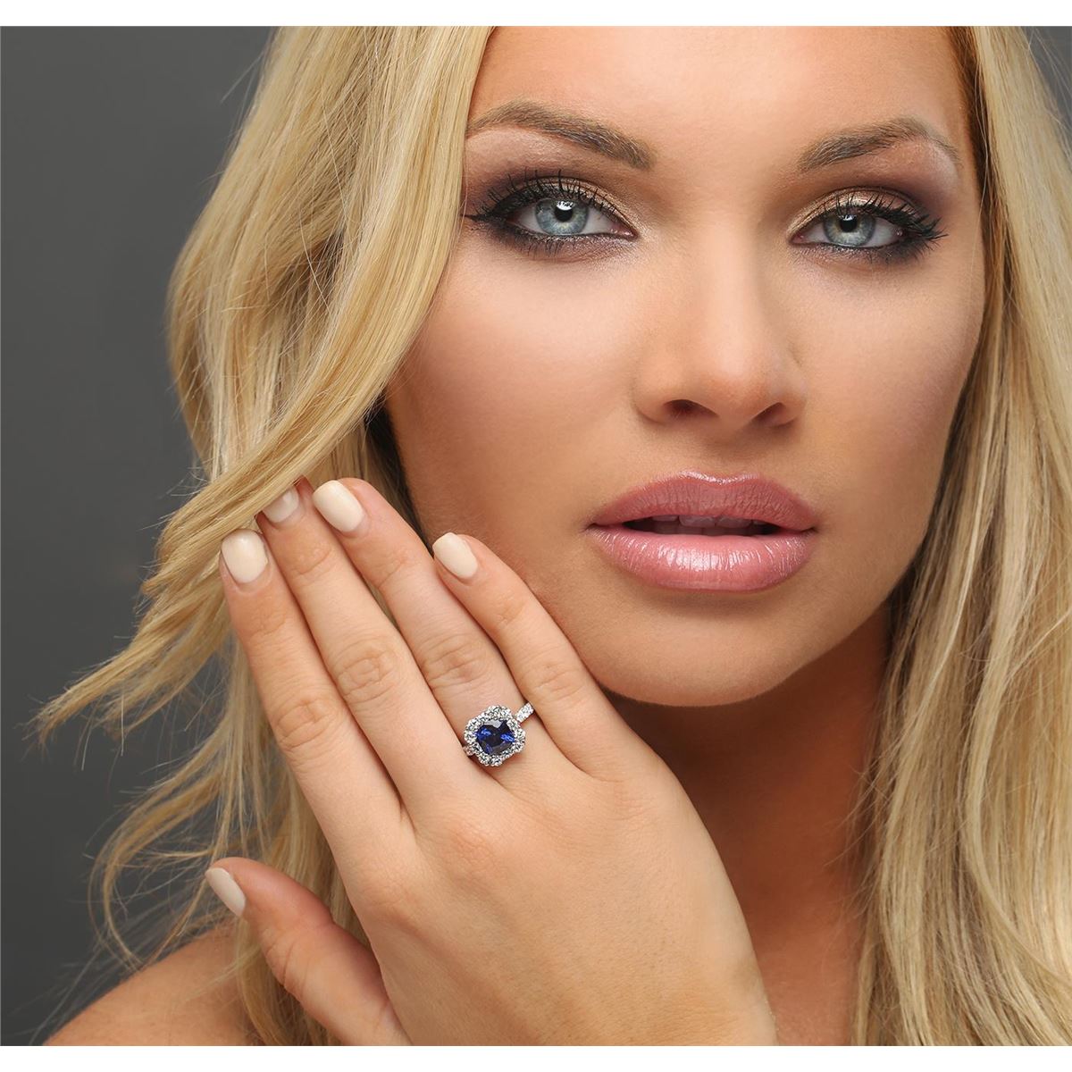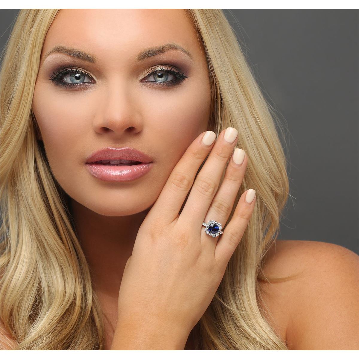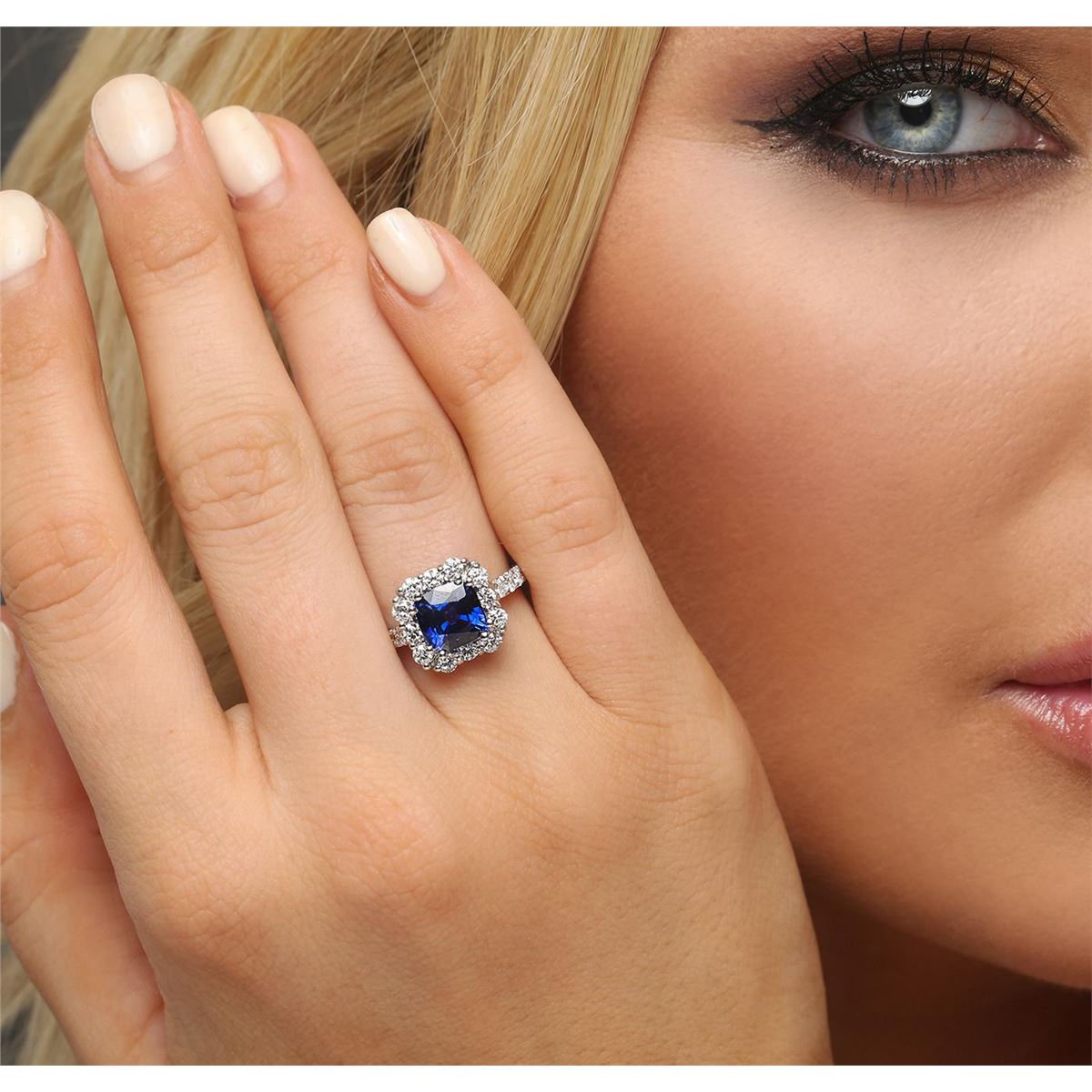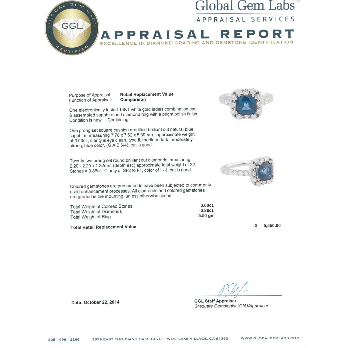 One electronically tested 14KT white gold ladies combination cast & assembled sapphire and diamond ring with a bright polish finish. Condition is new. Containing: One prong set square cushion modified brilliant cut natural blue sapphire, measuring 7.78 x 7.62 x 5.39mm, approximate weight of 3.00ct., clarity is eye clean, type II, medium dark, moderately strong, blue color, (GIA B 6/4), cut is good. Twenty-Two prong set round brilliant cut diamonds, measuring 2.20 - 2.20 x 1.32mm (depth est.) approximate total weight of 22 Stones = 0.86ct. Clarity: SI-2 to I-1. Color: I - J, Cut is Good. Colored gemstones are presumed to have been subjected to commonly used enhancement processes. All diamonds and colored gemstones are graded in the mounting, unless otherwise stated. Total Weight of Colored Stones 3.00ct. Total Weight of Diamonds 0.86ct. Total Weight of Ring 5.50 grams. GGL Appraised at $5,550.00.