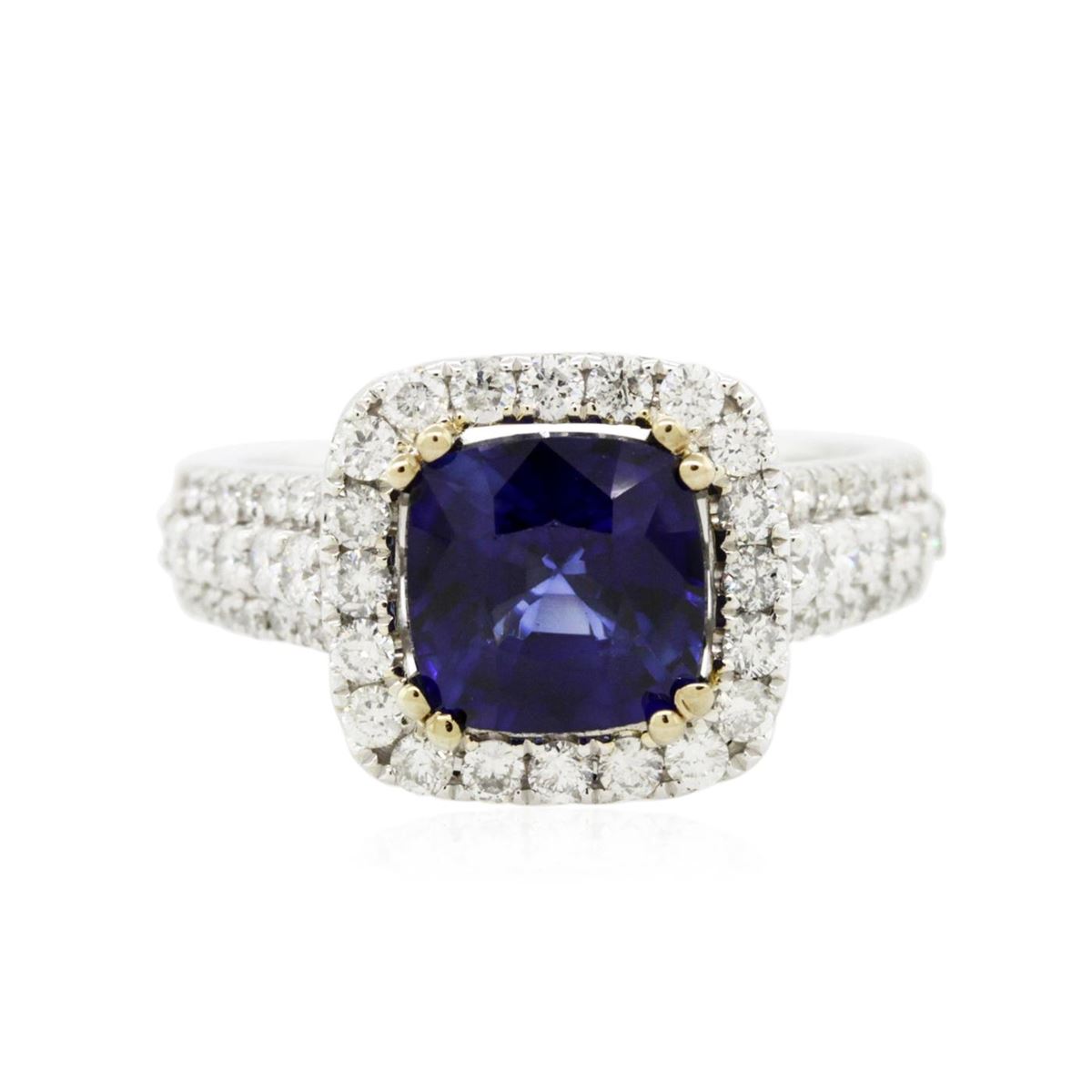 One electronically tested 14KT white gold ladies cast tanzanite and diamond ring with a bright polish finish. Condition is new, good workmanship. The featured tanzanite is set within a diamond bezel supported by diamond set shoulders, completed by a three millimeter wide band. Identified with markings of "14K". Containing: One prong set square cushion mixed cut natural tanzanite, measuring 7.90 x 7.85 x 5.20mm, 15%. bulge factor, approximate weight of 3.00ct., clarity is eye clean, type I, dark, moderately strong, blue color, (GIA B 7/4), cut is good. Transmitting light with no distortion, transparent. Graded in the setting. Tanzanite is a very rare gemstone that is only found in the country of Tanzania. Originally discovered in 1967. Tiffany & Company, named the stone Tanzanite. It is found in the Usumburu Mountains that border the Umba Valley of northern Tanzania. Tanzanite occurs in gray, brown, violet, blue, reddish-purple, & green. The gem is interesting because of its exceptional pleochroism. Rotated in different directions a tanzanite will exhibit multiple changes of color. Tanzanite has a low tolerance to ultrasonic cleaning, and should not be cleaned using this method. Eighty prong set round brilliant cut diamonds, measuring 2.30 - 0.80 x 0.93mm (depth est.) approximate. Total Weight of 80 Stones = 1.14ct. Graded in the setting. Clarity: SI-1 to I-1. Color: G - I. Total Weight of Colored Stones 3.00ct. Total Weight of Diamonds 1.14ct. Total Weight of Ring 5.92grams. AIG Appraised at $12,155.00.