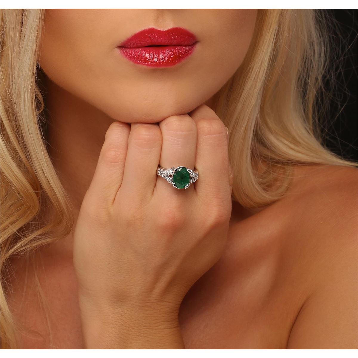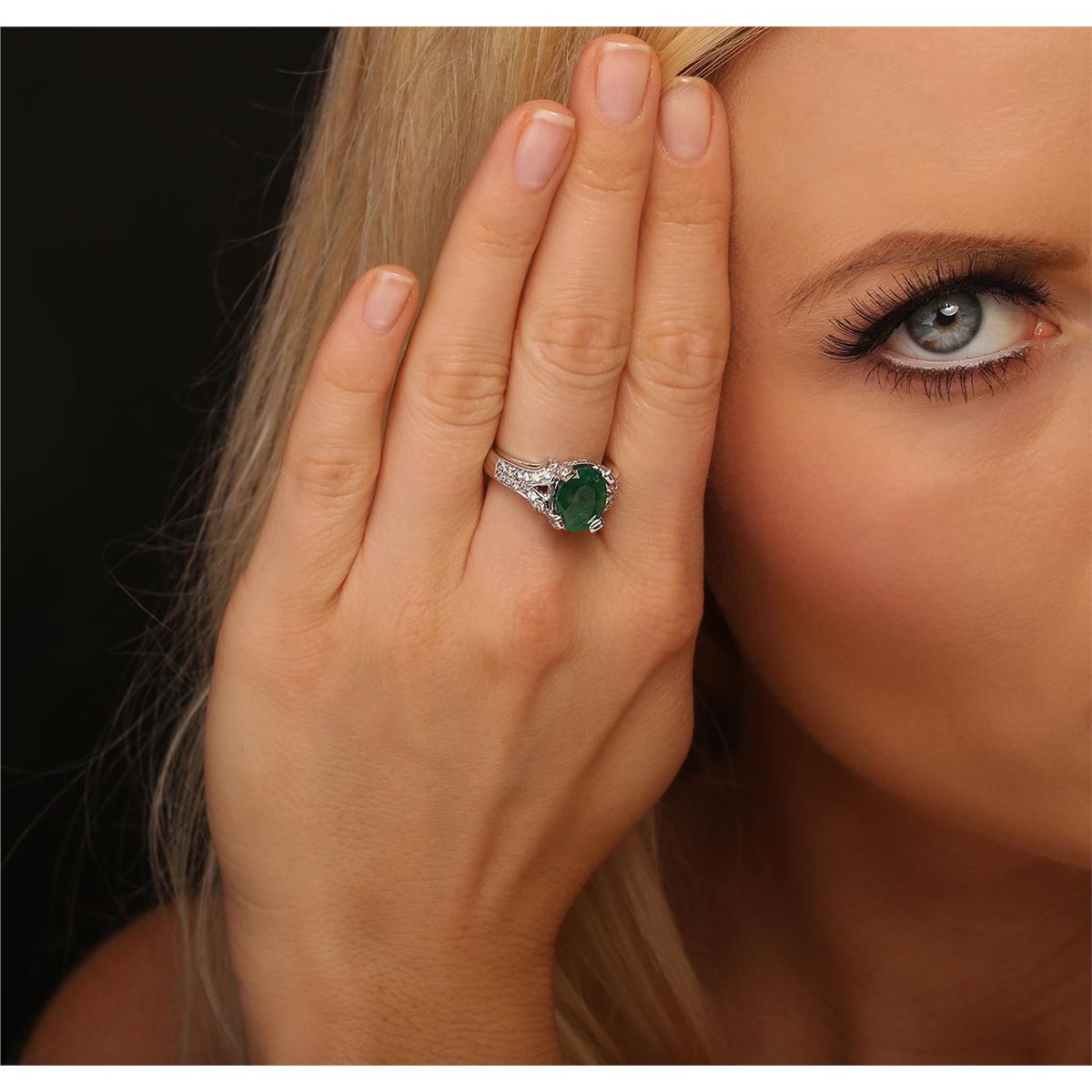One electronically tested 14KT white gold ladies cast emerald and diamond ring with a bright and milgrain finish. Condition is new, good workmanship. The featured emerald is set within a diamond lattice gallery, supported by diamond set split shoulders and completed by a three millimeter wide band. Trademark is SA. Identified with markings of "14K". Containing: One prong set oval mixed cut natural emerald, measuring 10.85 x 8.60 x 5.55mm, approximate weight of 3.01ct., clarity is heavily included, type III, medium dark, very slightly grayish, very slightly bluish green color, (GIA vslbG 6/3), cut is good. Transmitting light somewhat diffusely, translucent. Naturally occurring internal & external characteristics are present. Indications of oil residue. Graded in the setting. Fifty-Two bead set round brilliant cut diamonds, measuring 1.70 - 0.90 x 0.78mm (depth est.) approximate. Total Weight of 52 Stones = 0.69ct. Graded in the setting. Clarity: SI-2 to I-2. Color: H - I. Total Weight of Colored Stones 3.01ct. Total Weight of Diamonds 0.69ct. Total Weight of Ring 7.70 grams. AIG Appraised at $5,400.00.