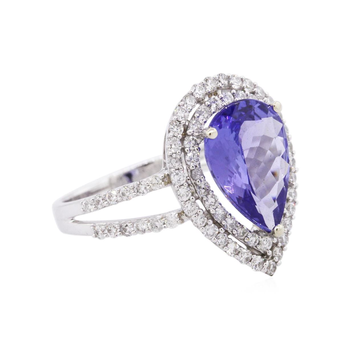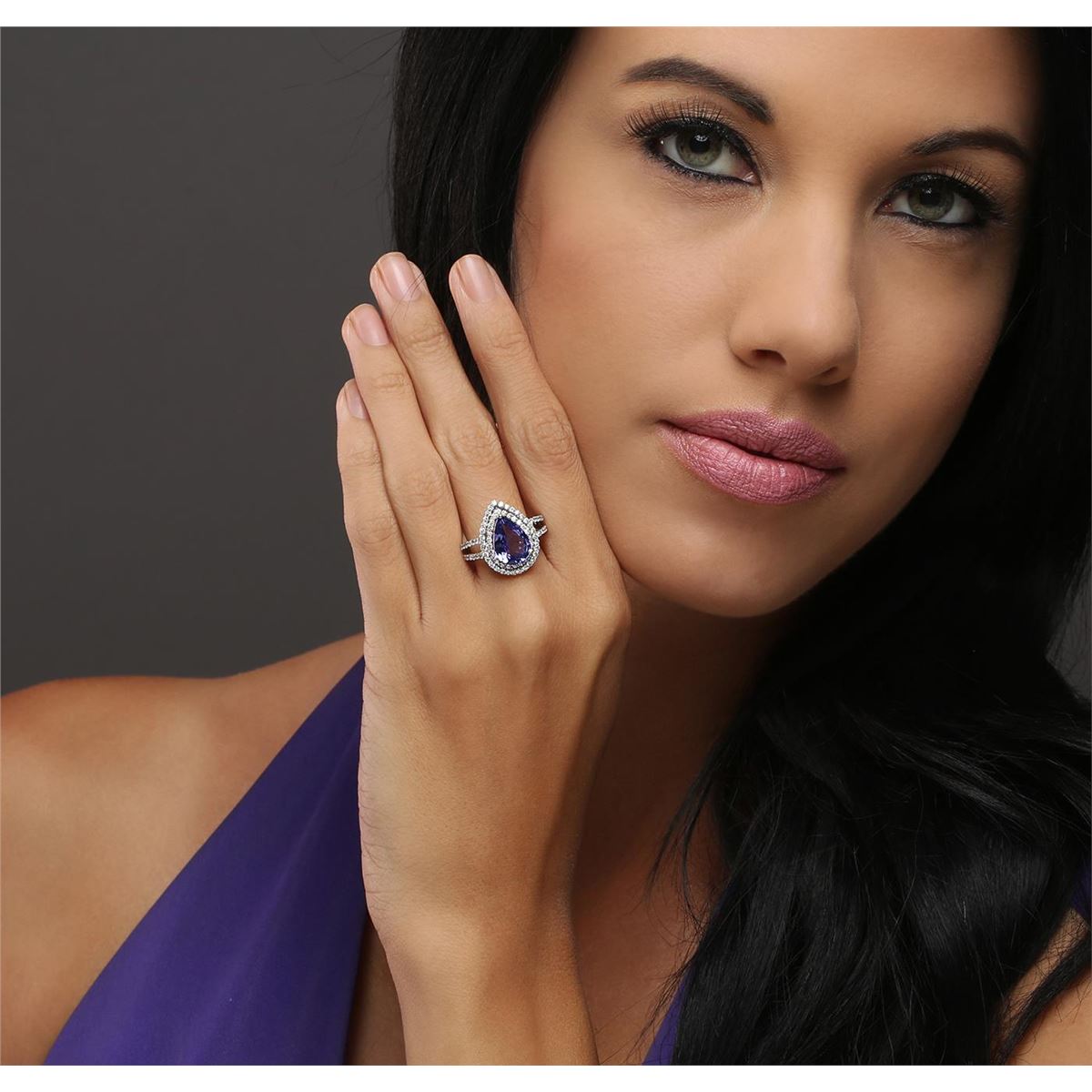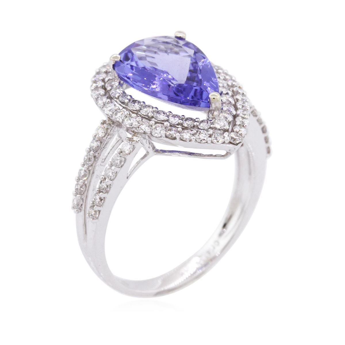 One electronically tested 14KT white gold ladies combination cast & assembled tanzanite and diamond ring with a split shank with a bright polish finish. Identified with markings of "14K". Condition is new. Containing: One prong set pear modified brilliant cut natural tanzanite, measuring 12.00 x 8.65 x 4.33mm, approximate weight of 3.01ct., clarity is eye clean, type I, medium, very slightly grayish, violet color, (GIA V 5/3), cut is good. Eighty-One prong set round brilliant cut diamonds, measuring 1.30 - 1.30 x 0.78mm (depth est.) approximate total weight of 81 Stones = 0.65ct. Clarity: I-1 to I-2. Color: I - J, Cut is Good. Colored gemstones are presumed to have been subjected to commonly used enhancement processes. All diamonds and colored gemstones are graded in the mounting, unless otherwise stated. Total Weight of Colored Stones 3.01ct. Total Weight of Diamonds 0.65ct. Total Weight of Ring 4.20 grams. GGL Appraised at $6,595.00.