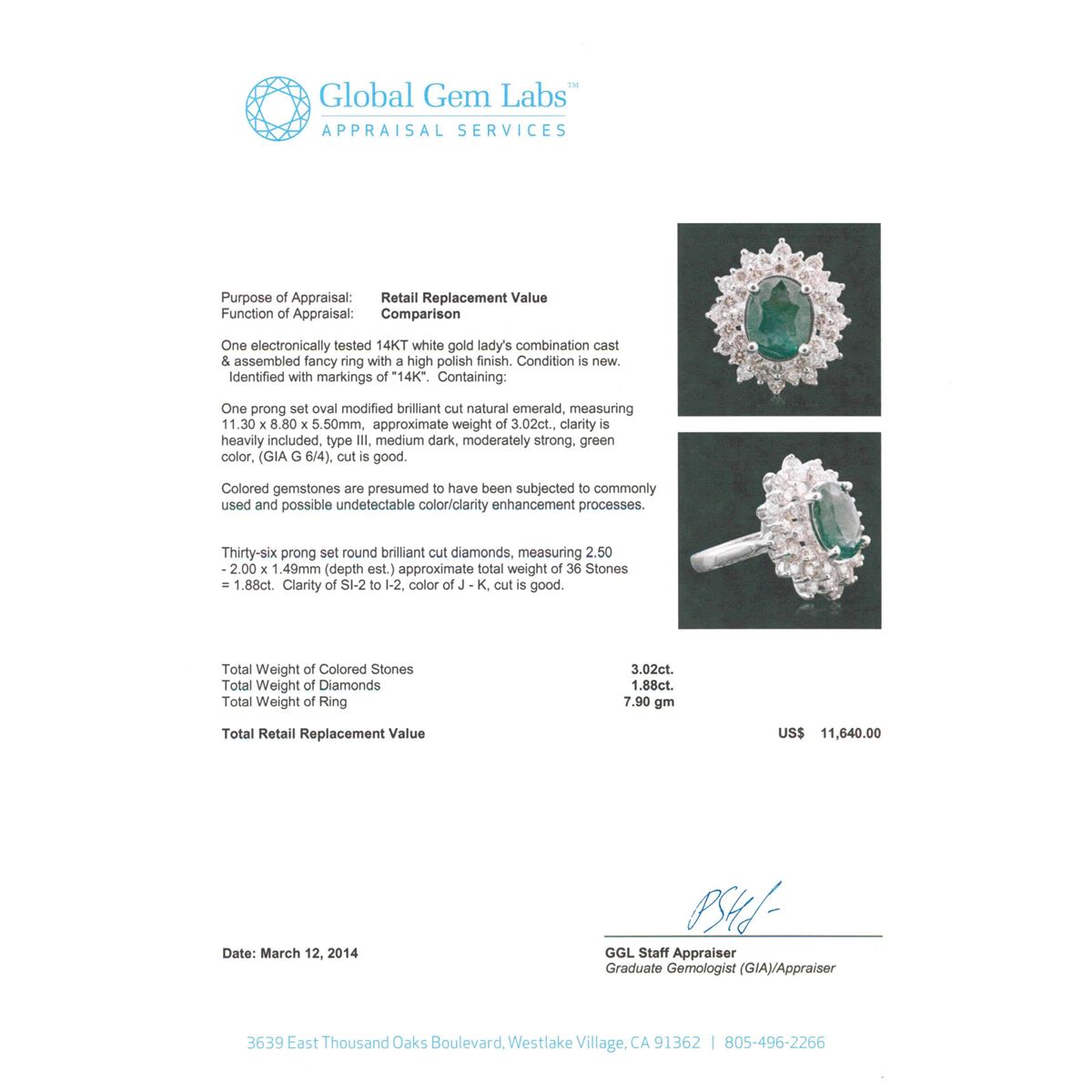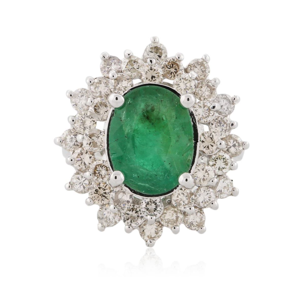 One electronically tested 14KT white gold Ladies combination cast & assembled fancy ring with a high polish finish. Condition is new. Identified with markings of "14K". Containing: One prong set oval modified brilliant cut natural emerald, measuring 11.30 x 8.80 x 5.50mm, approximate weight of 3.02ct., clarity is heavily included, type III, medium dark, moderately strong, green color, (GIA G 6/4), cut is good. Colored gemstones are presumed to have been subjected to commonly used and possible undetectable color/clarity enhancement processes. Thirty-Six prong set round brilliant cut diamonds, measuring 2.50 - 2.00 x 1.49mm (depth est.) approximate total weight of 36 Stones = 1.88ct. Clarity of SI-2 to I-2, Color of J - K, Cut is Good. Total Weight of Colored Stones 3.02ct. Total Weight of Diamonds 1.88ct. Total Weight of Ring 7.90 grams. GGL Appraised at $11,640.00.