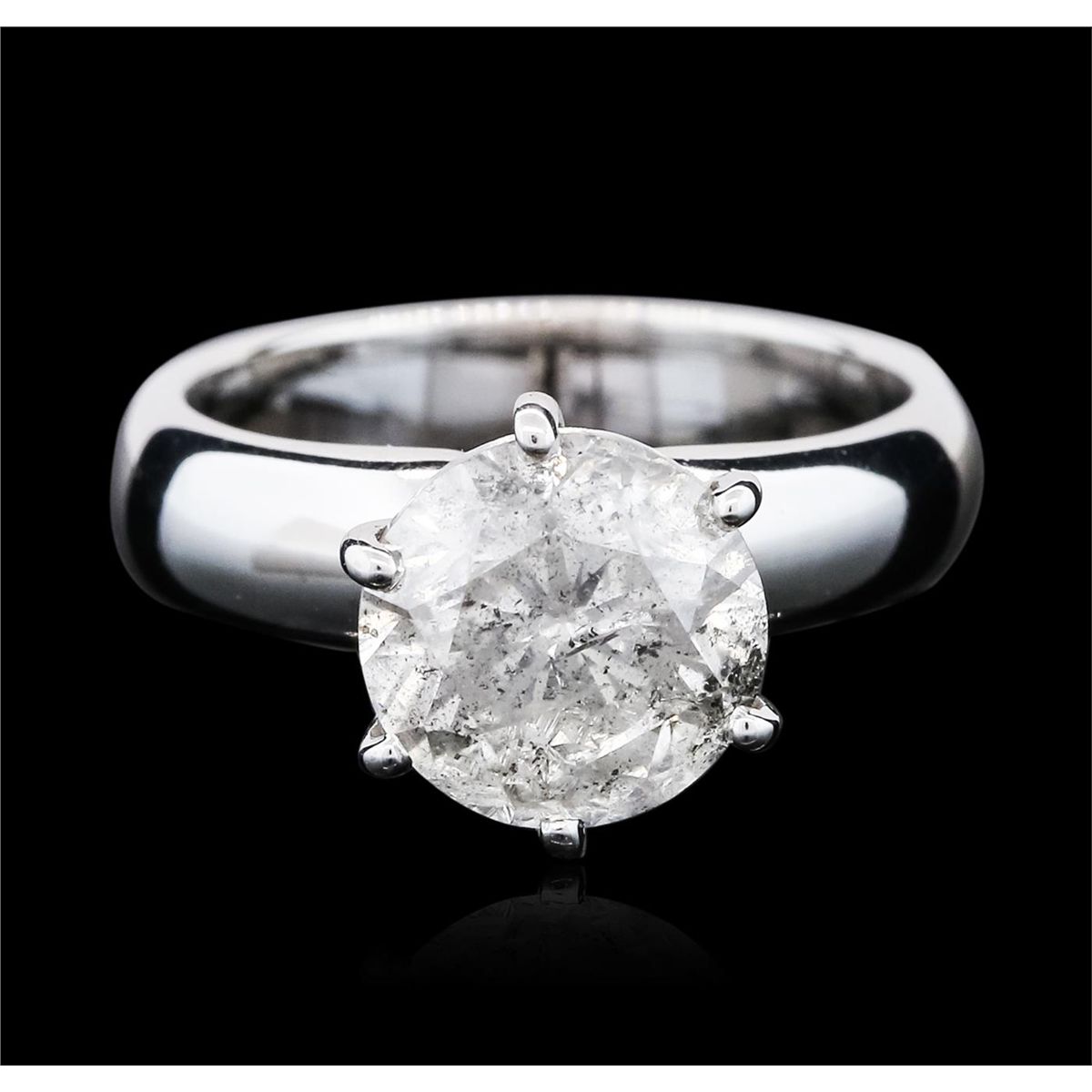 One electronically tested 14KT white gold ladies cast diamond solitaire ring with a bright polish finish. The ring is completed by a four millimeter wide band. Identified with markings of "14K". Condition is good. Containing: One prong set round brilliant cut diamond, measuring 9.00 - 8.95 x 5.60mm (depth est.), 6.00.%. GTCF approximate weight of 3.02ct with a medium strong blue fluorescence. Graded in the setting. Clarity: I-2. Color:  62.4%. Table 61.3%. Total Weight of Diamonds 3.02ct. Total Weight of Ring 5.68 grams. AIG Appraised at $27,075.00.