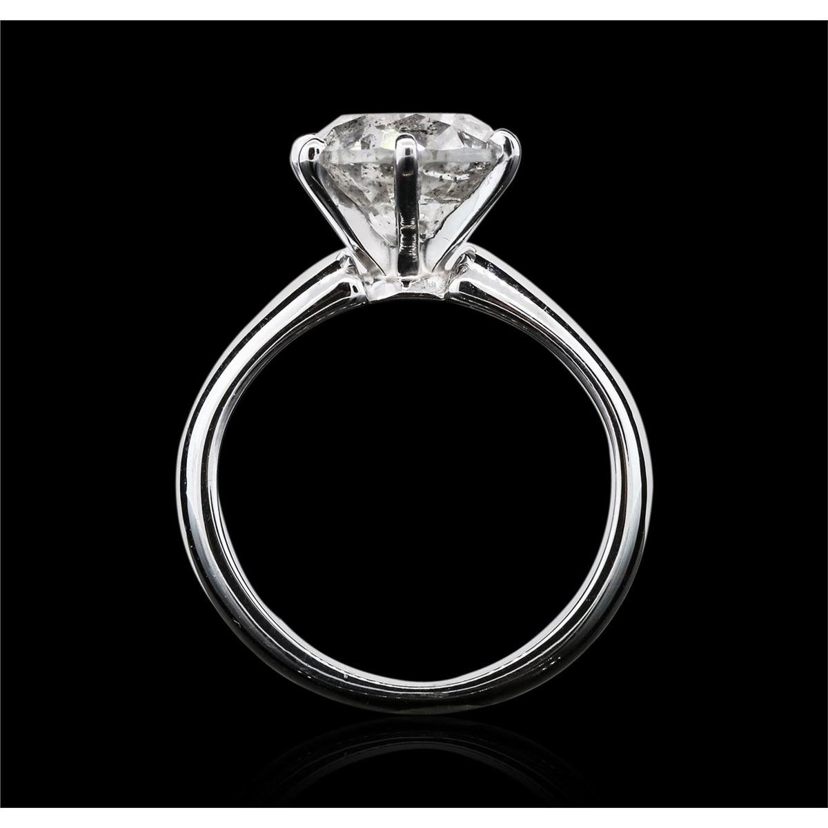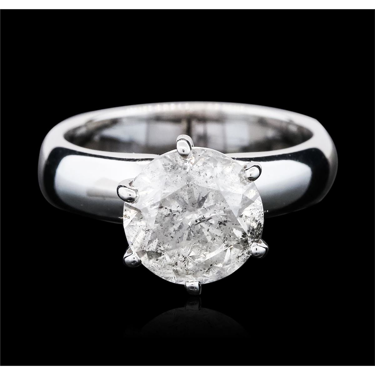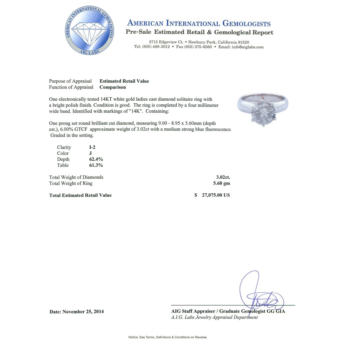 One electronically tested 14KT white gold ladies cast diamond solitaire ring with a bright polish finish. The ring is completed by a four millimeter wide band. Identified with markings of "14K". Condition is good. Containing: One prong set round brilliant cut diamond, measuring 9.00 - 8.95 x 5.60mm (depth est.), 6.00.%. GTCF approximate weight of 3.02ct with a medium strong blue fluorescence. Graded in the setting. Clarity: I-2. Color: 62.4%. Table 61.3%. Total Weight of Diamonds 3.02ct. Total Weight of Ring 5.68 grams. AIG Appraised at $27,075.00.