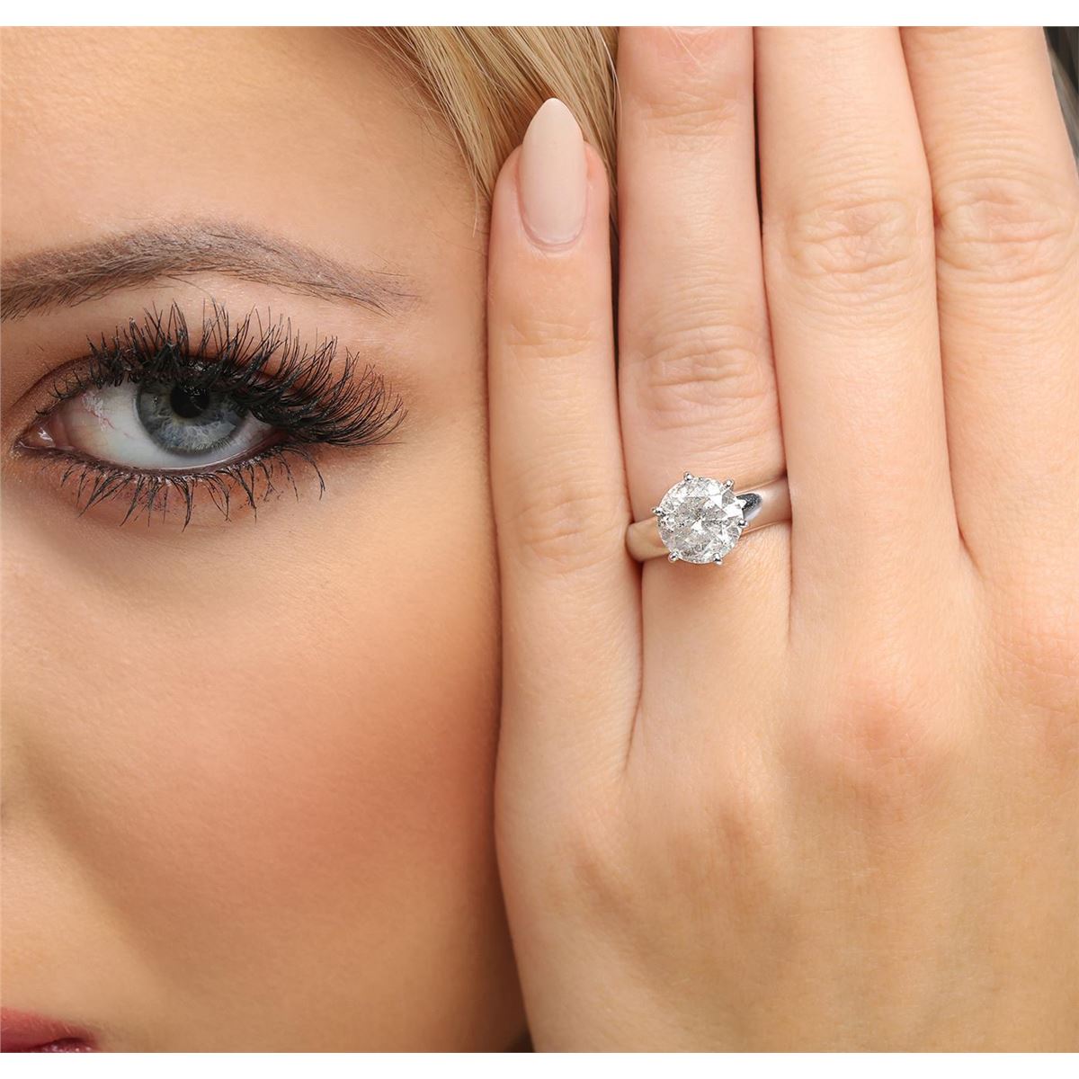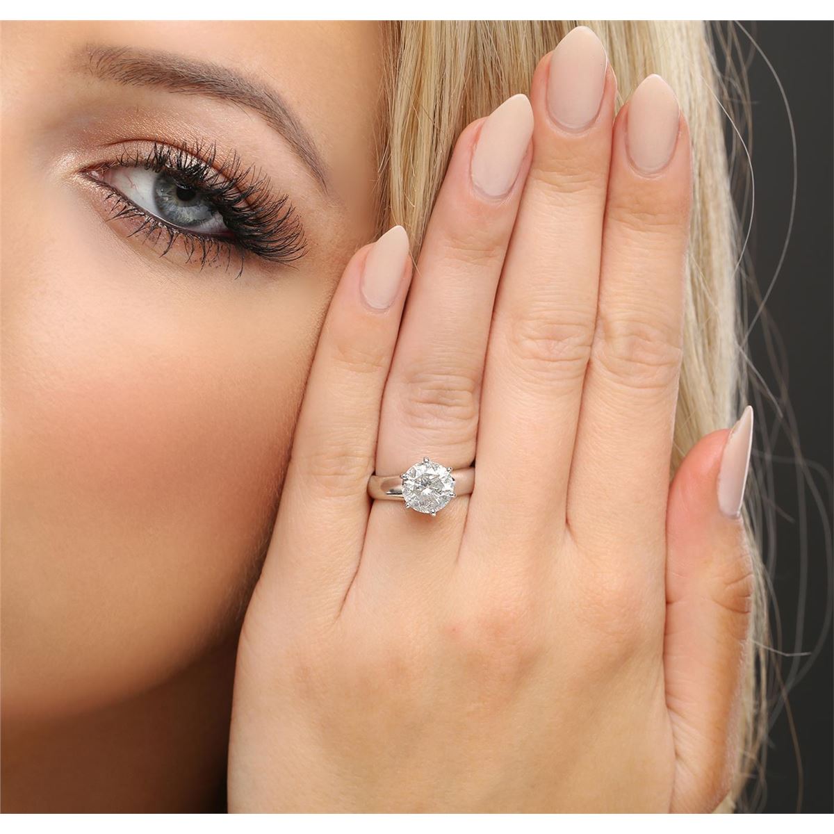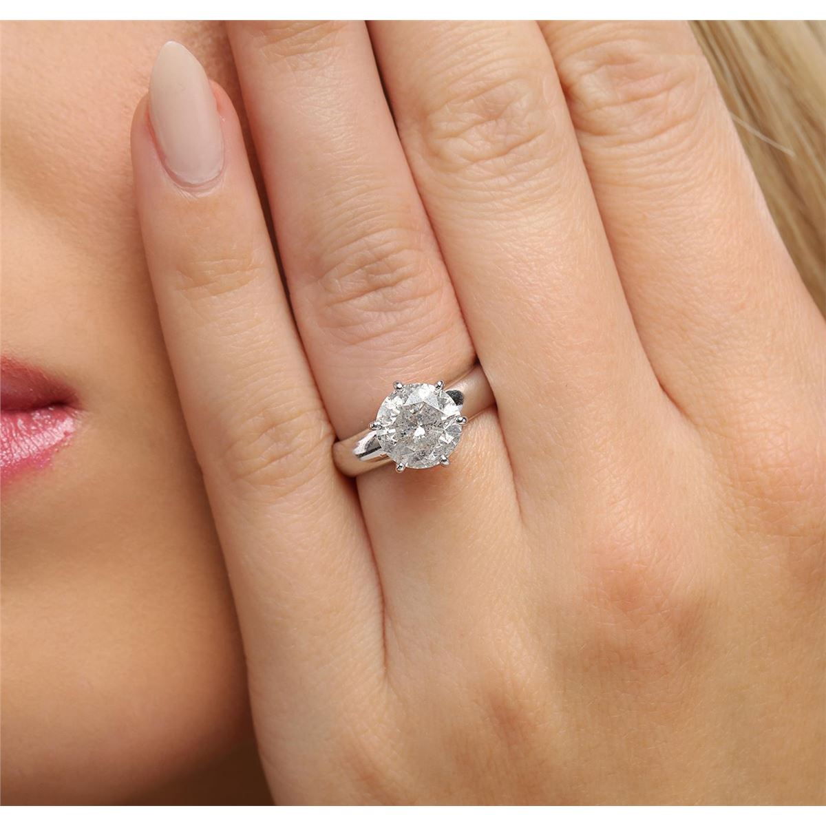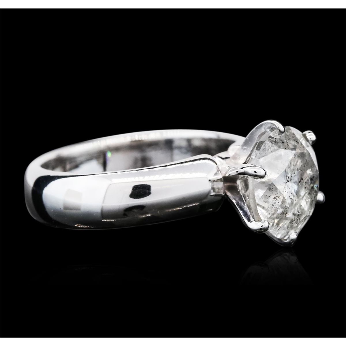 One electronically tested 14KT white gold ladies cast diamond solitaire ring with a bright polish finish. The ring is completed by a four millimeter wide band. Identified with markings of "14K". Condition is good. Containing: One prong set round brilliant cut diamond, measuring 9.00 - 8.95 x 5.60mm (depth est.), 6.00.%. GTCF approximate weight of 3.02ct with a medium strong blue fluorescence. Graded in the setting. Clarity: I-2. Color: 62.4%. Table 61.3%. Total Weight of Diamonds 3.02ct. Total Weight of Ring 5.68 grams. AIG Appraised at $27,075.00.