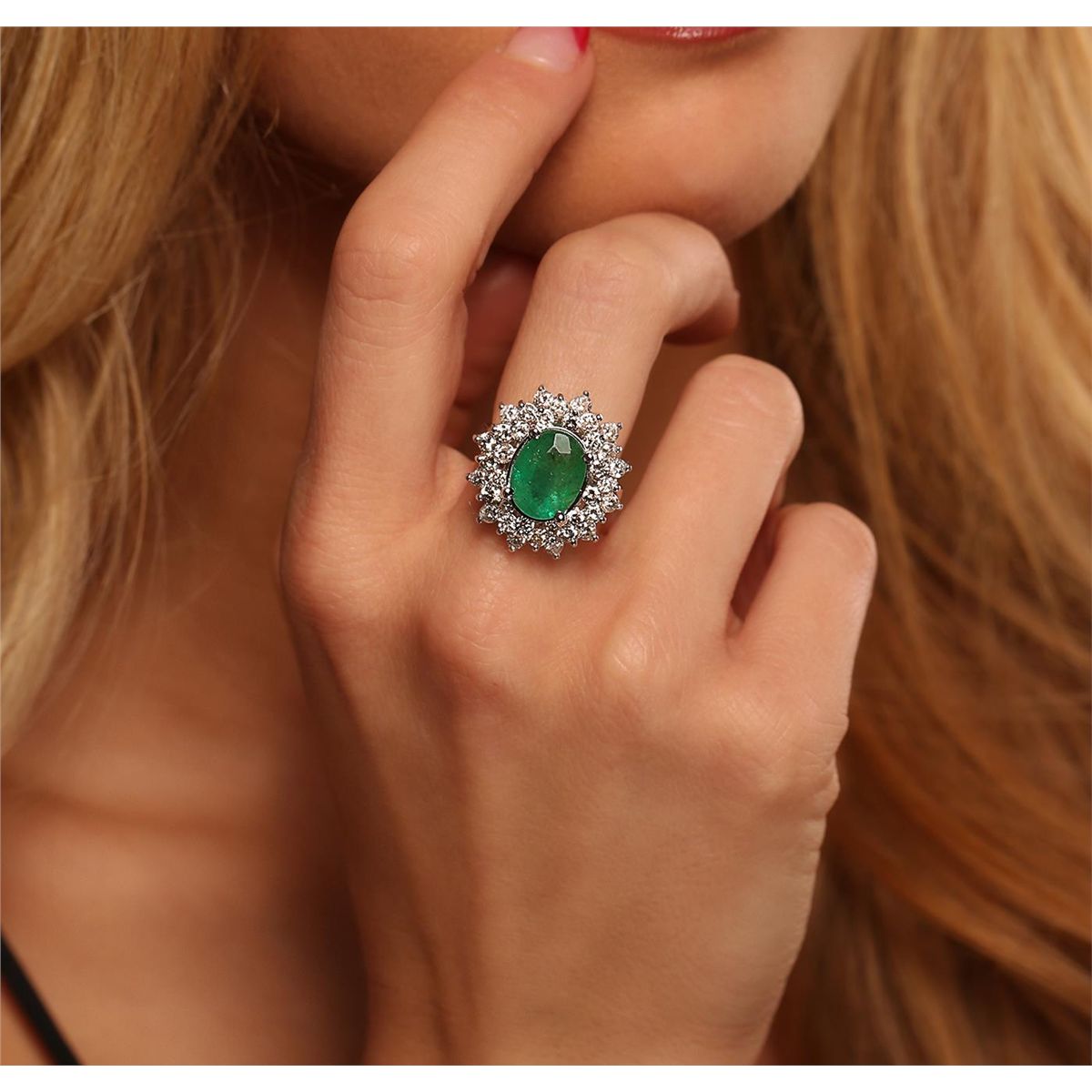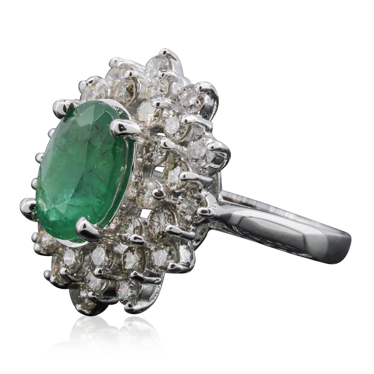 One electronically tested 14KT white gold Ladies combination cast & assembled fancy ring with a high polish finish. Condition is new. Identified with markings of "14K". Containing: One prong set oval modified brilliant cut natural emerald, measuring 11.30 x 8.80 x 5.50mm, approximate weight of 3.02ct., clarity is heavily included, type III, medium dark, moderately strong, green color, (GIA G 6/4), cut is good. Colored gemstones are presumed to have been subjected to commonly used and possible undetectable color/clarity enhancement processes. Thirty-Six prong set round brilliant cut diamonds, measuring 2.50 - 2.00 x 1.49mm (depth est.) approximate total weight of 36 Stones = 1.88ct. Clarity of SI-2 to I-2, Color of J - K, Cut is Good. Total Weight of Colored Stones 3.02ct. Total Weight of Diamonds 1.88ct. Total Weight of Ring 7.90 grams. GGL Appraised at $11,640.00.