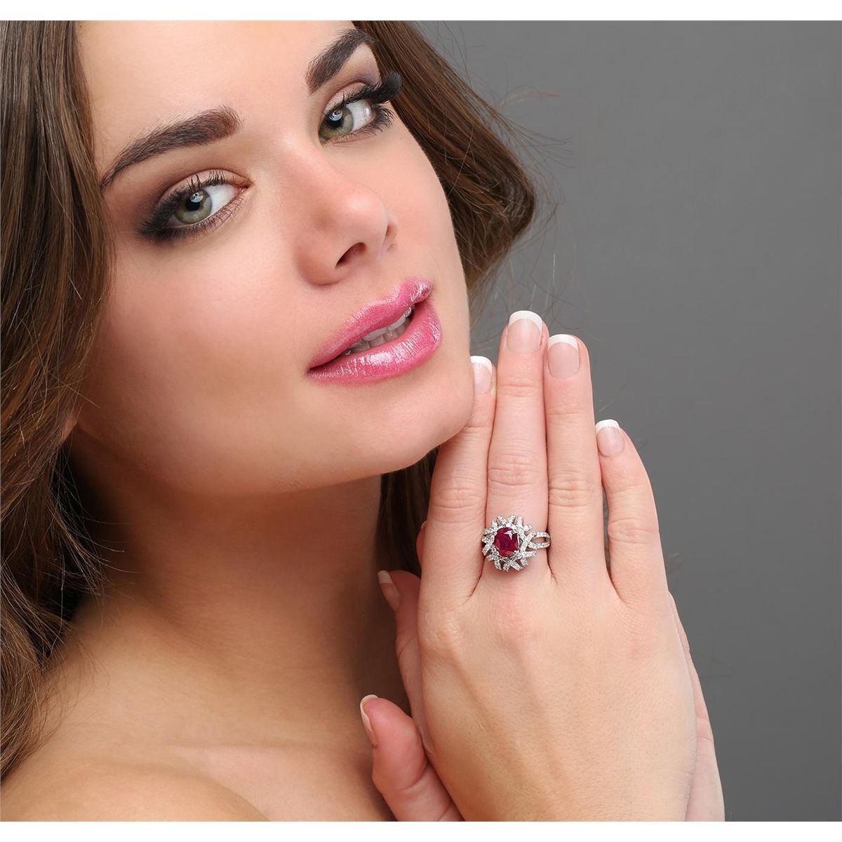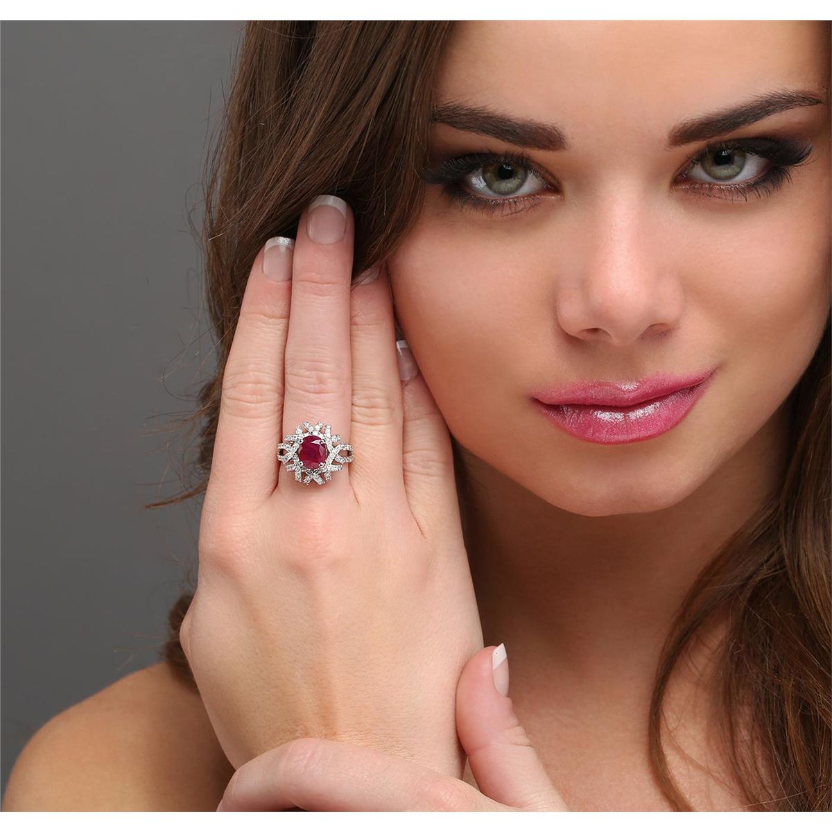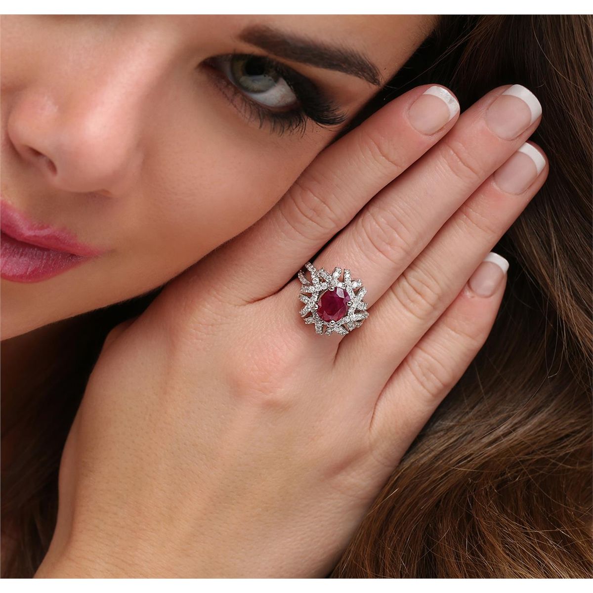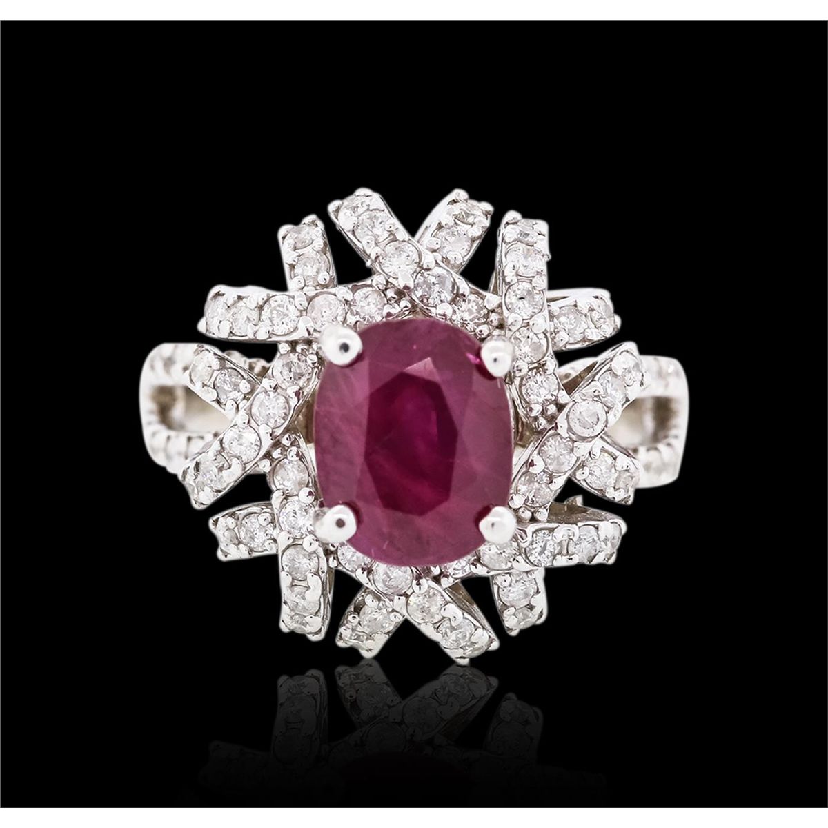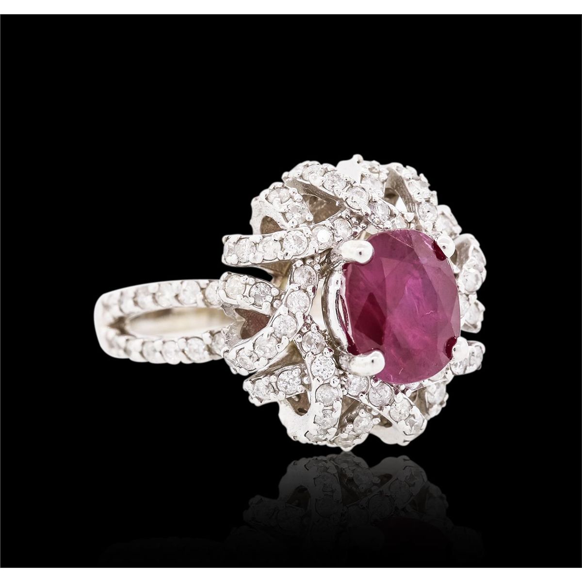 One electronically tested 14KT white gold ladies cast ruby and diamond ring with a bright polish finish. The featured ruby is set within intertwining diamond ribbons supported by diamond set split shoulders, completed by a three millimeter wide band. Identified with markings of "14K". Condition is new, good workmanship. Containing: One prong set oval mixed cut natural ruby, measuring 8.80 x 7.00 x 5.60mm, 8% bulge factor, approximate weight of 3.02ct., clarity is heavily included, type II, dark, very slightly brownish, red color, (GIA R 7/3), cut is good. Transmitting light somewhat diffusely, transparent to translucent. Naturally occurring internal& external characteristics are present. Indications of laboratory high temperature heat treatment, with flux additives. Graded in the setting. Ruby has a low tolerance to rhodium plating, repolishing the surface, & ultrasonic cleaning. One Hundred Twelve prong set round brilliant cut diamonds, measuring 1.50 - 1.40 x 0.87mm (depth est.) approximate total weight of 112 Stones = 1.34ct. Graded in the setting. Clarity I-1 to I-2. Color G - I. Total Weight of Colored Stones 3.02ct. Total Weight of Diamonds 1.34ct. Total Weight of Ring 8.35 grams. AIG Appraised at $5,660.00.