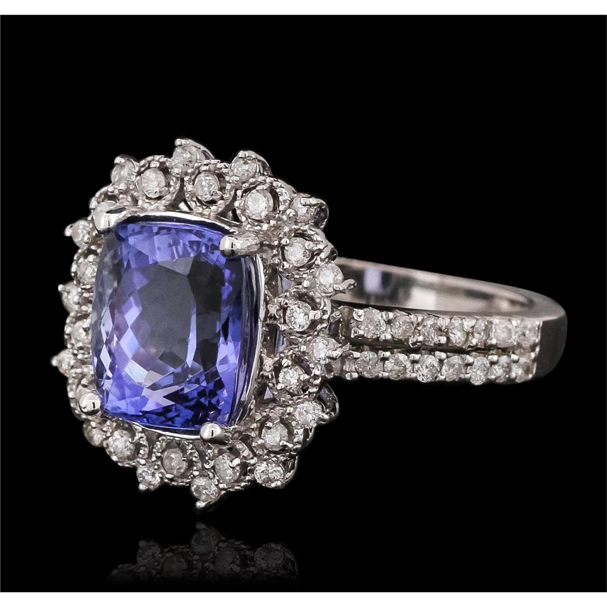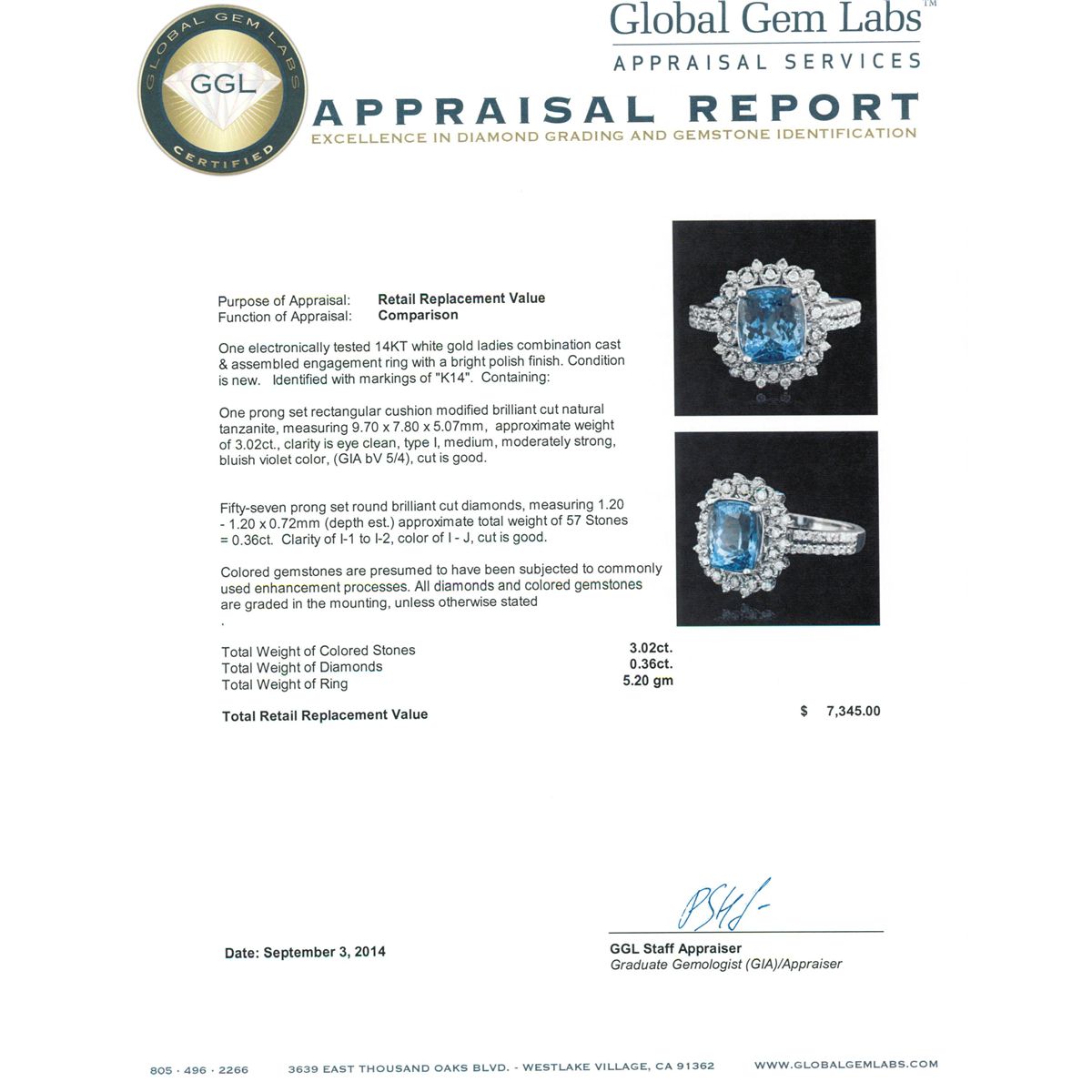 One electronically tested 14KT white gold ladies combination cast & assembled engagement ring with a bright polish finish. Identified with markings of "K14". Condition is new. Containing: One prong set rectangular cushion modified brilliant cut natural tanzanite, measuring 9.70 x 7.80 x 5.07mm, approximate weight of 3.02ct., clarity is eye clean, type I, medium, moderately strong, bluish violet color, (GIA bV 5/4), cut is good. Fifty-Seven prong set round brilliant cut diamonds, measuring 1.20 - 1.20 x 0.72mm (depth est.) approximate total weight of 57 Stones = 0.36ct. Clarity: I-1 to I-2. Color: I - J, Cut is Good. Colored gemstones are presumed to have been subjected to commonly used enhancement processes. All diamonds and colored gemstones are graded in the mounting, unless otherwise stated. Total Weight of Colored Stones 3.02ct. Total Weight of Diamonds 0.36ct. Total Weight of Ring 5.20 grams. GGL Appraised at $7,345.00.