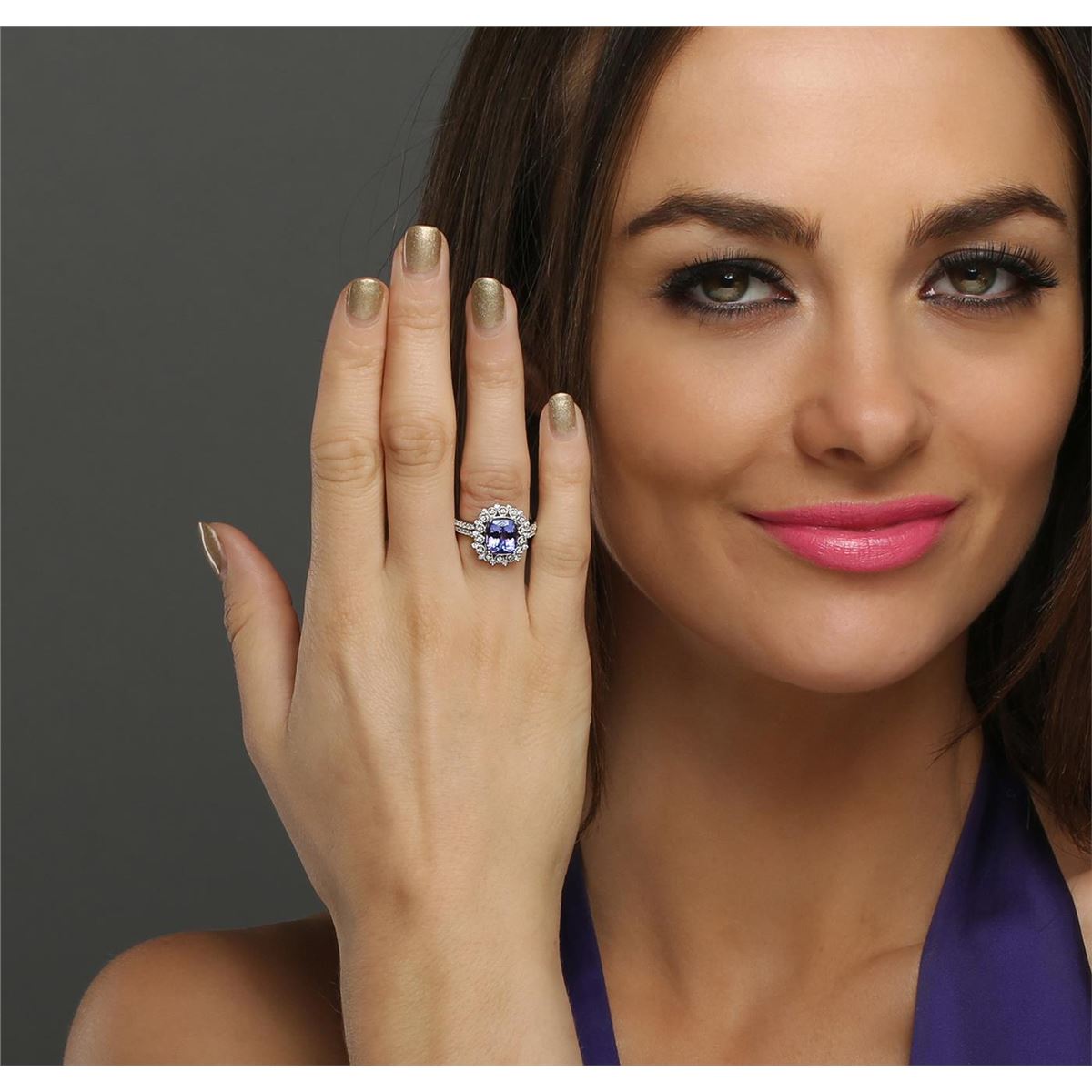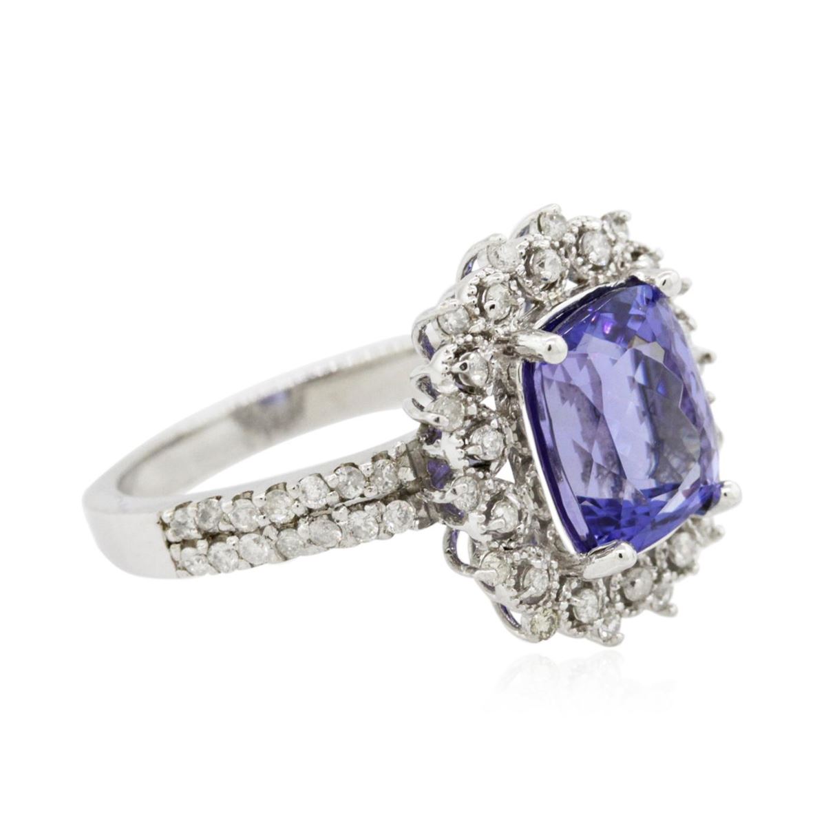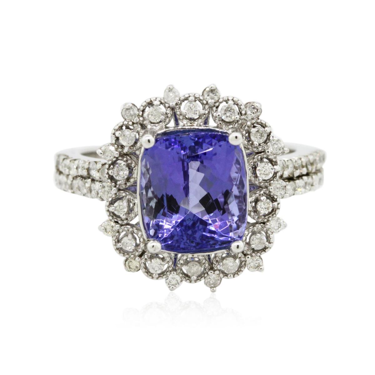 One electronically tested 14KT white gold ladies combination cast & assembled engagement ring with a bright polish finish. Identified with markings of "K14". Condition is new. Containing: One prong set rectangular cushion modified brilliant cut natural tanzanite, measuring 9.70 x 7.80 x 5.07mm, approximate weight of 3.02ct., clarity is eye clean, type I, medium, moderately strong, bluish violet color, (GIA bV 5/4), cut is good. Fifty-Seven prong set round brilliant cut diamonds, measuring 1.20 - 1.20 x 0.72mm (depth est.) approximate total weight of 57 Stones = 0.36ct. Clarity: I-1 to I-2. Color: I - J, Cut is Good. Colored gemstones are presumed to have been subjected to commonly used enhancement processes. All diamonds and colored gemstones are graded in the mounting, unless otherwise stated. Total Weight of Colored Stones 3.02ct. Total Weight of Diamonds 0.36ct. Total Weight of Ring 5.20 grams. GGL Appraised at $7,345.00.