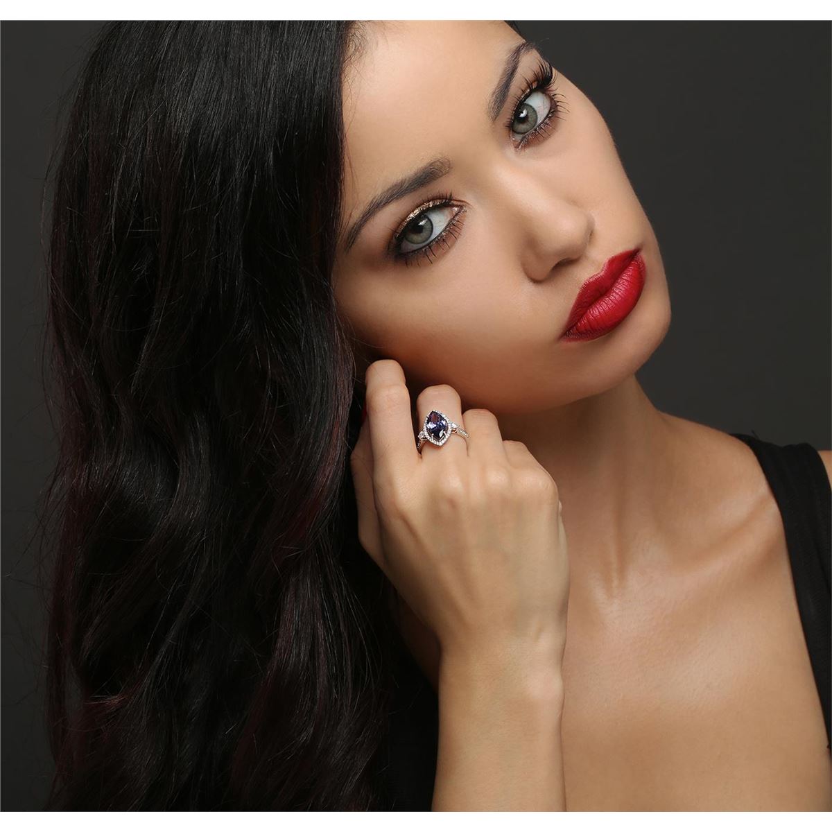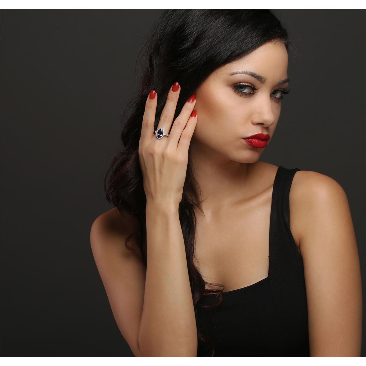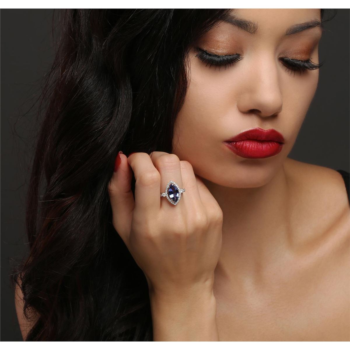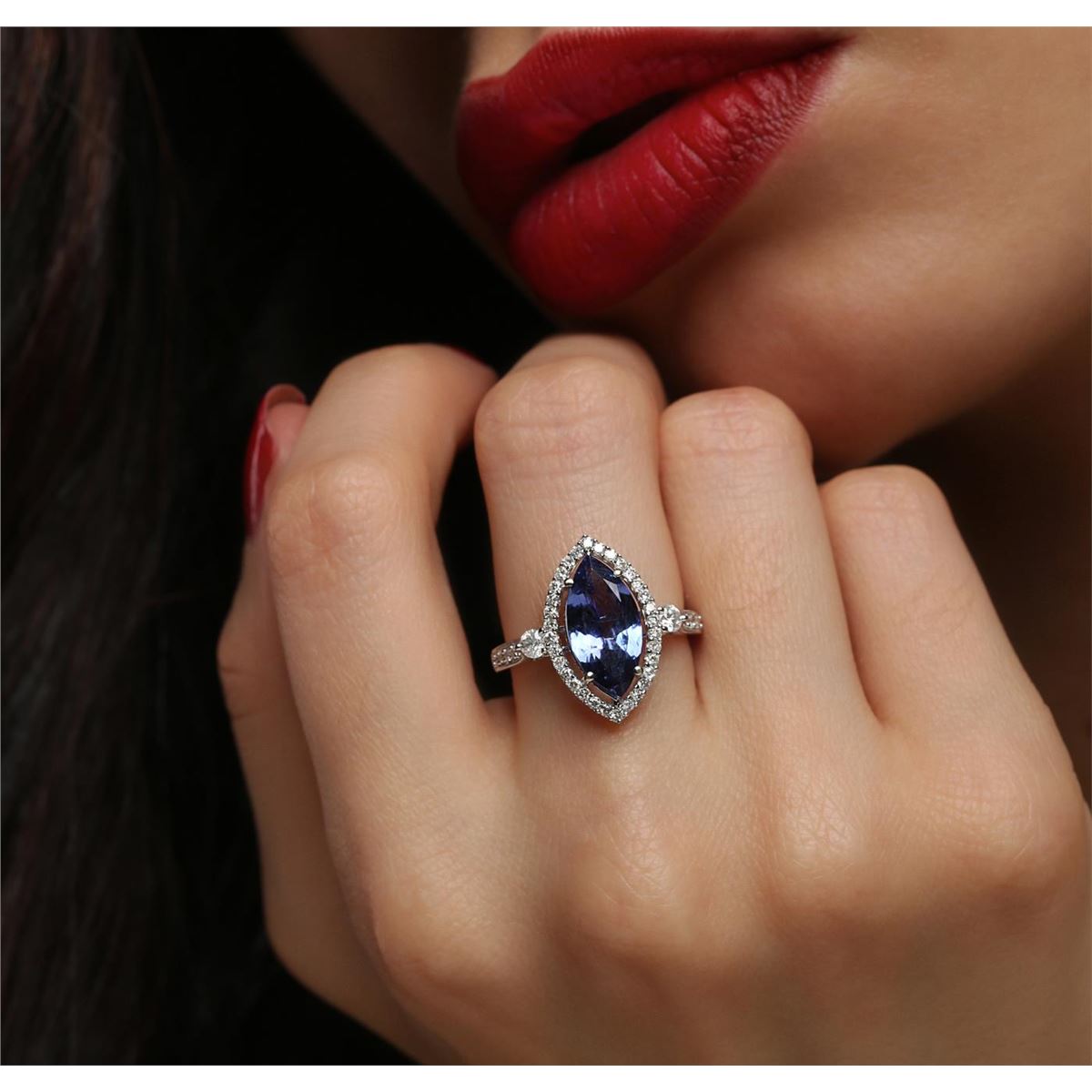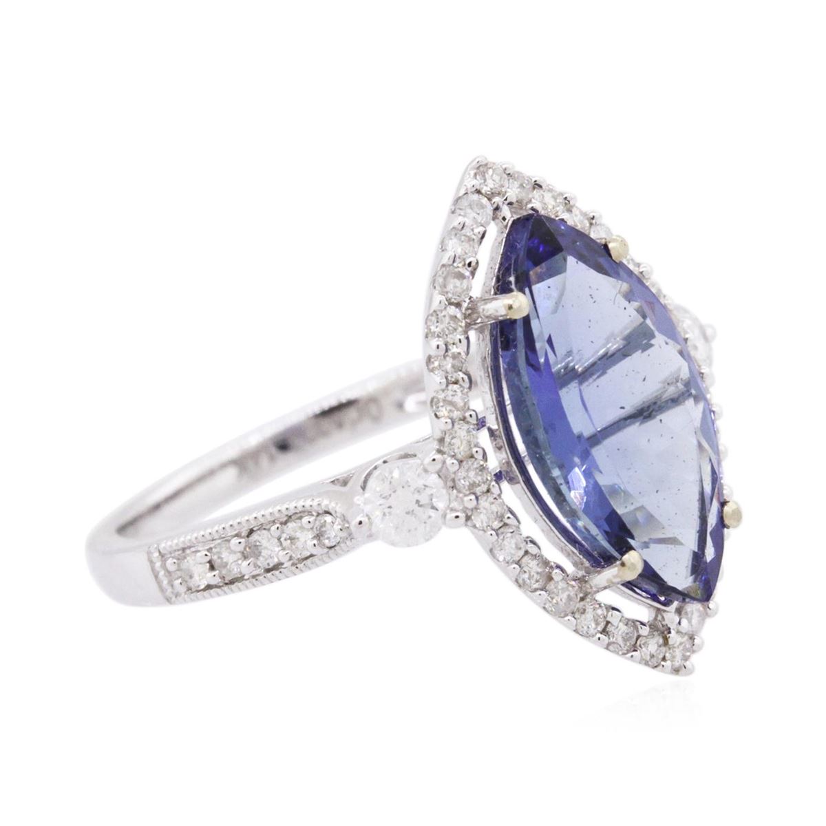 One electronically tested 14KT white gold ladies cast tanzanite and diamond ring. The featured tanzanite is set within a diamond bezel supported by diamond set shoulders, completed by a one and one-half millimeter wide band. Bright polish finish with milgrain detailing. Trademark is Orianne. Identified with markings of "14K". Condition is new, good workmanship. Containing: One prong set marquise brilliant cut natural tanzanite, measuring 14.00 x 7.10 x 4.50mm, 6% bulge factor, approximate weight of 3.02ct., clarity is eye clean, type I, medium dark, slightly grayish, bluish violet color, (GIA bV 6/2), cut is good. Transmitting light with no distortion, transparent. Graded in the setting. Tanzanite is a very rare gemstone that is only found in the country of Tanzania. Originally discovered in 1967. Tiffany & Company, named the stone Tanzanite. It is found in the Usumburu Mountains that border the Umba Valley of northern Tanzania. Tanzanite occurs in gray, brown, violet, blue, reddish-purple, & green. The gem is interesting because of its exceptional pleochroism. Rotated in different directions a tanzanite will exhibit multiple changes of color. Tanzanite has a low tolerance to ultrasonic cleaning, and should not be cleaned using this method. Forty-Four prong set round brilliant cut diamonds, measuring 2.70 - 1.20 x 1.17mm (depth est.) approximate total weight of 44 Stones = 0.54ct. Graded in the setting. Clarity: I-1 to I-2. Color: G - I. Total Weight of Colored Stones 3.02ct. Total Weight of Diamonds 0.54ct. Total Weight of Ring 3.13 grams. AIG Appraised at $7,700.00.