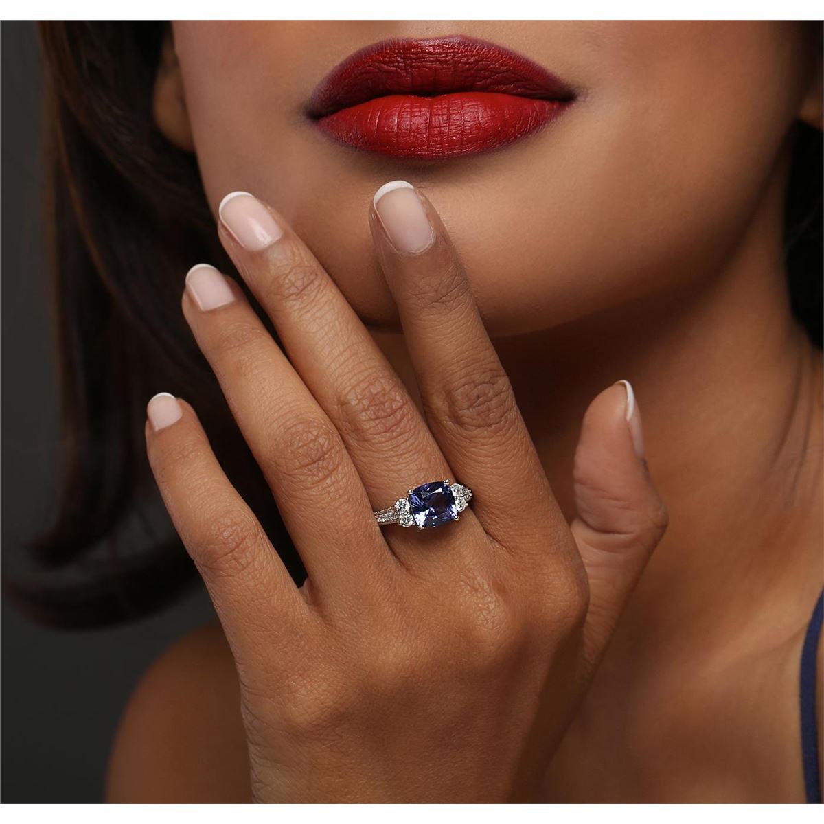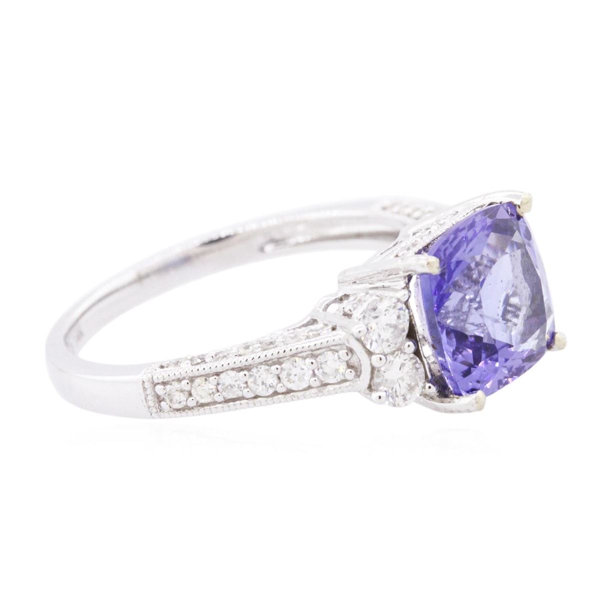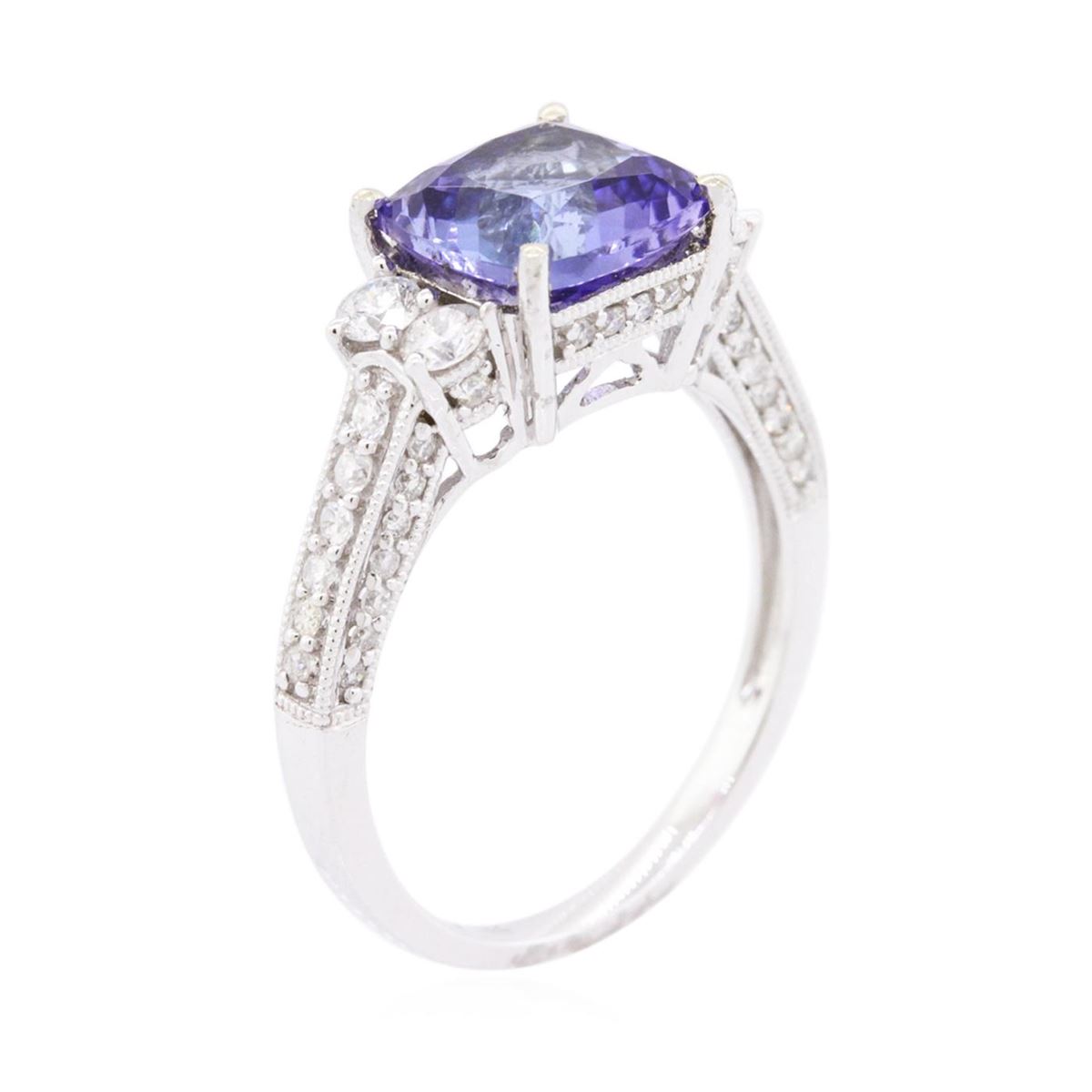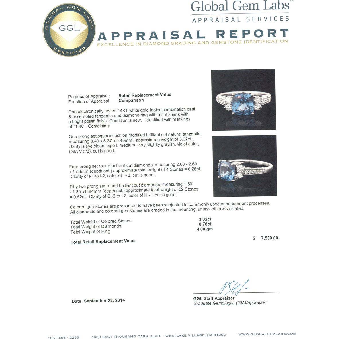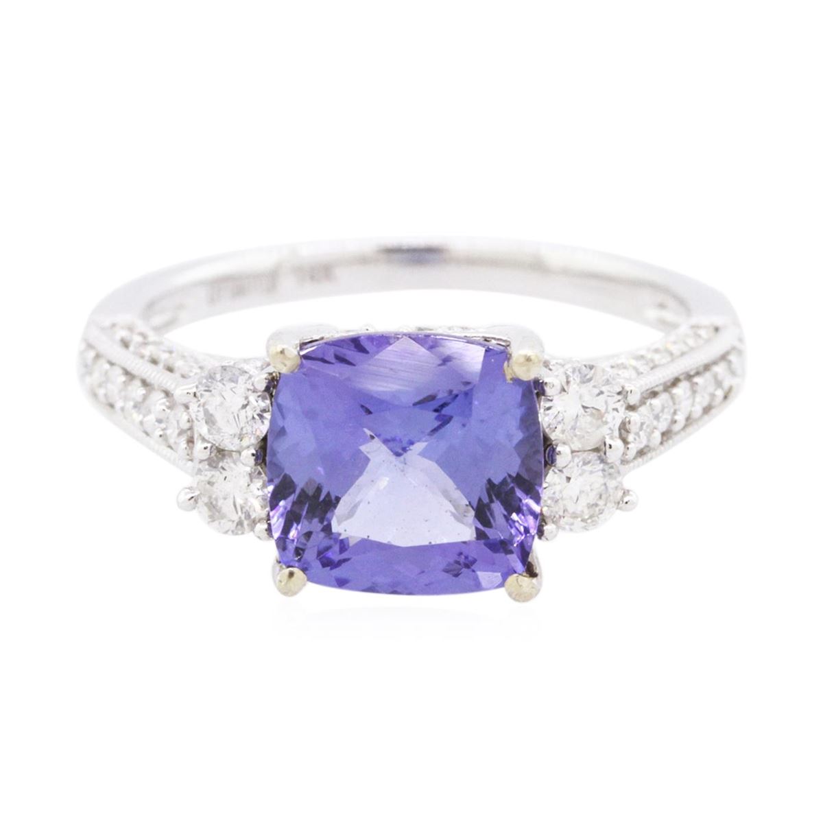 One electronically tested 14KT white gold ladies combination cast & assembled tanzanite and diamond ring with a flat shank with a bright polish finish. Identified with markings of "14K". Condition is new. Containing: One prong set square cushion modified brilliant cut natural tanzanite, measuring 8.40 x 8.37 x 5.45mm, approximate weight of 3.02ct., clarity is eye clean, type I, medium, very slightly grayish, violet color, (GIA V 5/3), cut is good. Four prong set round brilliant cut diamonds, measuring 2.60 - 2.60 x 1.56mm (depth est.) approximate total weight of 4 Stones = 0.26ct. Clarity: I-1 to I-2. Color: I - J, Cut is Good. Fifty-Two prong set round brilliant cut diamonds, measuring 1.50 - 1.30 x 0.84mm (depth est.) approximate total weight of 52 Stones = 0.52ct. Clarity: SI-2 to I-2. Color: H - I, Cut is Good. Colored gemstones are presumed to have been subjected to commonly used enhancement processes. All diamonds and colored gemstones are graded in the mounting, unless otherwise stated. Total Weight of Colored Stones 3.02ct. Total Weight of Diamonds 0.78ct. Total Weight of Ring 4.00 grams. GGL Appraised at $7,530.00.