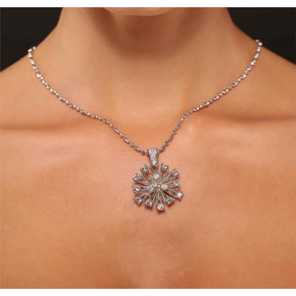 One electronically tested 14KT white gold ladies cast & assembled diamond floral pendant with chain. The pendant features a cascading bouquet of diamonds completed by a diamond set bail. The pendant is supported by an elaborate eighteen inch length designer style bright cut beaded chain terminating in a lobster claw clasp. Bright polish finish. Identified with markings of "585". Condition is good. Containing: Fifteen prong set round brilliant cut diamonds, measuring 3.70 - 3.60 x 2.19mm (depth est.) approximate. Total Weight of 15 Stones = 2.77ct. Faint brown secondary color throughout. Graded in the setting. Clarity: I-1 to I-2. Color: H - J Sixteen bead set round brilliant cut diamonds, measuring 1.60 - 1.40 x 0.90mm (depth est.) approximate. Total Weight of 16 Stones = 0.25ct. Graded in the setting. Clarity: SI-2 to I-2. Color: H - J. Total Weight of Diamonds 3.02ct. AIG Appraised at $11,015.00.