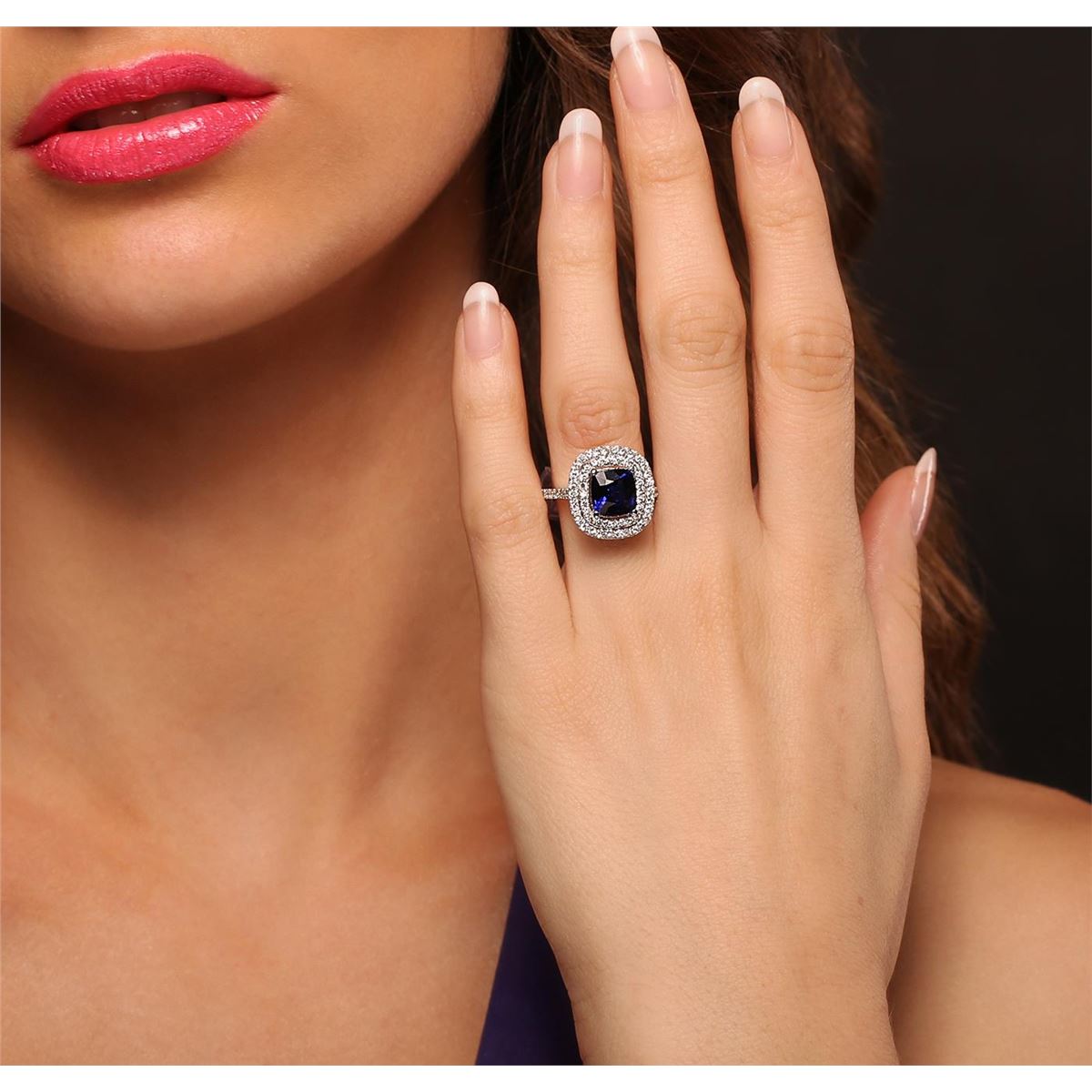 One electronically tested 14KT White Gold ladies cast sapphire and diamond ring with a bright polish finish. Condition is new, good workmanship. The featured sapphire is set within two tiered diamond bezels supported by diamond set shoulders, completed by a two millimeter wide band. Identified with markings of "14K". Containing: One prong set square cushion mixed cut natural blue sapphire, measuring 7.80 x 7.80 x 4.81mm, 10%. bulge factor, approximate weight of 3.03ct., clarity is eye clean, type II, dark, moderately strong, blue color, (GIA B 7/4), cut is good. Transmitting light with no distortion, transparent. Indications of laboratory high temperature diffusion treatment. Graded in the setting. Sixty-Eight prong set round brilliant cut diamonds, measuring 1.50 - 1.30 x 0.84mm (depth est.) approximate. Total Weight of 68 Stones = 0.78ct. Graded in the setting. Clarity: SI-1 to I-1. Color: H - J. Total Weight of Colored Stones 3.03ct. Total Weight of Diamonds 0.78ct. Total Weight of Ring 5.66 AIG Appraised at $4,510.00.