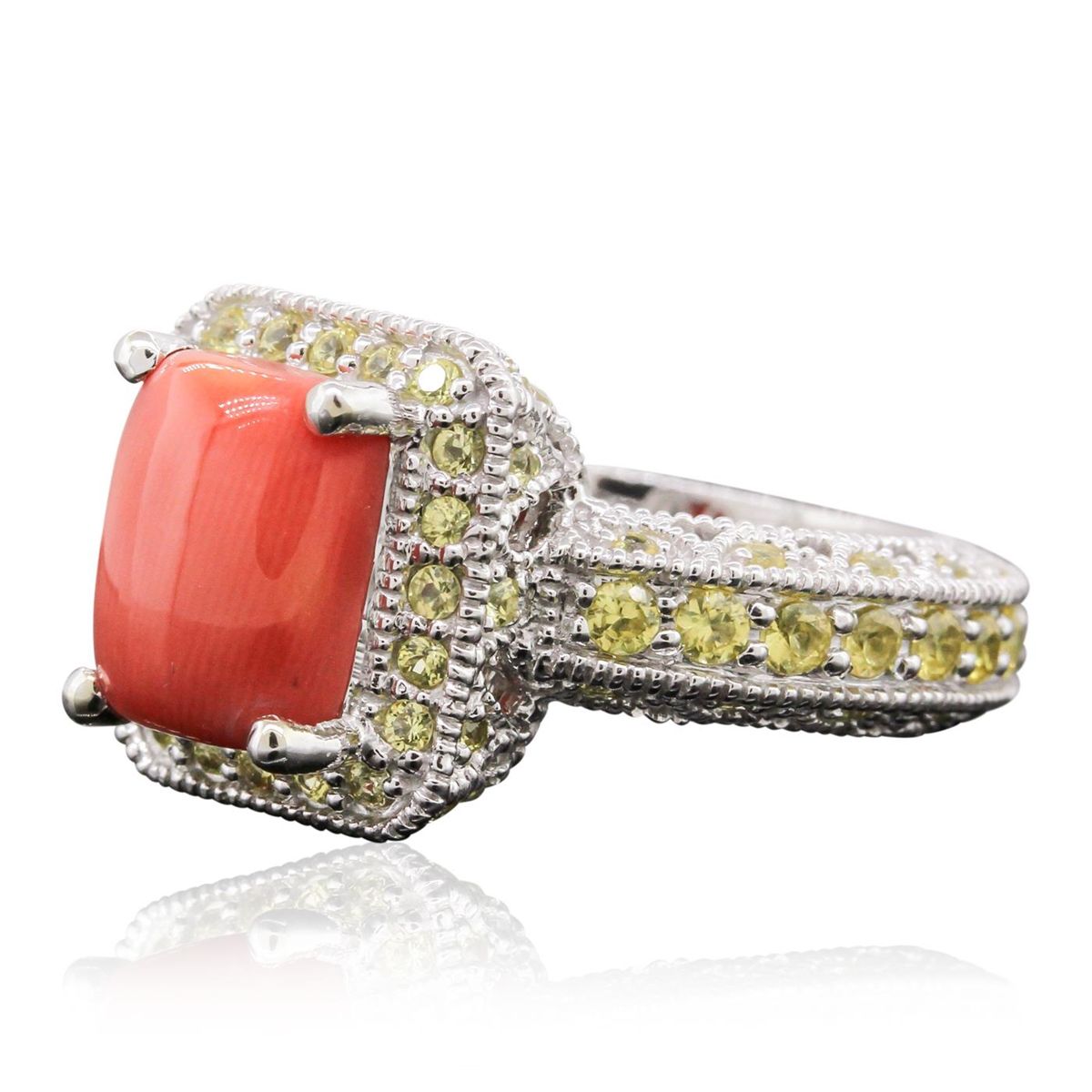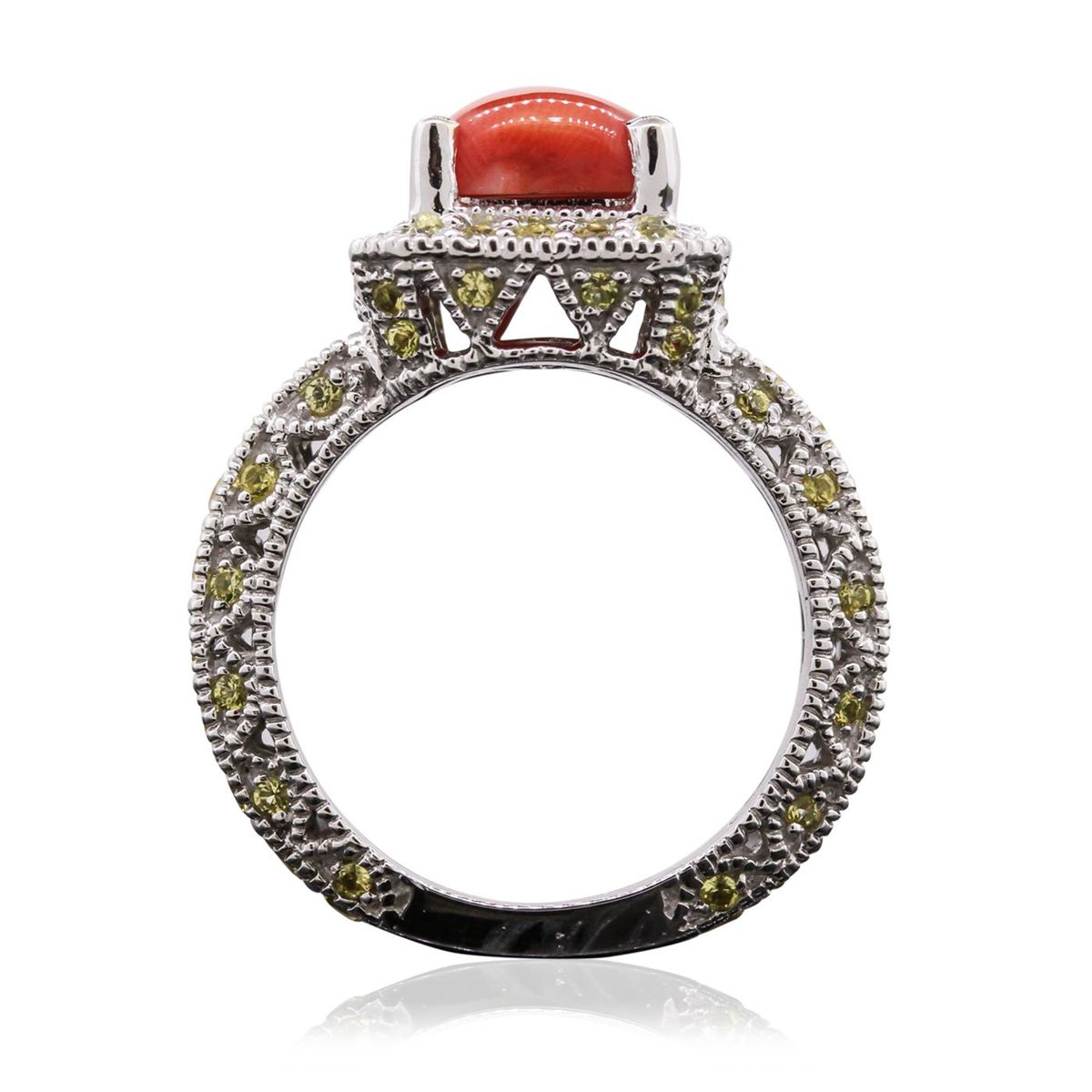 One electronically tested 14KT white gold Ladies combination cast & assembled ring with a antiqued finish. Condition is new. Identified with markings of "14K". Containing: One prong set rectangular cabochon cut natural pink coral, measuring 10.06 x 8.04 x 5.23mm, approximate weight of 3.03ct., clarity is heavily included, medium, very slightly brownish, reddish orange color, (GIA rO 5/3), cut is very good. Eighty prong set round modified brilliant cut natural yellow sapphires, measuring 2.00 - 1.50 x 1.14 mm, approximate. Total Weight of 3.20ct., clarity is eye clean, type II, medium light, moderately strong, yellow color, (GIA Y 4/4), cut is good. Colored gemstones are presumed to have been subjected to commonly used color/clarity enhancement processes. Total Weight of Colored Stones 6.23ct. Total Weight of Ring 9.90 grams. GGL Appraised at $5,330.00.