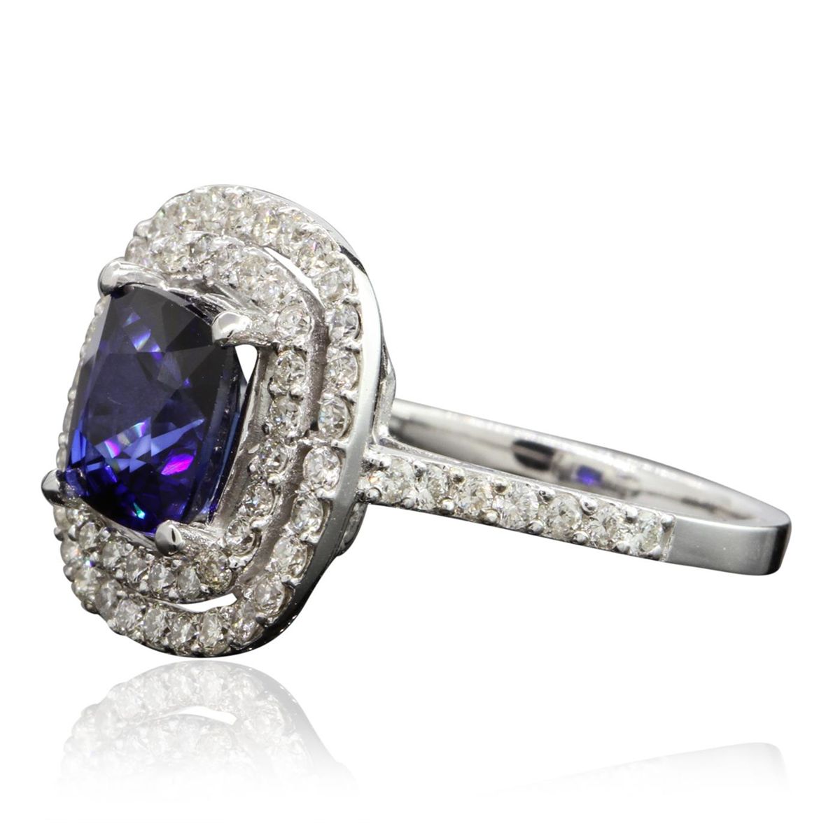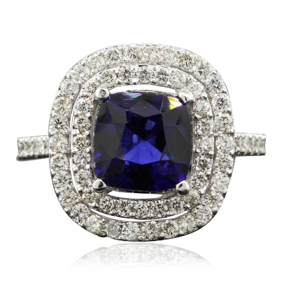One electronically tested 14KT White Gold ladies cast sapphire and diamond ring with a bright polish finish. Condition is new, good workmanship. The featured sapphire is set within two tiered diamond bezels supported by diamond set shoulders, completed by a two millimeter wide band. Identified with markings of "14K". Containing: One prong set square cushion mixed cut natural blue sapphire, measuring 7.80 x 7.80 x 4.81mm, 10%. bulge factor, approximate weight of 3.03ct., clarity is eye clean, type II, dark, moderately strong, blue color, (GIA B 7/4), cut is good. Transmitting light with no distortion, transparent. Indications of laboratory high temperature diffusion treatment. Graded in the setting. Sixty-Eight prong set round brilliant cut diamonds, measuring 1.50 - 1.30 x 0.84mm (depth est.) approximate. Total Weight of 68 Stones = 0.78ct. Graded in the setting. Clarity: SI-1 to I-1. Color: H - J. Total Weight of Colored Stones 3.03ct. Total Weight of Diamonds 0.78ct. Total Weight of Ring 5.66 AIG Appraised at $4,510.00.