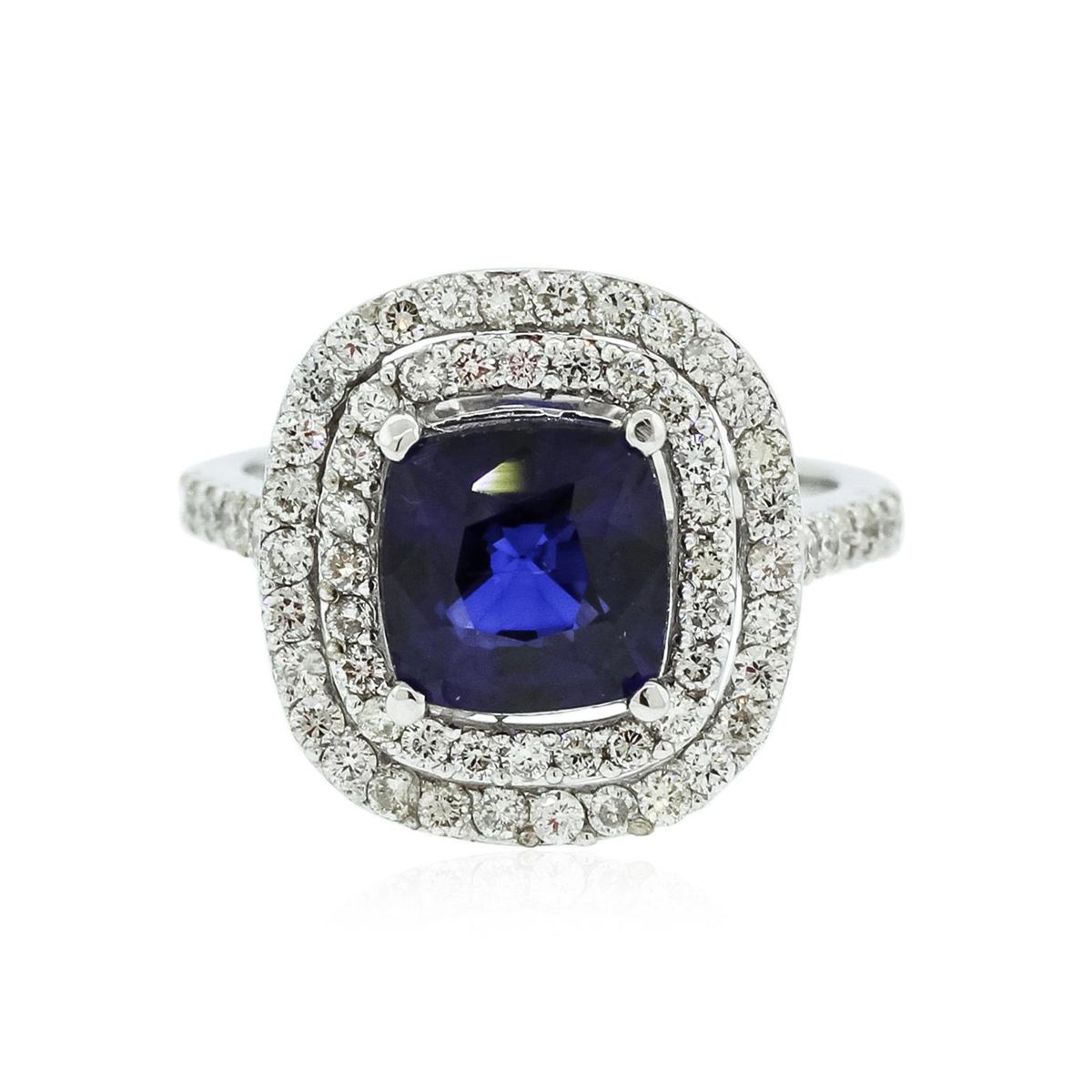 One electronically tested 14KT White Gold ladies cast sapphire and diamond ring with a bright polish finish. Condition is new, good workmanship. The featured sapphire is set within two tiered diamond bezels supported by diamond set shoulders, completed by a two millimeter wide band. Identified with markings of "14K". Containing: One prong set square cushion mixed cut natural blue sapphire, measuring 7.80 x 7.80 x 4.81mm, 10%. bulge factor, approximate weight of 3.03ct., clarity is eye clean, type II, dark, moderately strong, blue color, (GIA B 7/4), cut is good. Transmitting light with no distortion, transparent. Indications of laboratory high temperature diffusion treatment. Graded in the setting. Sixty-Eight prong set round brilliant cut diamonds, measuring 1.50 - 1.30 x 0.84mm (depth est.) approximate. Total Weight of 68 Stones = 0.78ct. Graded in the setting. Clarity: SI-1 to I-1. Color: H - J. Total Weight of Colored Stones 3.03ct. Total Weight of Diamonds 0.78ct. Total Weight of Ring 5.66 AIG Appraised at $4,510.00.