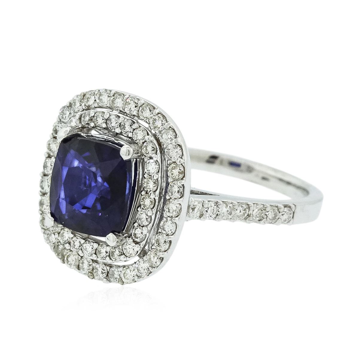 One electronically tested 14KT White Gold ladies cast sapphire and diamond ring with a bright polish finish. Condition is new, good workmanship. The featured sapphire is set within two tiered diamond bezels supported by diamond set shoulders, completed by a two millimeter wide band. Identified with markings of "14K". Containing: One prong set square cushion mixed cut natural blue sapphire, measuring 7.80 x 7.80 x 4.81mm, 10%. bulge factor, approximate weight of 3.03ct., clarity is eye clean, type II, dark, moderately strong, blue color, (GIA B 7/4), cut is good. Transmitting light with no distortion, transparent. Indications of laboratory high temperature diffusion treatment. Graded in the setting. Sixty-Eight prong set round brilliant cut diamonds, measuring 1.50 - 1.30 x 0.84mm (depth est.) approximate. Total Weight of 68 Stones = 0.78ct. Graded in the setting. Clarity: SI-1 to I-1. Color: H - J. Total Weight of Colored Stones 3.03ct. Total Weight of Diamonds 0.78ct. Total Weight of Ring 5.66 AIG Appraised at $4,510.00.