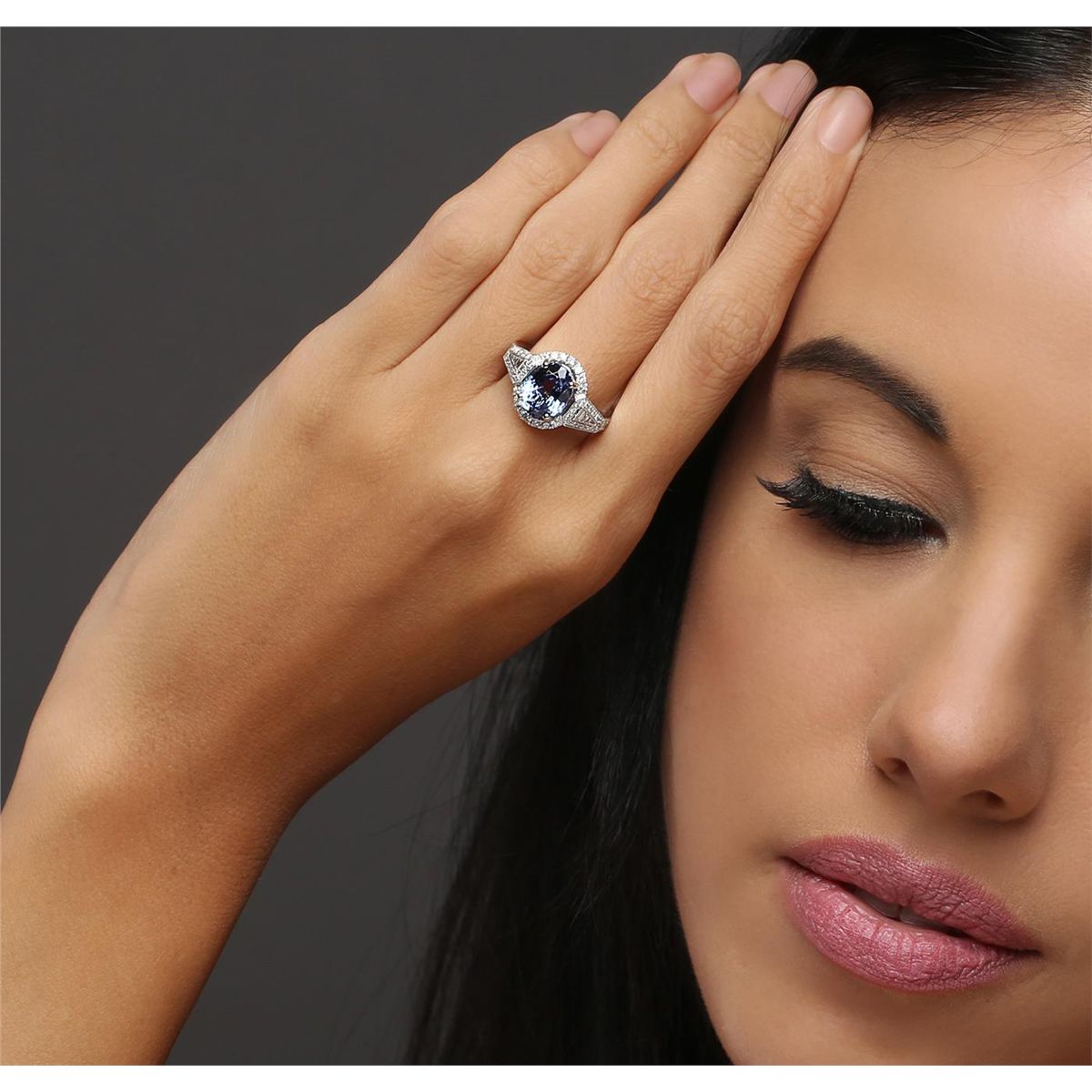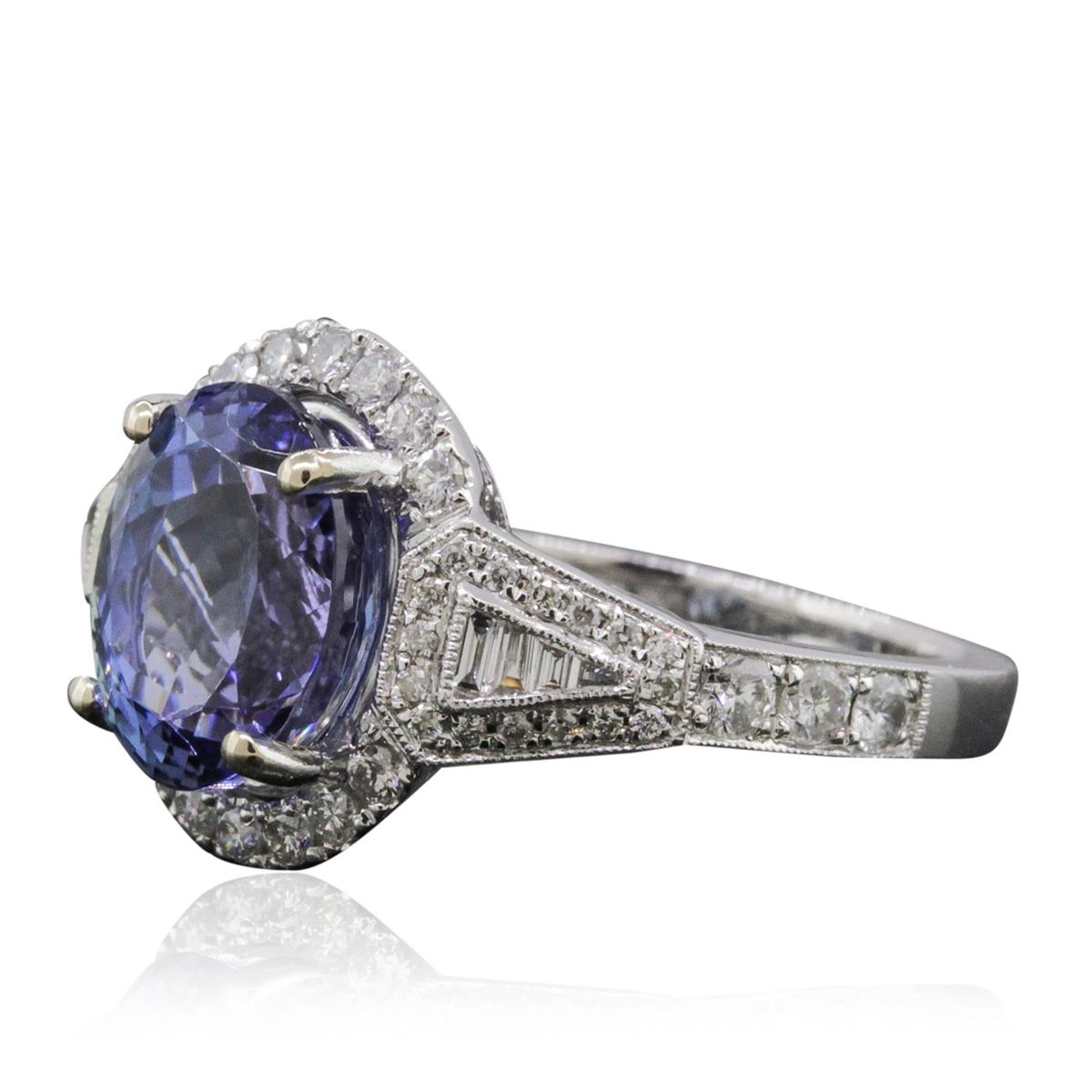 One electronically tested 14KT white gold ladies combination cast & assembled tanzanite and diamond ring with a flat shank with a bright polish finish. Identified with markings of "14K". Condition is new. Containing: One prong set oval modified brilliant cut natural tanzanite, measuring 10.16 x 8.25 x 5.33mm, approximate weight of 3.03ct., clarity is eye clean, type I, medium light, very slightly grayish, violet color, (GIA V 4/3), cut is good. Twenty prong set round brilliant cut diamonds, measuring 2.10 - 1.50 x 1.08mm (depth est.) approximate total weight of 20 Stones = 0.43ct. Clarity: SI-2 to I-1. Color: I - J, Cut is Good. Thirty prong set round brilliant cut diamonds, measuring 1.00 - 1.00 x 0.60mm (depth est.) approximate total weight of 30 Stones = 0.11ct. Clarity: SI-2 to I-1. Color: I - J, Cut is Good. Eight channel set baguette cut (tapered) diamonds, measuring from 1.10 x 1.10 x 0.94mm (depth est.) to 1.80 x 1.30 x 1.11mm (depth est.) approximate total weight of 8 Stones = 0.13ct. Clarity: VS-1 to VS-2. Color: I - J, Cut is Good. Colored gemstones are presumed to have been subjected to commonly used enhancement processes. All diamonds and colored gemstones are graded in the mounting, unless otherwise stated. Total Weight of Colored Stones 3.03ct. Total Weight of Diamonds 0.66ct. Total Weight of Ring 5.80 grams. GGL Appraised at $8,315.00.