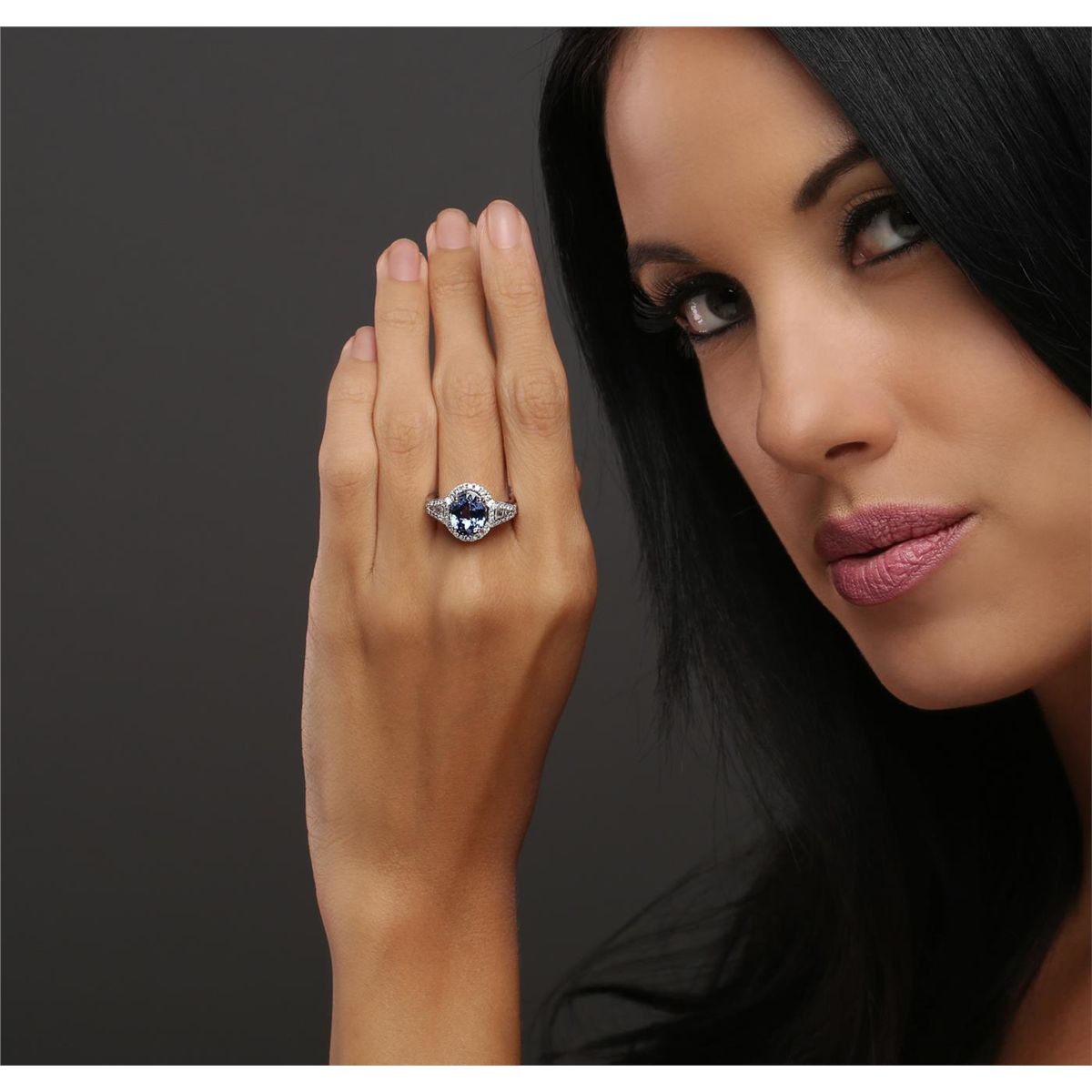 One electronically tested 14KT white gold ladies combination cast & assembled tanzanite and diamond ring with a flat shank with a bright polish finish. Identified with markings of "14K". Condition is new. Containing: One prong set oval modified brilliant cut natural tanzanite, measuring 10.16 x 8.25 x 5.33mm, approximate weight of 3.03ct., clarity is eye clean, type I, medium light, very slightly grayish, violet color, (GIA V 4/3), cut is good. Twenty prong set round brilliant cut diamonds, measuring 2.10 - 1.50 x 1.08mm (depth est.) approximate total weight of 20 Stones = 0.43ct. Clarity: SI-2 to I-1. Color: I - J, Cut is Good. Thirty prong set round brilliant cut diamonds, measuring 1.00 - 1.00 x 0.60mm (depth est.) approximate total weight of 30 Stones = 0.11ct. Clarity: SI-2 to I-1. Color: I - J, Cut is Good. Eight channel set baguette cut (tapered) diamonds, measuring from 1.10 x 1.10 x 0.94mm (depth est.) to 1.80 x 1.30 x 1.11mm (depth est.) approximate total weight of 8 Stones = 0.13ct. Clarity: VS-1 to VS-2. Color: I - J, Cut is Good. Colored gemstones are presumed to have been subjected to commonly used enhancement processes. All diamonds and colored gemstones are graded in the mounting, unless otherwise stated. Total Weight of Colored Stones 3.03ct. Total Weight of Diamonds 0.66ct. Total Weight of Ring 5.80 grams. GGL Appraised at $8,315.00.