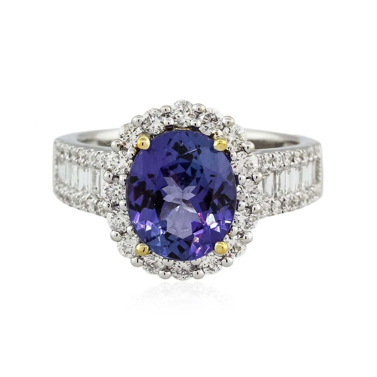 One electronically tested 14KT white gold Ladies combination cast & assembled ring with a high polish finish. Condition is new. Identified with markings of "14K". Containing: One prong set oval modified mixed cut natural tanzanite, measuring 10.00 x 8.00 x 5.20mm, approximate weight of 3.03ct., clarity is eye clean, type I, medium, moderately strong, bluish violet color, (GIA bV 5/4), cut is good. Colored gemstones are presumed to have been subjected to commonly used color/clarity enhancement processes. Fifty-Six bead set round brilliant cut diamonds, measuring 1.40 - 1.00 x 0.72mm (depth est.) approximate. Total Weight of 56 Stones = 0.42ct. Clarity: I-1 to I-2. Color: H - I, Cut is Good. Sixteen invisible set princess cut diamonds, measuring 2.00 x 1.90 x 1.43mm (depth est.) approximate. Total Weight of 16 Stones = 0.82ct. Clarity: SI-1 to I-1. Color: G - H, Cut is Good. Total Weight of Colored Stones 3.03ct. Total Weight of Diamonds 1.24ct. Total Weight of Ring 6.10 grams. GGL Appraised at $7,140.00.