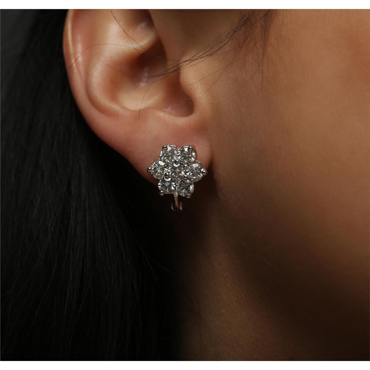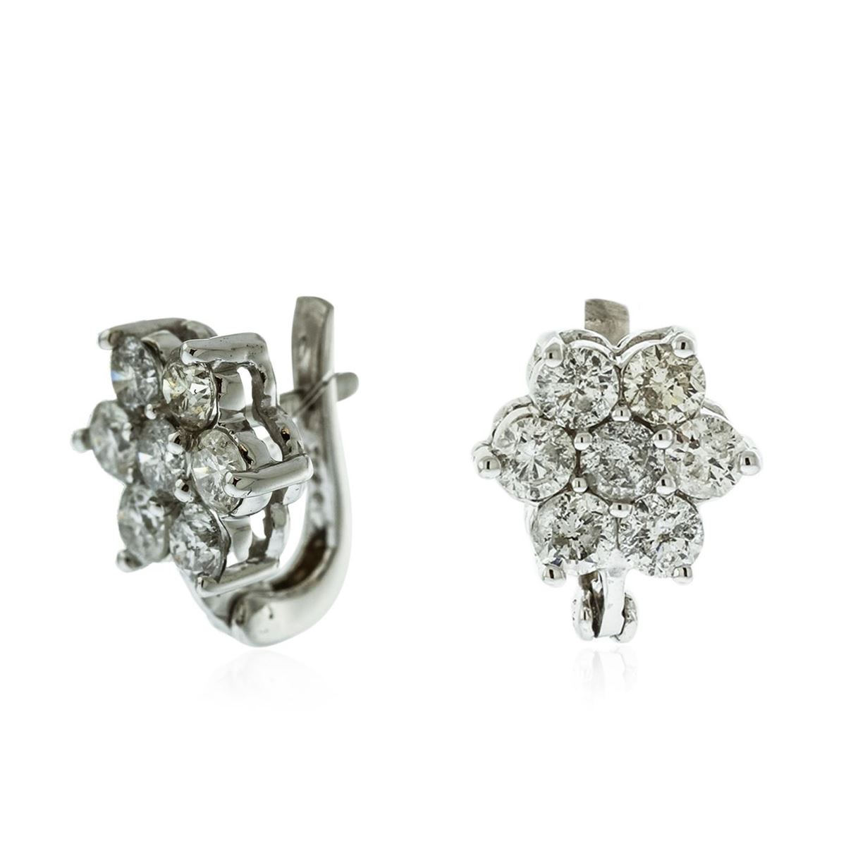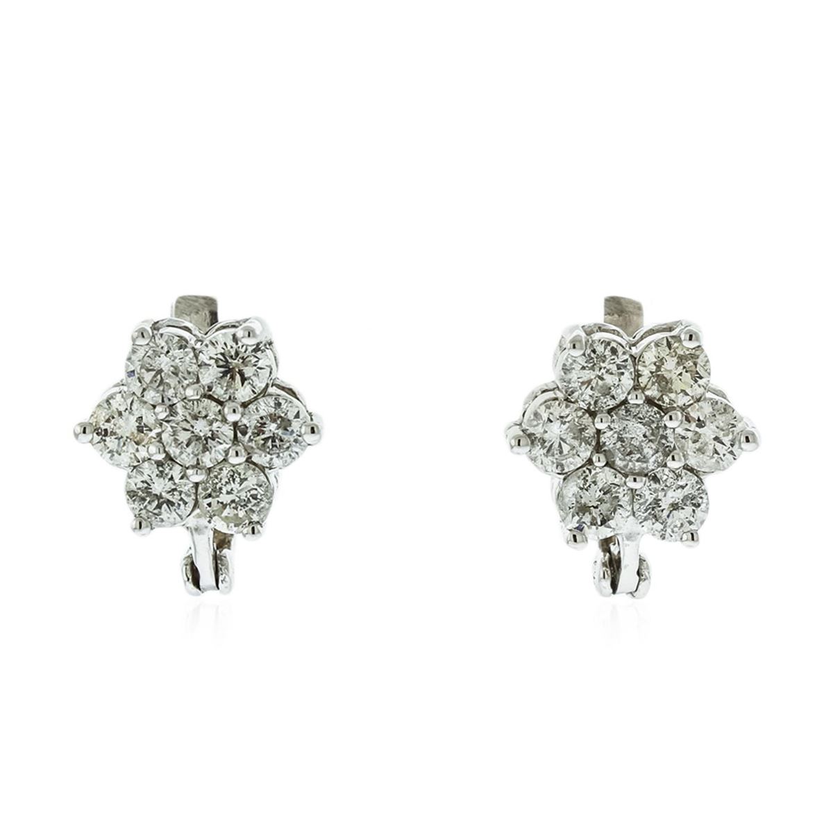 One pair electronically tested 14KT white gold ladies combination cast & assembled earrings with clip backs with a bright polish finish. Identified with markings of "14K". Condition is new. Containing: Fourteen prong set round brilliant cut diamonds, measuring 3.90 - 3.90 x 2.34mm (depth est.) approximate total weight of 14 Stones = 3.04ct. Clarity: I-1 to I-2. Color: I - J, Cut is Good. All diamonds are graded in the mounting, unless otherwise stated. Total Weight of Diamonds 3.04ct. Total Weight of Earrings 6.10 grams. GGL Appraised at $8,720.00.